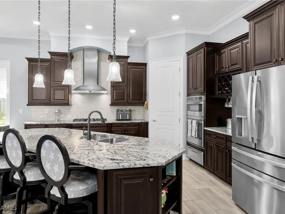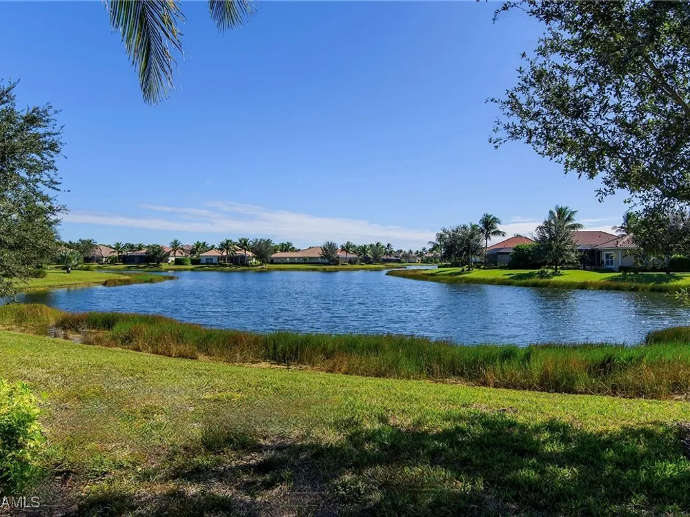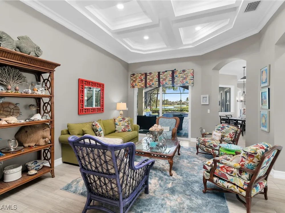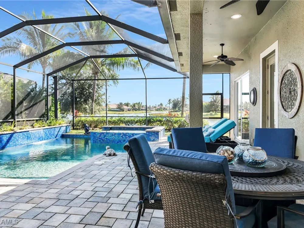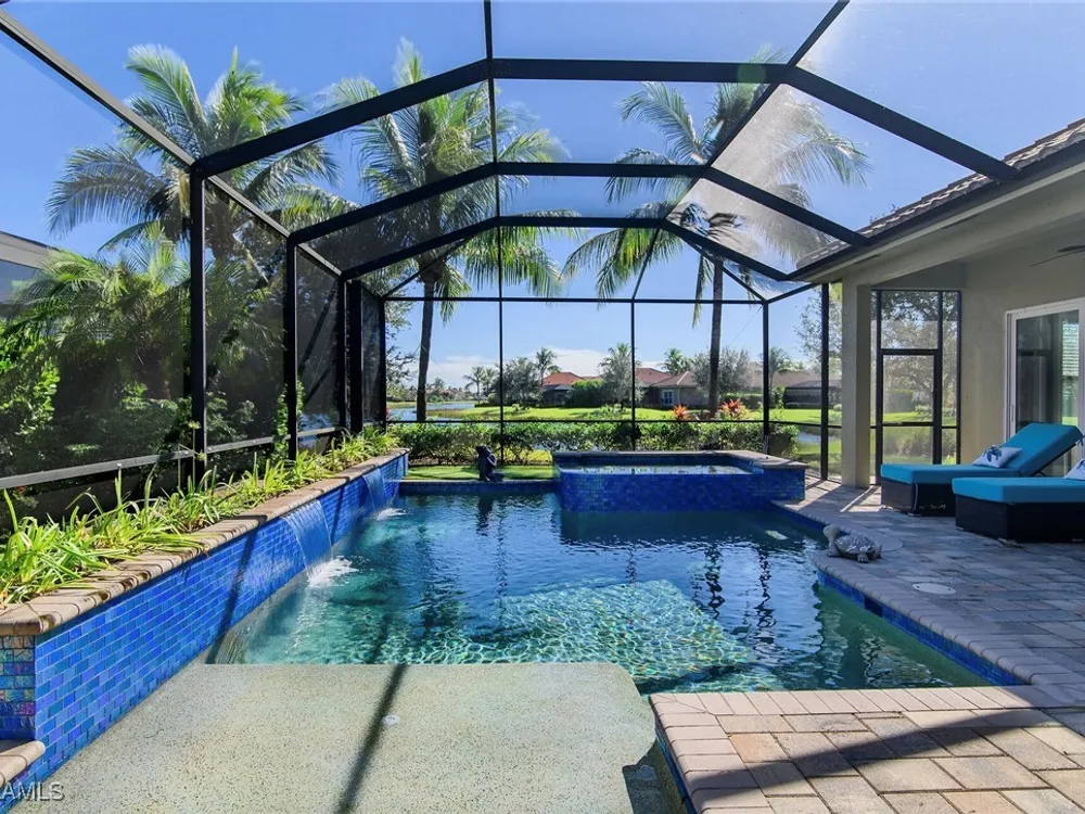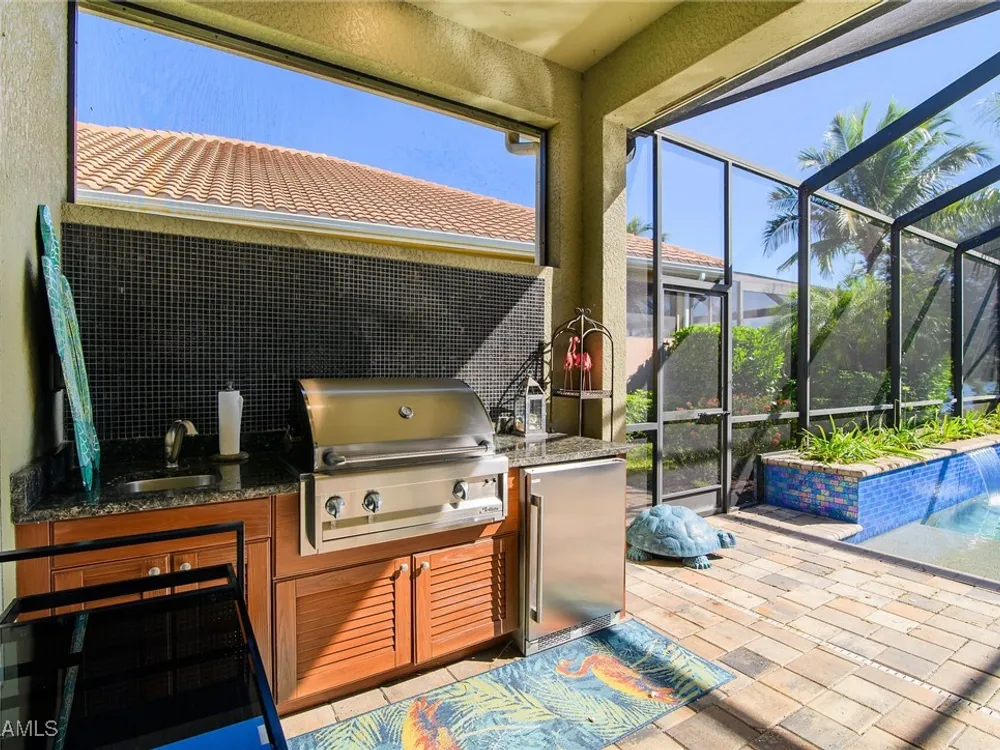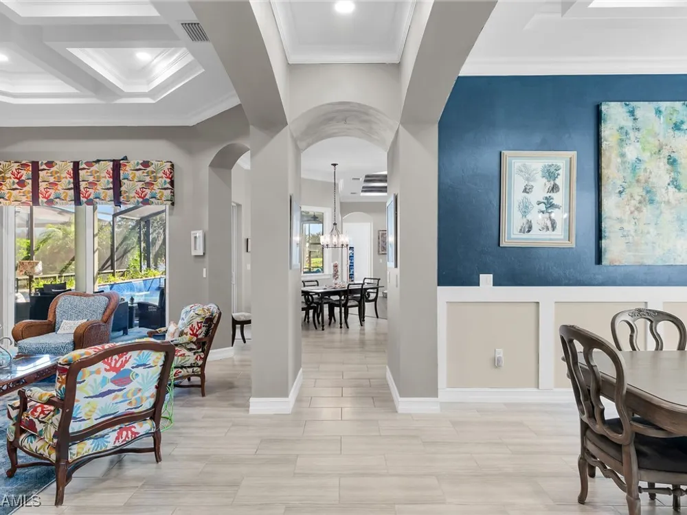 Experience luxurious waterfront living in this impeccably maintained home boasting a stunning long lake view in the sought-after Chiasso neighborhood of Fiddler’s Creek. Elegant details include coffered ceilings, crown molding, and decorative niches, complemented by impact-resistant windows and sliders throughout. At the heart of the home, the open-concept chef’s kitchen features new stainless steel appliances (2024), gas cooking, granite countertops, solid wood cabinetry, a butler’s pantry, a dry bar with custom wine shelving, and a spacious island ideal for entertaining. The split-bedroom layout ensures privacy, with the primary suite offering a jetted tub, a walk-in shower with multiple shower heads and massaging jets, and two guest ensuites—one showcasing four built-in, extra-length bunk beds. A versatile den with an adjacent full bath can easily serve as a fourth bedroom. Recent 2025 upgrades include two high-efficiency Trane A/C units, a Navien tankless water heater, and recessed LED wafer lighting. The three-car garage provides ample storage and is plumbed for a water softener. Enjoy effortless indoor-outdoor living with a custom outdoor kitchen featuring a gas grill, alongside a private gas-heated saltwater pool with waterfalls, spa, sun shelf, irrigated planter, new antenna for the iAquaLink pool control system (2025), and updated pool tiles (2023). A putting green and extended screened lanai complete this tranquil retreat. Located in the award-winning, amenity-rich community of Fiddler’s Creek, residents enjoy optional golf, a resort-style clubhouse, multiple pools, a full-service spa, fitness center, walking and biking trails, tennis, pickleball, beach club access, and on-site casual and fine dining—all just minutes from Marco Island and downtown Naples.