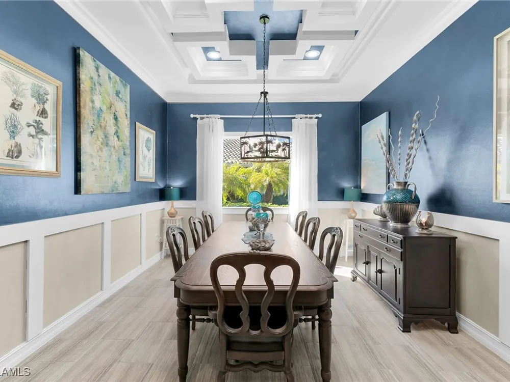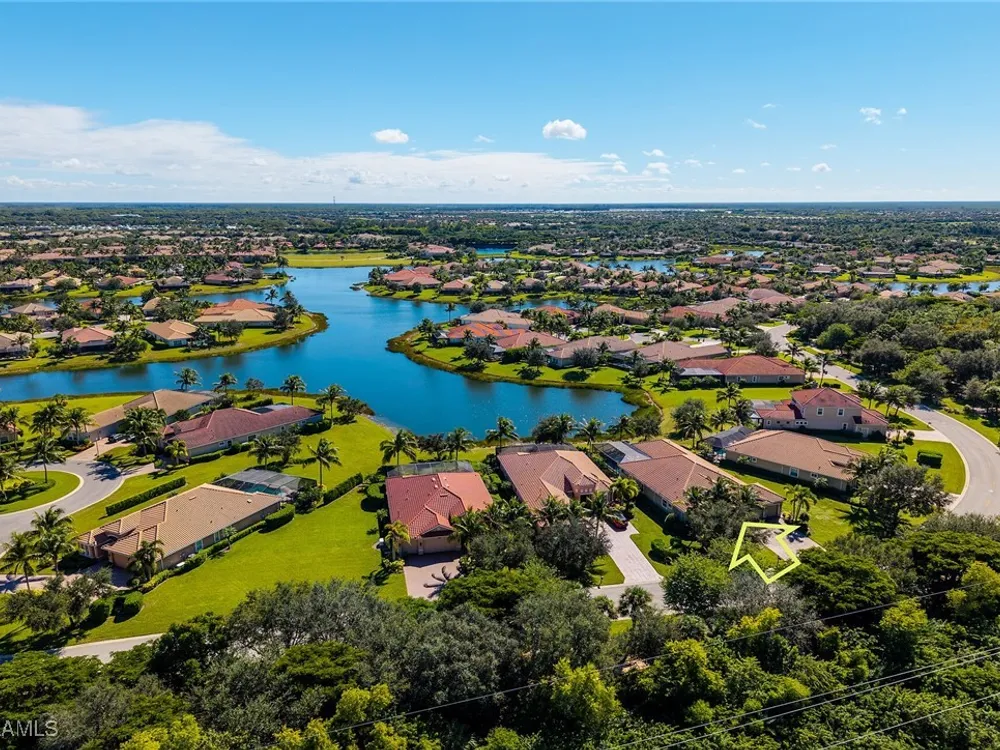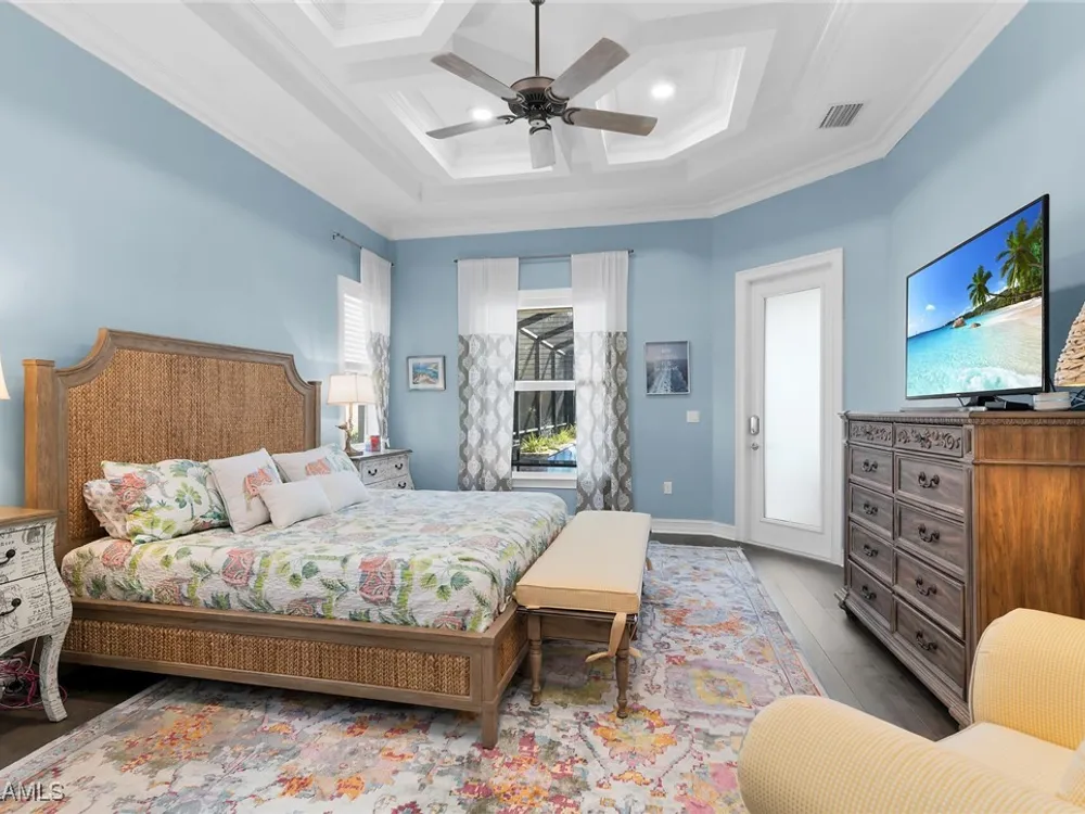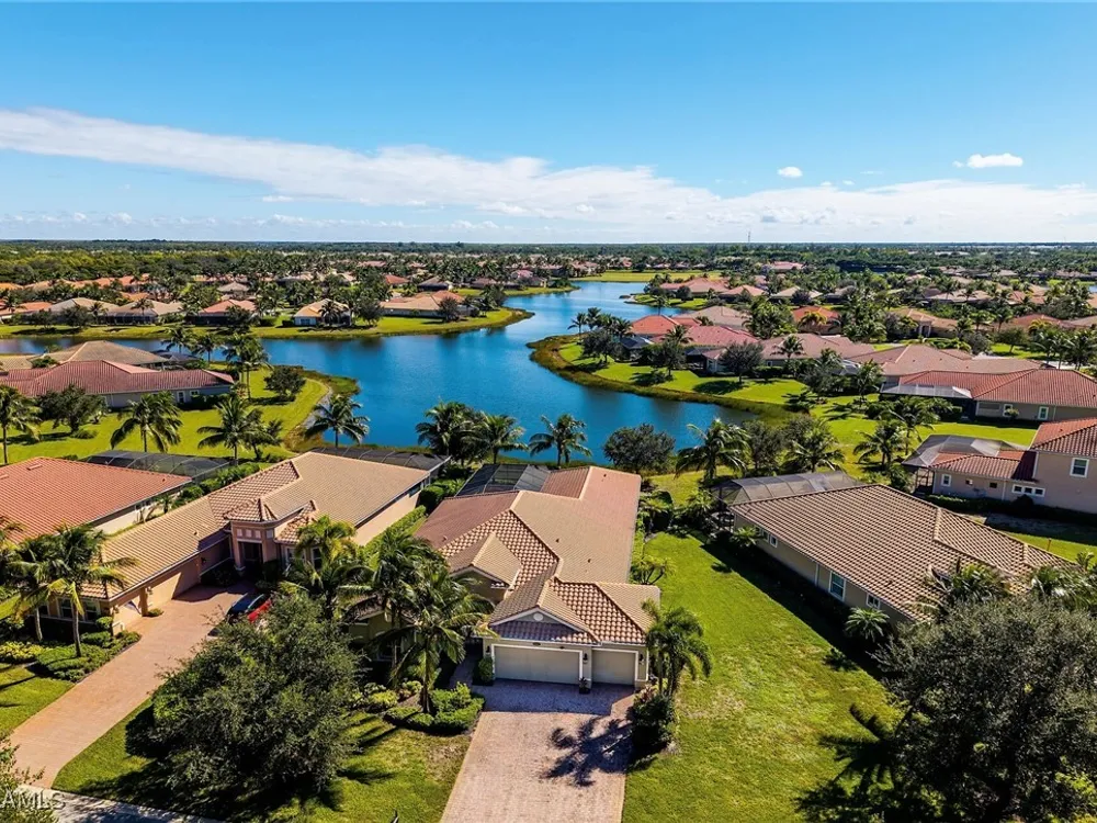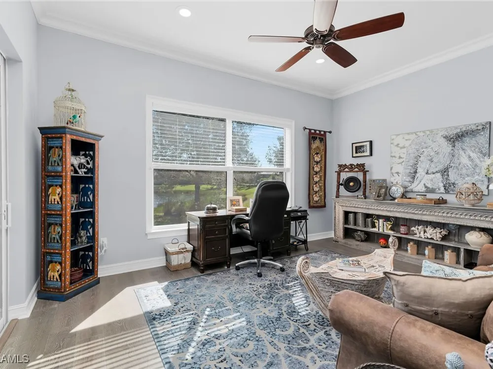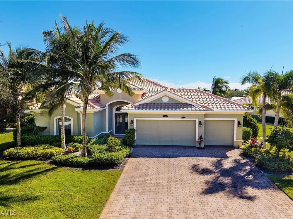 Experience luxurious waterfront living in this impeccably maintained home boasting a stunning long lake view in the sought-after Chiasso neighborhood of Fiddler’s Creek. Elegant details include coffered ceilings, crown molding, and decorative niches, complemented by impact-resistant windows and sliders throughout. At the heart of the home, the open-concept chef’s kitchen features new stainless steel appliances (2024), gas cooking, granite countertops, solid wood cabinetry, a butler’s pantry, a dry bar with custom wine shelving, and a spacious island ideal for entertaining. The split-bedroom layout ensures privacy, with the primary suite offering a jetted tub, a walk-in shower with multiple shower heads and massaging jets, and two guest ensuites—one showcasing four built-in, extra-length bunk beds. A versatile den with an adjacent full bath can easily serve as a fourth bedroom. Recent 2025 upgrades include two high-efficiency Trane A/C units, a Navien tankless water heater, and recessed LED wafer lighting. The three-car garage provides ample storage and is plumbed for a water softener. Enjoy effortless indoor-outdoor living with a custom outdoor kitchen featuring a gas grill, alongside a private gas-heated saltwater pool with waterfalls, spa, sun shelf, irrigated planter, new antenna for the iAquaLink pool control system (2025), and updated pool tiles (2023). A putting green and extended screened lanai complete this tranquil retreat. Located in the award-winning, amenity-rich community of Fiddler’s Creek, residents enjoy optional golf, a resort-style clubhouse, multiple pools, a full-service spa, fitness center, walking and biking trails, tennis, pickleball, beach club access, and on-site casual and fine dining—all just minutes from Marco Island and downtown Naples.