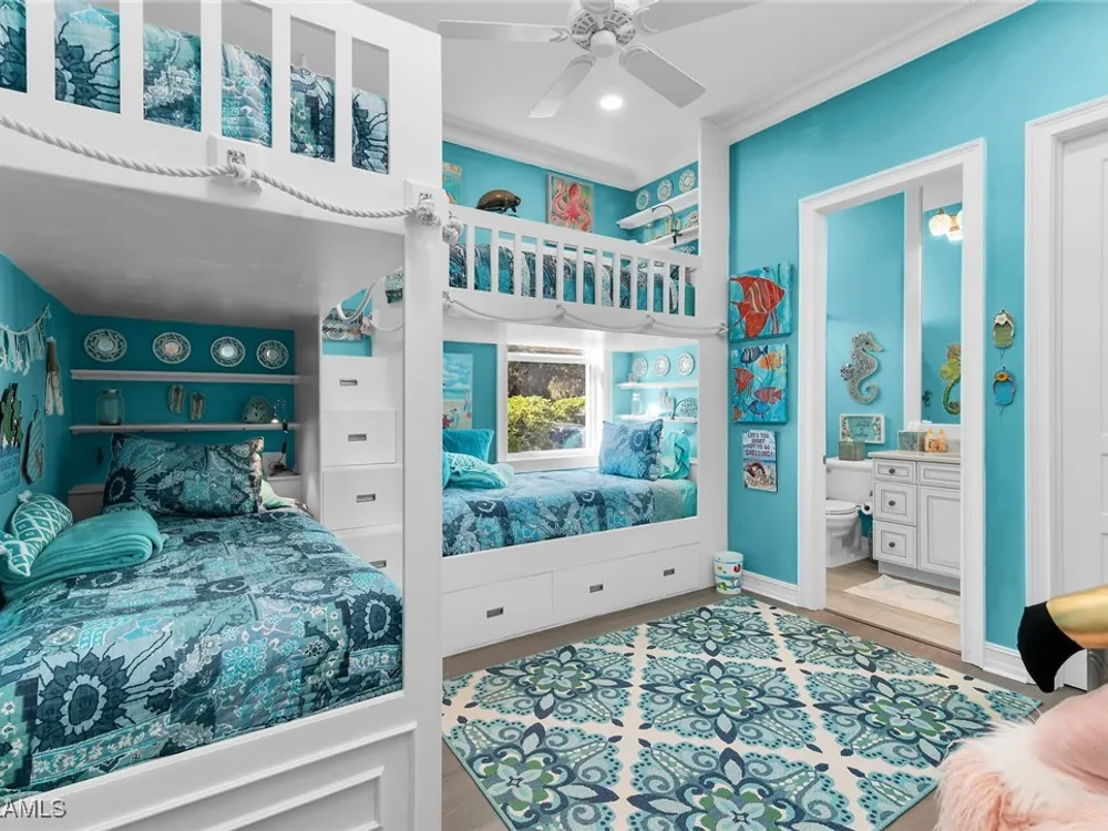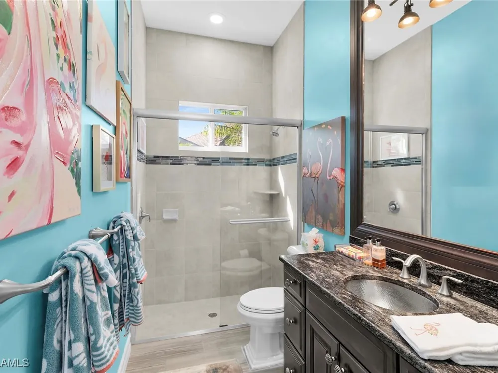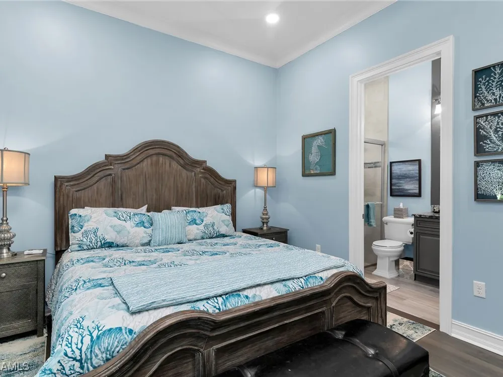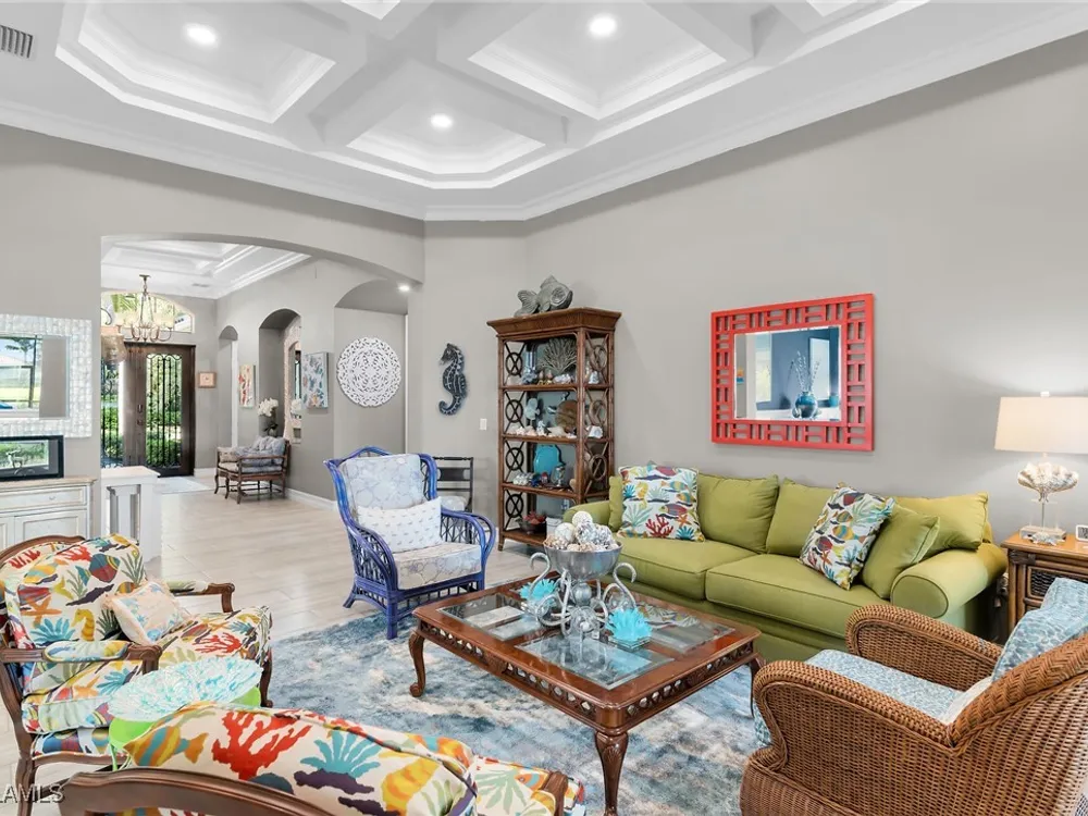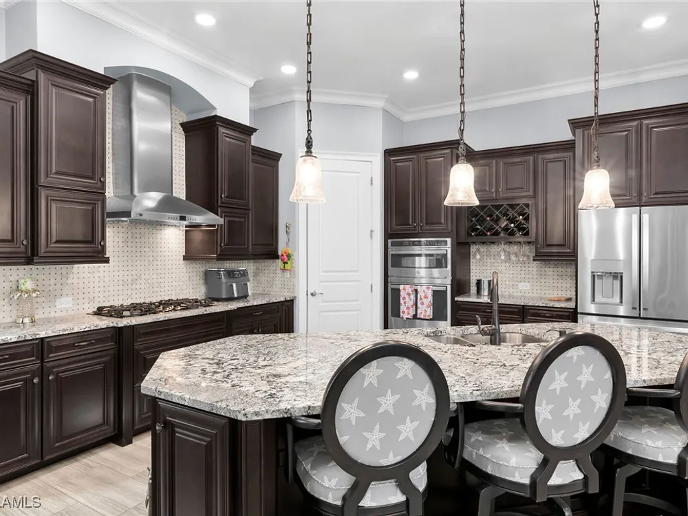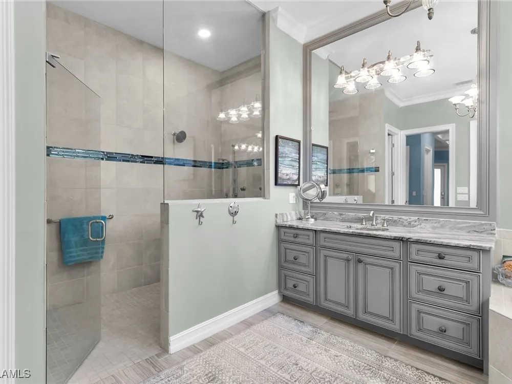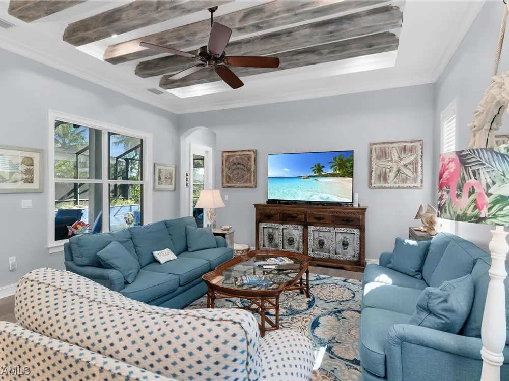 Experience luxurious waterfront living in this impeccably maintained home boasting a stunning long lake view in the sought-after Chiasso neighborhood of Fiddler’s Creek. Elegant details include coffered ceilings, crown molding, and decorative niches, complemented by impact-resistant windows and sliders throughout. At the heart of the home, the open-concept chef’s kitchen features new stainless steel appliances (2024), gas cooking, granite countertops, solid wood cabinetry, a butler’s pantry, a dry bar with custom wine shelving, and a spacious island ideal for entertaining. The split-bedroom layout ensures privacy, with the primary suite offering a jetted tub, a walk-in shower with multiple shower heads and massaging jets, and two guest ensuites—one showcasing four built-in, extra-length bunk beds. A versatile den with an adjacent full bath can easily serve as a fourth bedroom. Recent 2025 upgrades include two high-efficiency Trane A/C units, a Navien tankless water heater, and recessed LED wafer lighting. The three-car garage provides ample storage and is plumbed for a water softener. Enjoy effortless indoor-outdoor living with a custom outdoor kitchen featuring a gas grill, alongside a private gas-heated saltwater pool with waterfalls, spa, sun shelf, irrigated planter, new antenna for the iAquaLink pool control system (2025), and updated pool tiles (2023). A putting green and extended screened lanai complete this tranquil retreat. Located in the award-winning, amenity-rich community of Fiddler’s Creek, residents enjoy optional golf, a resort-style clubhouse, multiple pools, a full-service spa, fitness center, walking and biking trails, tennis, pickleball, beach club access, and on-site casual and fine dining—all just minutes from Marco Island and downtown Naples.