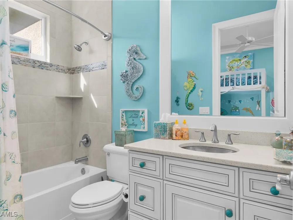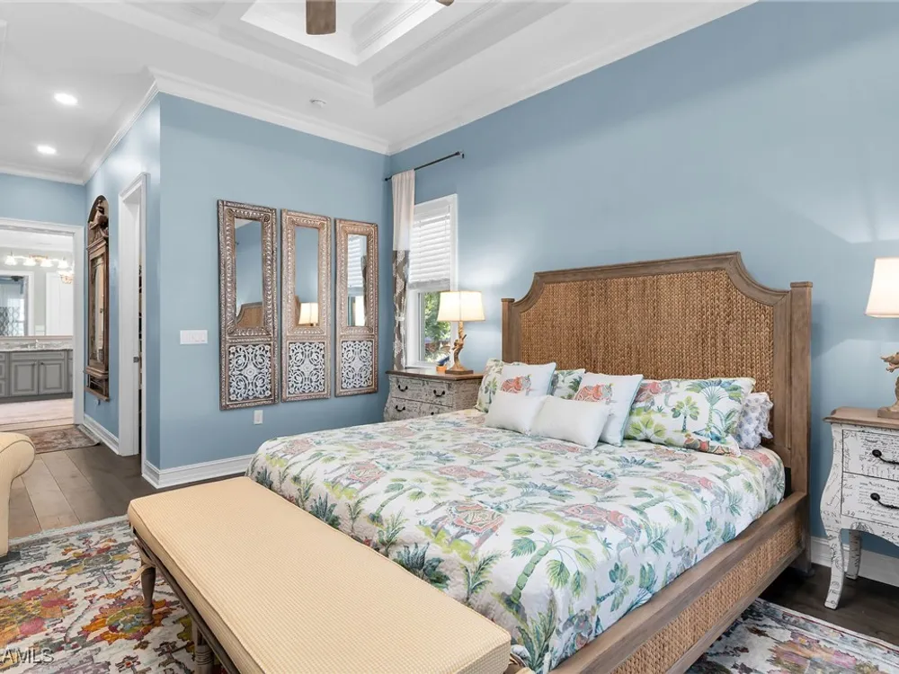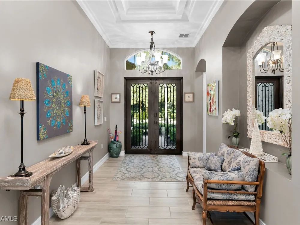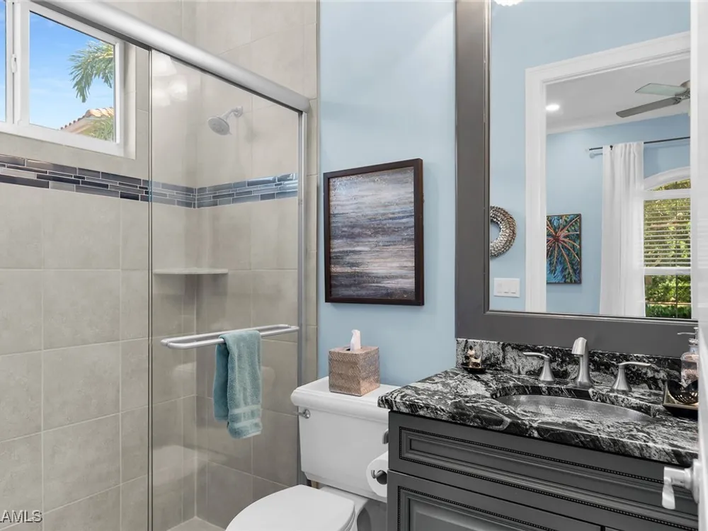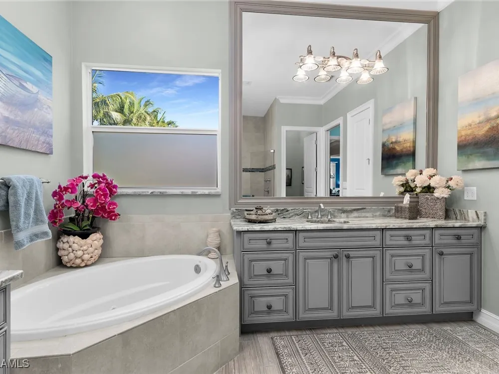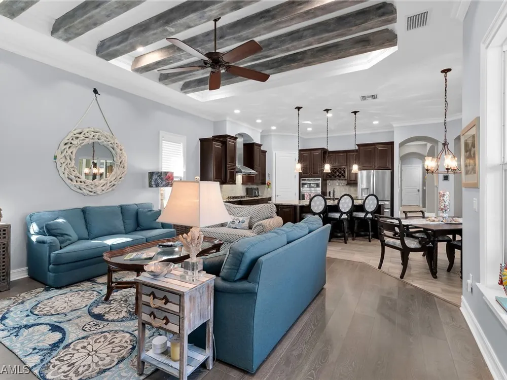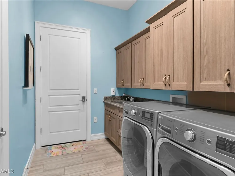 Experience luxurious waterfront living in this impeccably maintained home boasting a stunning long lake view in the sought-after Chiasso neighborhood of Fiddler’s Creek. Elegant details include coffered ceilings, crown molding, and decorative niches, complemented by impact-resistant windows and sliders throughout. At the heart of the home, the open-concept chef’s kitchen features new stainless steel appliances (2024), gas cooking, granite countertops, solid wood cabinetry, a butler’s pantry, a dry bar with custom wine shelving, and a spacious island ideal for entertaining. The split-bedroom layout ensures privacy, with the primary suite offering a jetted tub, a walk-in shower with multiple shower heads and massaging jets, and two guest ensuites—one showcasing four built-in, extra-length bunk beds. A versatile den with an adjacent full bath can easily serve as a fourth bedroom. Recent 2025 upgrades include two high-efficiency Trane A/C units, a Navien tankless water heater, and recessed LED wafer lighting. The three-car garage provides ample storage and is plumbed for a water softener. Enjoy effortless indoor-outdoor living with a custom outdoor kitchen featuring a gas grill, alongside a private gas-heated saltwater pool with waterfalls, spa, sun shelf, irrigated planter, new antenna for the iAquaLink pool control system (2025), and updated pool tiles (2023). A putting green and extended screened lanai complete this tranquil retreat. Located in the award-winning, amenity-rich community of Fiddler’s Creek, residents enjoy optional golf, a resort-style clubhouse, multiple pools, a full-service spa, fitness center, walking and biking trails, tennis, pickleball, beach club access, and on-site casual and fine dining—all just minutes from Marco Island and downtown Naples.