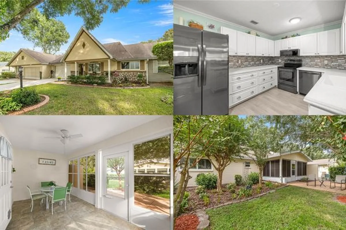 Welcome to this immaculate villa located in the highly sought-after 55+ community of On Top of the World, where resort-style living is truly extraordinary. This home offers 2 spacious bedrooms and 2 bathrooms, with the master bath featuring a granite countertop and the guest bath beautifully remodeled in 2024 with a quartz countertop. Plantation shutters throughout, gorgeous crown molding, and fresh interior paint add a touch of elegance. The light fixtures and fans were all replaced in 2022, while the spacious kitchen, overlooking the lanai, includes a charming breakfast nook with modern wood board panel accents. Enjoy the enclosed lanai with a private yard and open patio—perfect for grilling or simply relaxing. This vibrant community offers endless amenities, including pools, golf, tennis, pickleball, racquetball, biking and walking trails, dog parks, hobby clubs, fitness and recreation centers, an RC flying field and car track, bocce ball, horseshoes, archery, and much more. The maintenance fee covers lawn care, tree maintenance, exterior paint, pressure washing, and trash service, making it easy to enjoy a carefree lifestyle. With AC replaced in 2019, roof in 2018, and windows in 2018, this villa is move-in ready. Don’t miss this opportunity—schedule your showing today!
