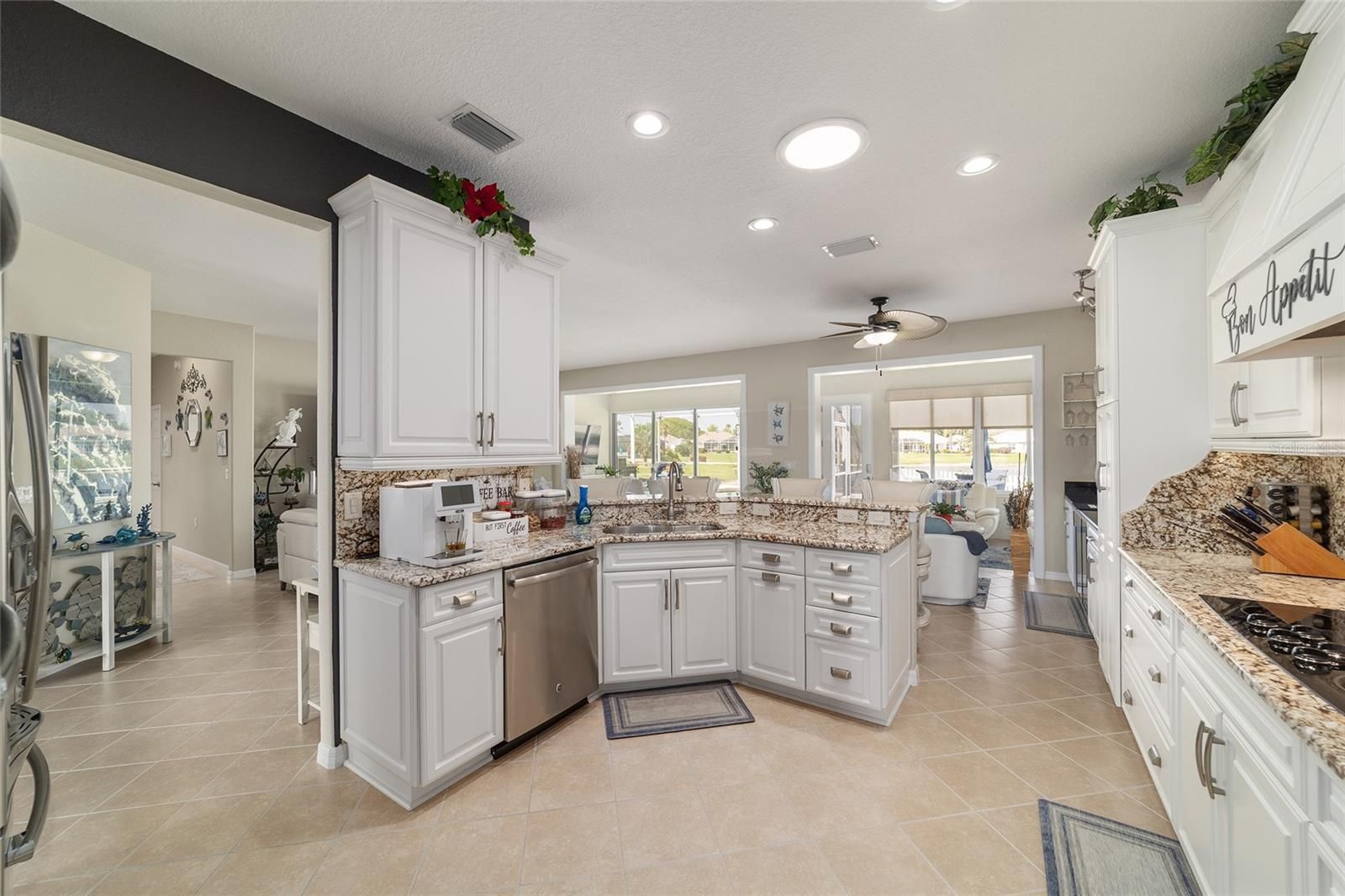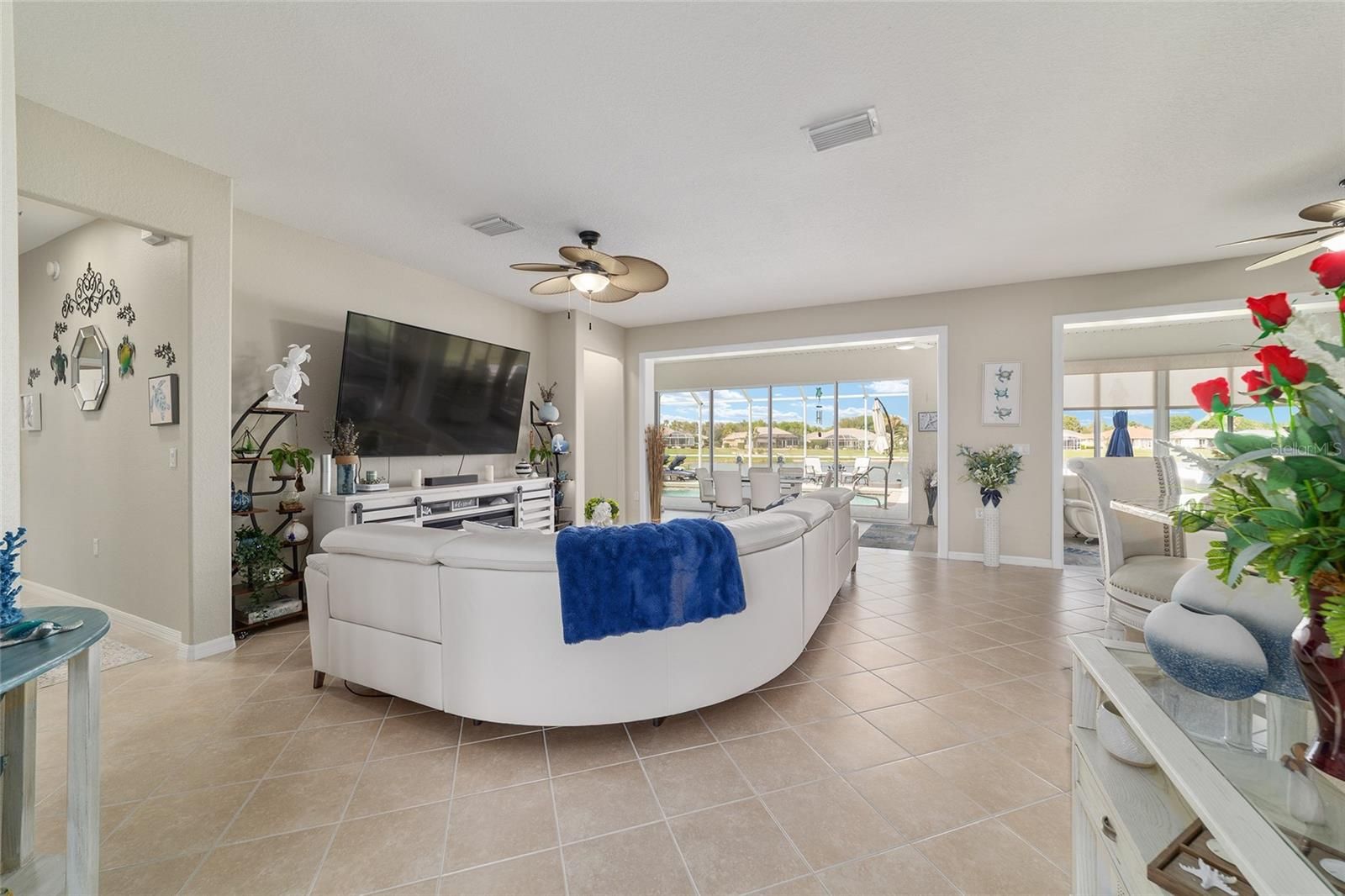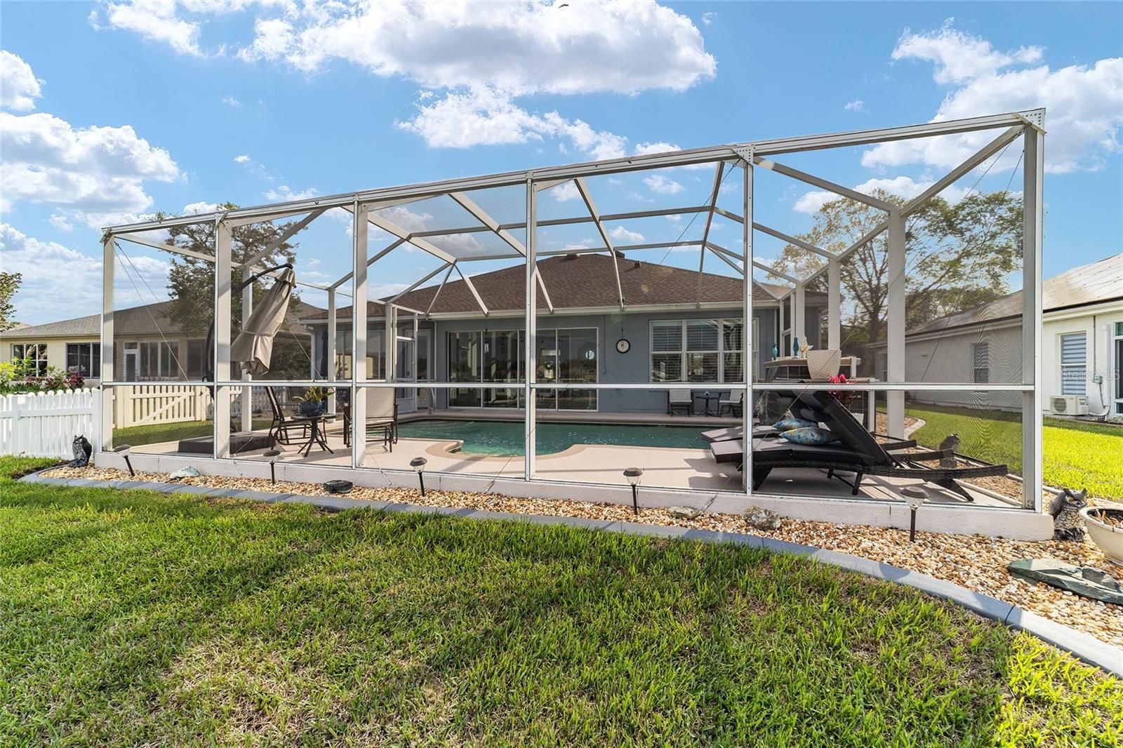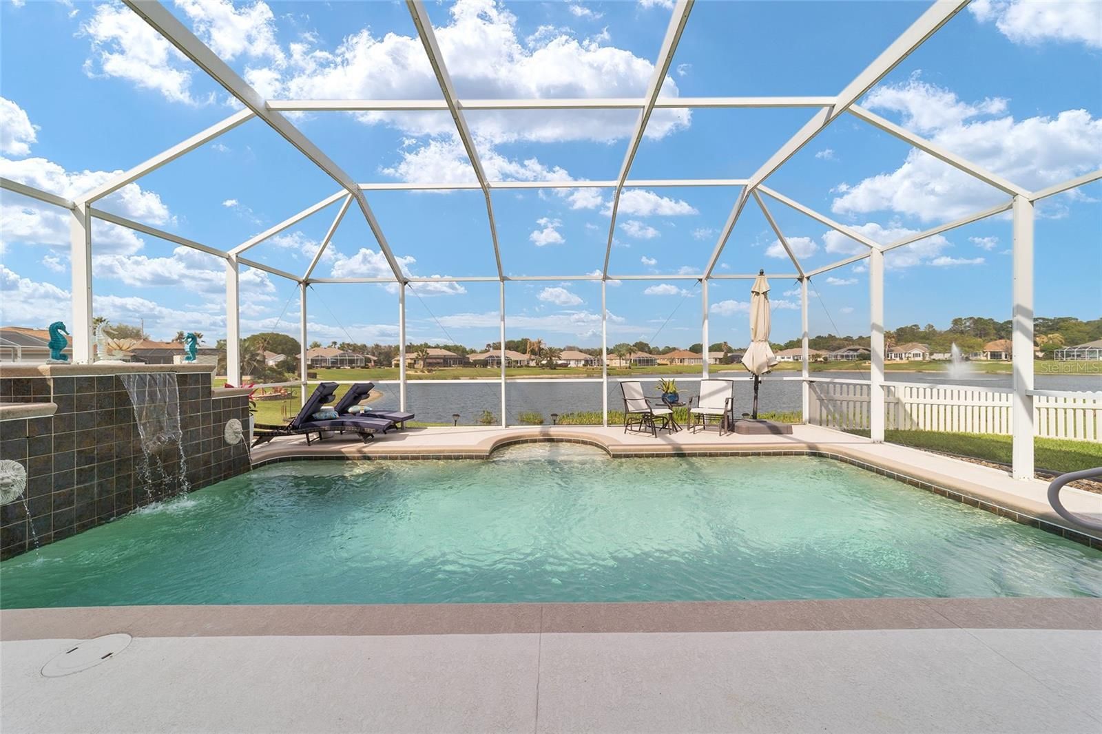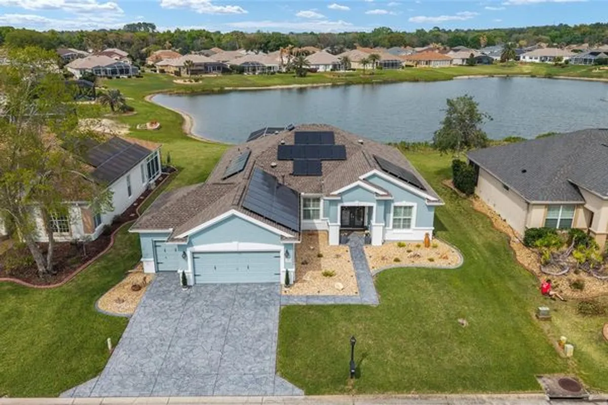 Pool House with Stunning Water Views! Situated in Del Webb’s Spruce Creek Golf & Country Club, an exclusive 55+ community between The Villages and Ocala, this home boasts double beveled-glass entry doors that open to a foyer with tiled floors and water views. The spacious kitchen offers plenty of 42" cabinetry. The primary suite features a water view, engineered hardwood floors, and a large walk-in closet. The den can be used as a third bedroom with the addition of the built-in Murphy Bed. An extended two-car garage, plus a golf cart garage with extra storage, provides ample space. Enjoy a designer-painted driveway and walkway, along with a large, screened lanai overlooking the water—ideal for entertaining guests. Recent updates include a new roof (2023), fresh interior and exterior paint (2023), a whole-house generator and Solar Panels (owned). Well for irrigation , liquid light in pool enclosure.This unique waterfront home is move-in ready and meticulously maintained—don’t miss your chance purchase this beautiful home!