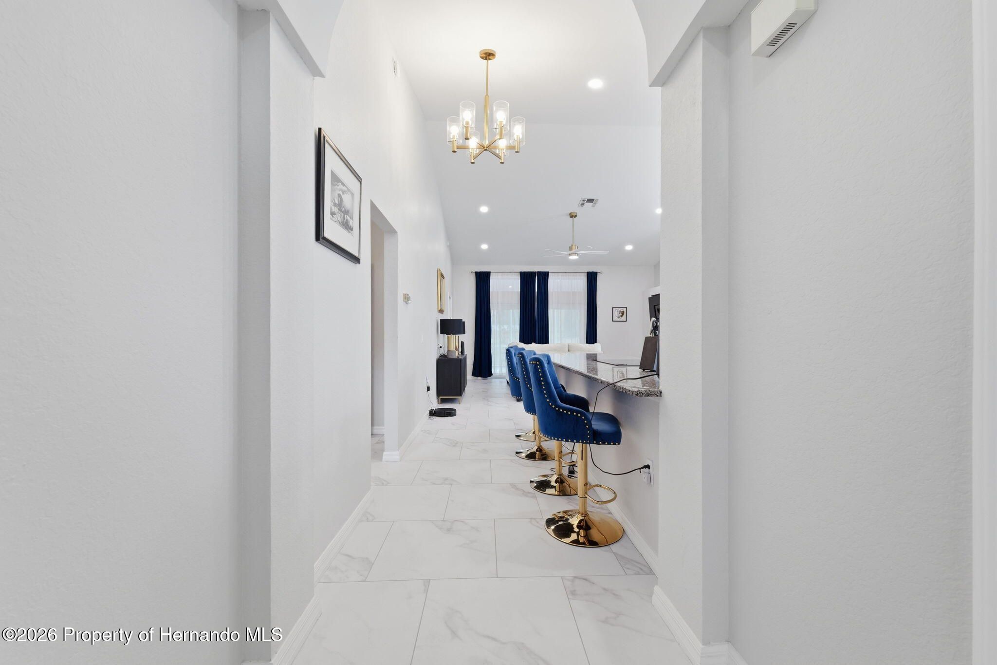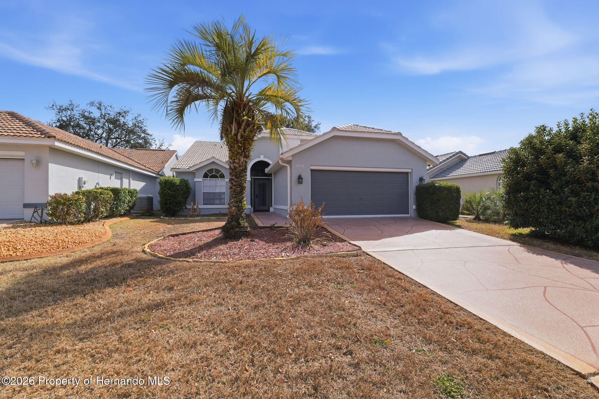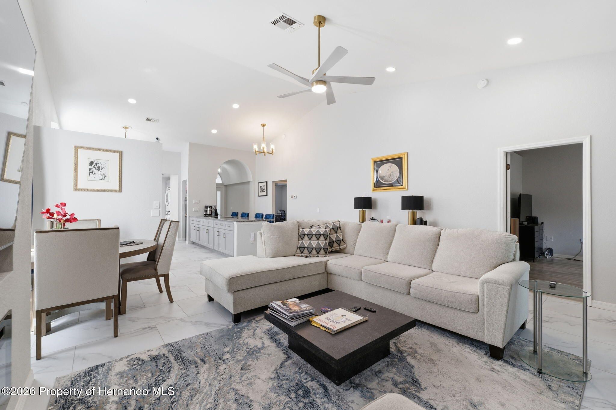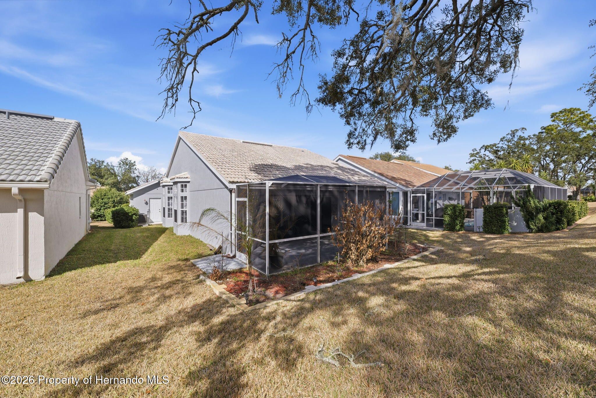 Located within the gated community of Glen Lakes Golf & Country Club, this beautifully updated 2-bedroom, 2-bath home with a 2-car garage offers refined finishes, soaring ceilings, and a thoughtfully designed open layout on a landscaped 0.12-acre lot. A long custom-painted concrete driveway with decorative scoring creates distinctive curb appeal and continues along the walkway to the covered, screened front porch, setting the tone for the upscale interior. Step through the arched entry into a bright white foyer with a coat closet and elegant tile flooring that extends throughout the foyer, kitchen, living, and dining areas, while both bedrooms feature luxury vinyl flooring for added comfort and style. The open-concept kitchen, living, and dining areas are filled with natural light and enhanced by tall ceilings and sliding glass doors leading to the expansive rear patio. The kitchen is both stylish and functional, showcasing granite countertops, a very large breakfast bar, gold chandeliers and accents, stainless steel appliances, and grey cabinetry with gold hardware. A central island with sink sits beneath large windows, and there is additional space perfect for a breakfast nook or casual dining area. The living room features an electric fireplace and abundant windows that create a bright, inviting atmosphere. Tucked discreetly behind a wall at the back of the kitchen is a convenient laundry cove, along with direct access to the garage. The primary suite offers a slanted ceiling for architectural interest, private access to the rear patio through a wall of sliding glass doors, dual walk-in closets, and a spacious ensuite bath complete with dual vanities, upscale round mirrors, and an oversized step-in shower with frameless glass, neutral tile, and a large window for natural light. The second bathroom is equally impressive, featuring dual sinks, an upscale vanity, a beautiful oval mirror, and a frameless glass shower with stone-look tile and a window. Outdoors, the large covered patio is fully screened, creating a private space to relax or entertain year-round. Residents of Glen Lakes enjoy resort-style amenities including a clubhouse for dining and social events, a junior Olympic-size pool, fitness center, tennis and pickleball courts, and optional golf membership, all conveniently located near Weeki Wachee Springs State Park, where crystal-clear waters invite kayaking and paddleboarding--offering a lifestyle that feels both active and effortlessly enjoyable.