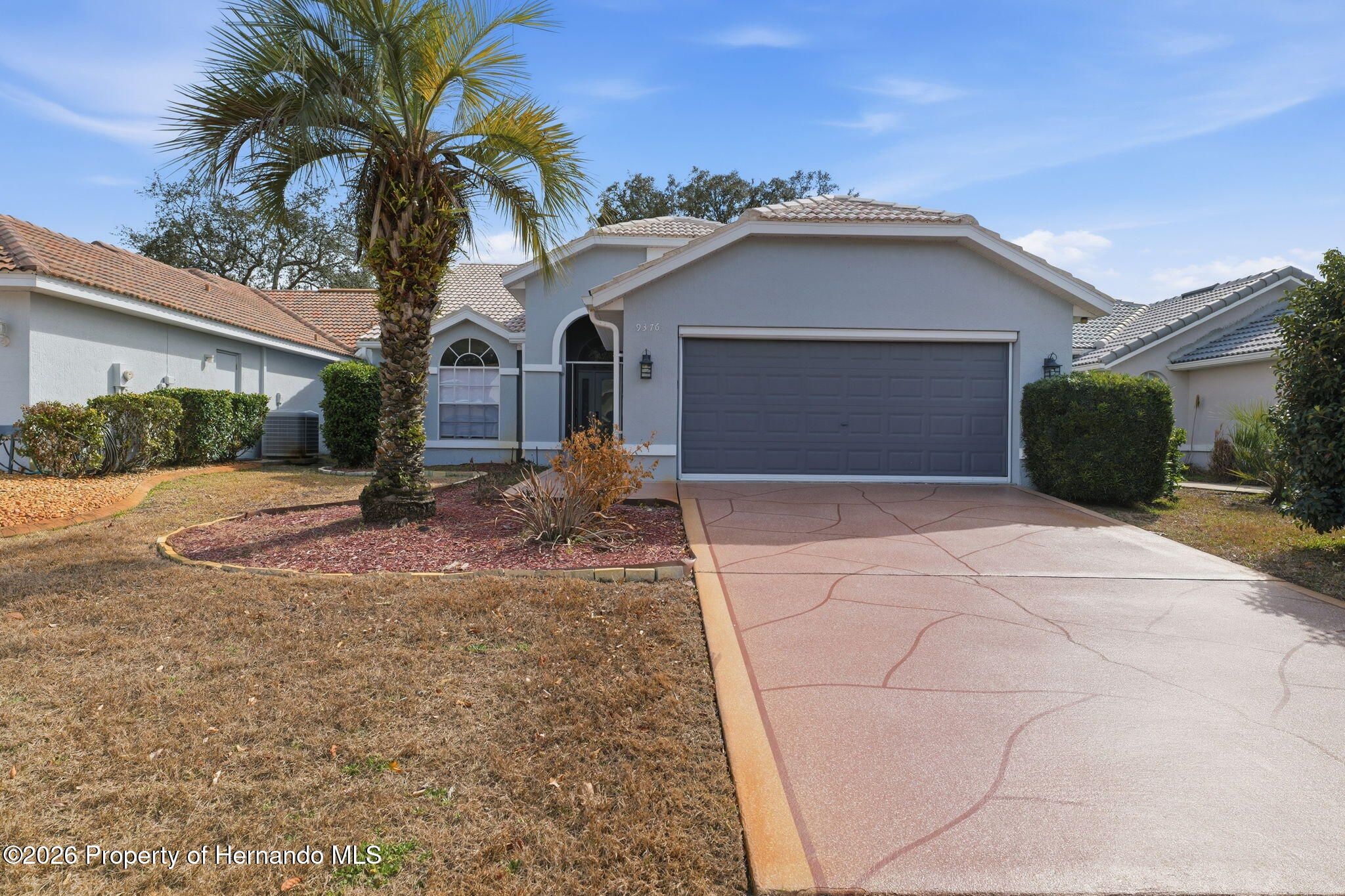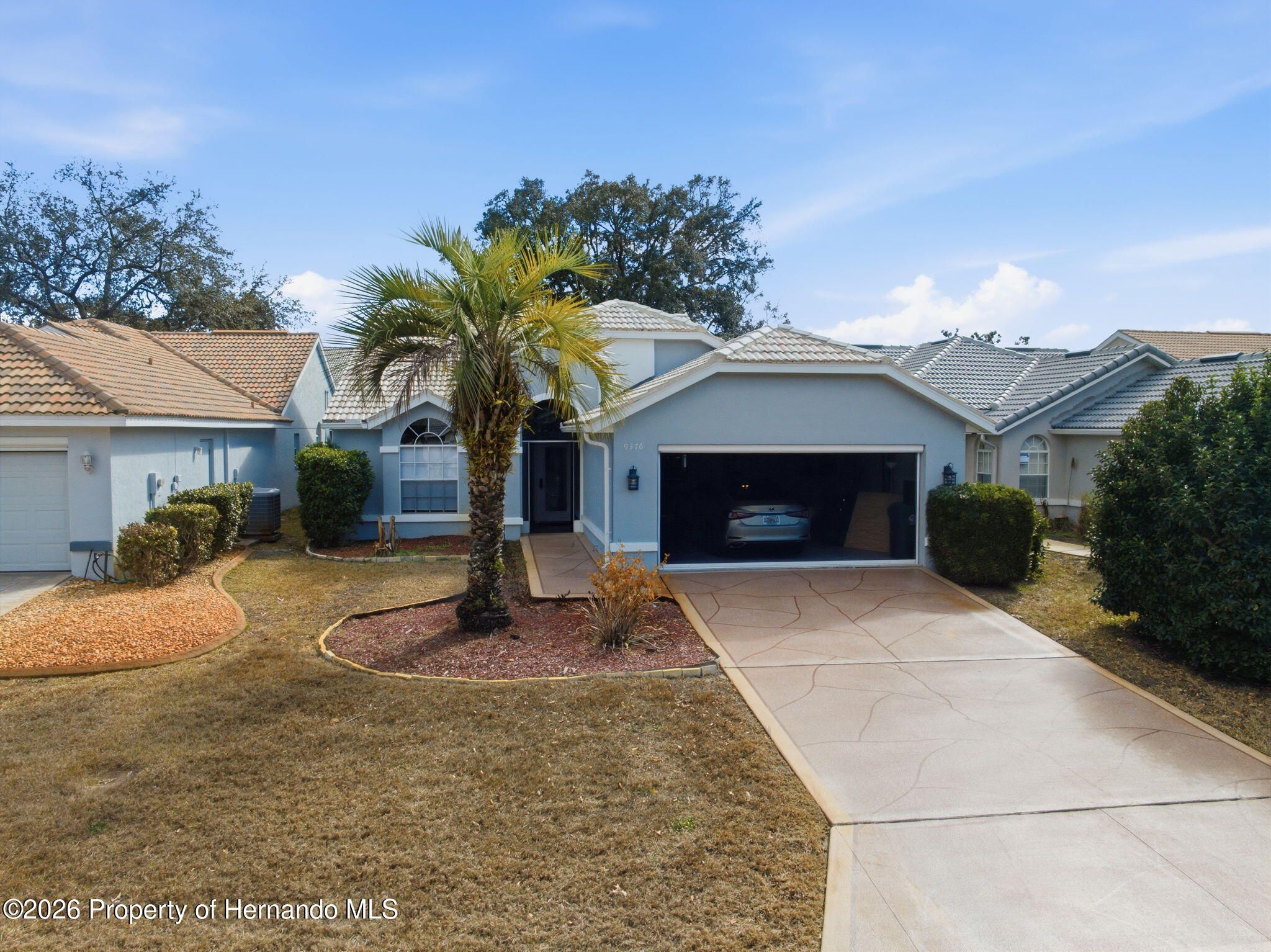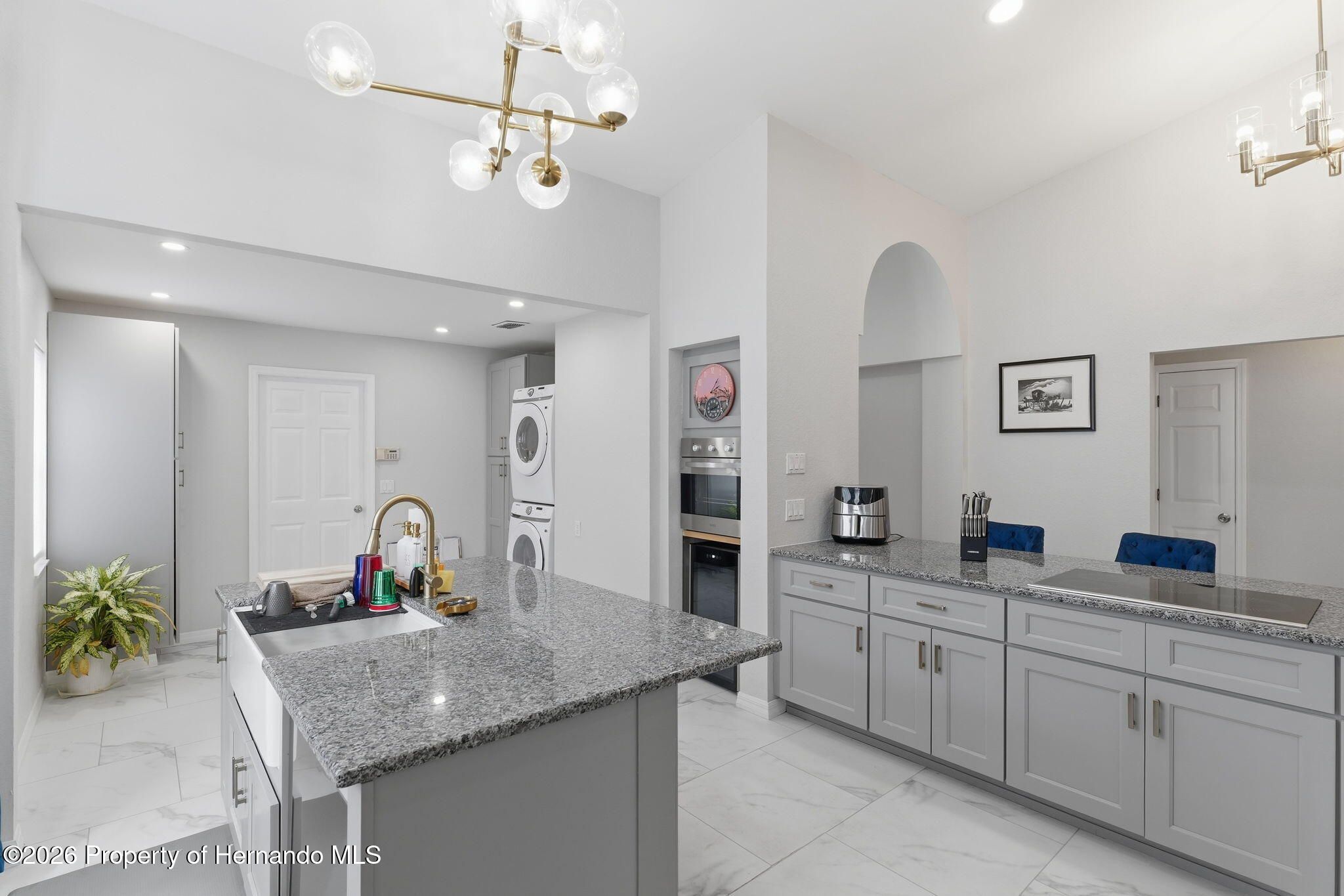 Located within the gated community of Glen Lakes Golf & Country Club, this beautifully updated 2-bedroom, 2-bath home with a 2-car garage offers refined finishes, soaring ceilings, and a thoughtfully designed open layout on a landscaped 0.12-acre lot. A long custom-painted concrete driveway with decorative scoring creates distinctive curb appeal and continues along the walkway to the covered, screened front porch, setting the tone for the upscale interior. Step through the arched entry into a bright white foyer with a coat closet and elegant tile flooring that extends throughout the foyer, kitchen, living, and dining areas, while both bedrooms feature luxury vinyl flooring for added comfort and style. The open-concept kitchen, living, and dining areas are filled with natural light and enhanced by tall ceilings and sliding glass doors leading to the expansive rear patio. The kitchen is both stylish and functional, showcasing granite countertops, a very large breakfast bar, gold chandeliers and accents, stainless steel appliances, and grey cabinetry with gold hardware. A central island with sink sits beneath large windows, and there is additional space perfect for a breakfast nook or casual dining area. The living room features an electric fireplace and abundant windows that create a bright, inviting atmosphere. Tucked discreetly behind a wall at the back of the kitchen is a convenient laundry cove, along with direct access to the garage. The primary suite offers a slanted ceiling for architectural interest, private access to the rear patio through a wall of sliding glass doors, dual walk-in closets, and a spacious ensuite bath complete with dual vanities, upscale round mirrors, and an oversized step-in shower with frameless glass, neutral tile, and a large window for natural light. The second bathroom is equally impressive, featuring dual sinks, an upscale vanity, a beautiful oval mirror, and a frameless glass shower with stone-look tile and a window. Outdoors, the large covered patio is fully screened, creating a private space to relax or entertain year-round. Residents of Glen Lakes enjoy resort-style amenities including a clubhouse for dining and social events, a junior Olympic-size pool, fitness center, tennis and pickleball courts, and optional golf membership, all conveniently located near Weeki Wachee Springs State Park, where crystal-clear waters invite kayaking and paddleboarding--offering a lifestyle that feels both active and effortlessly enjoyable.
