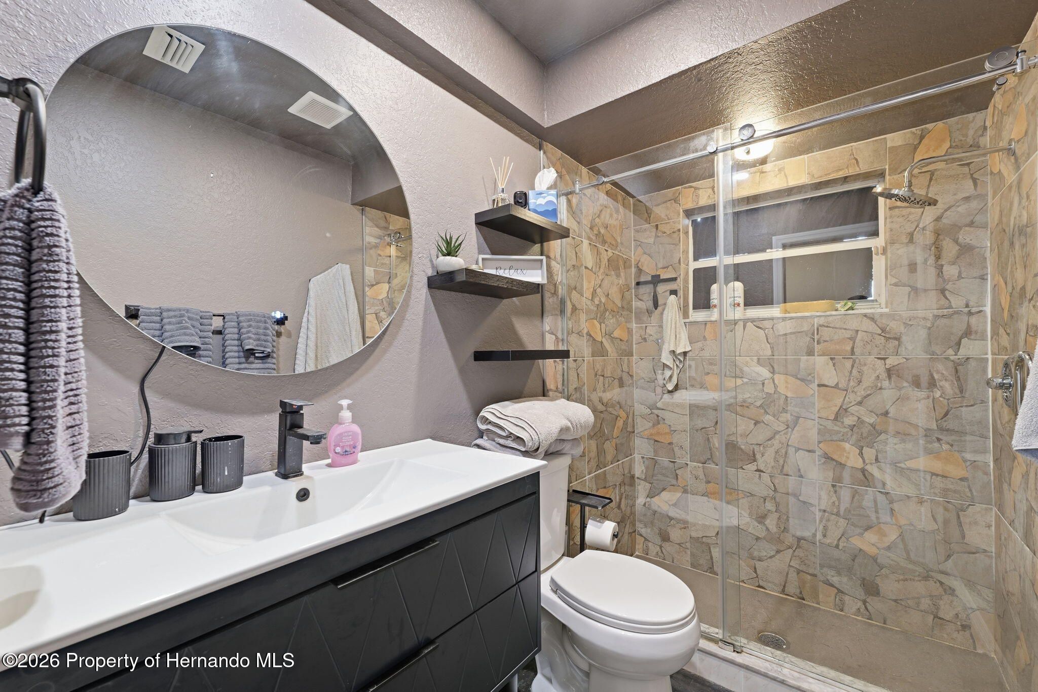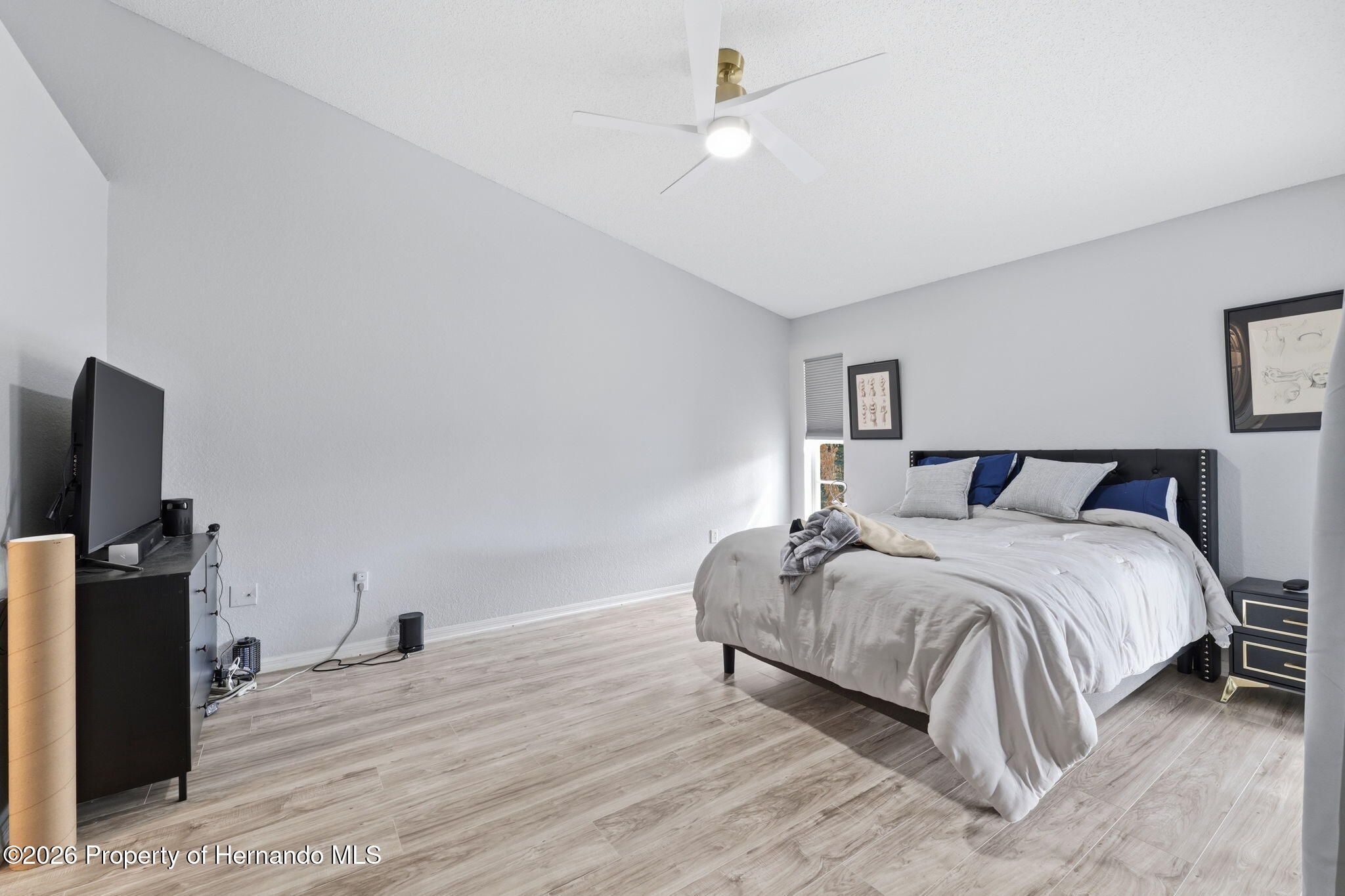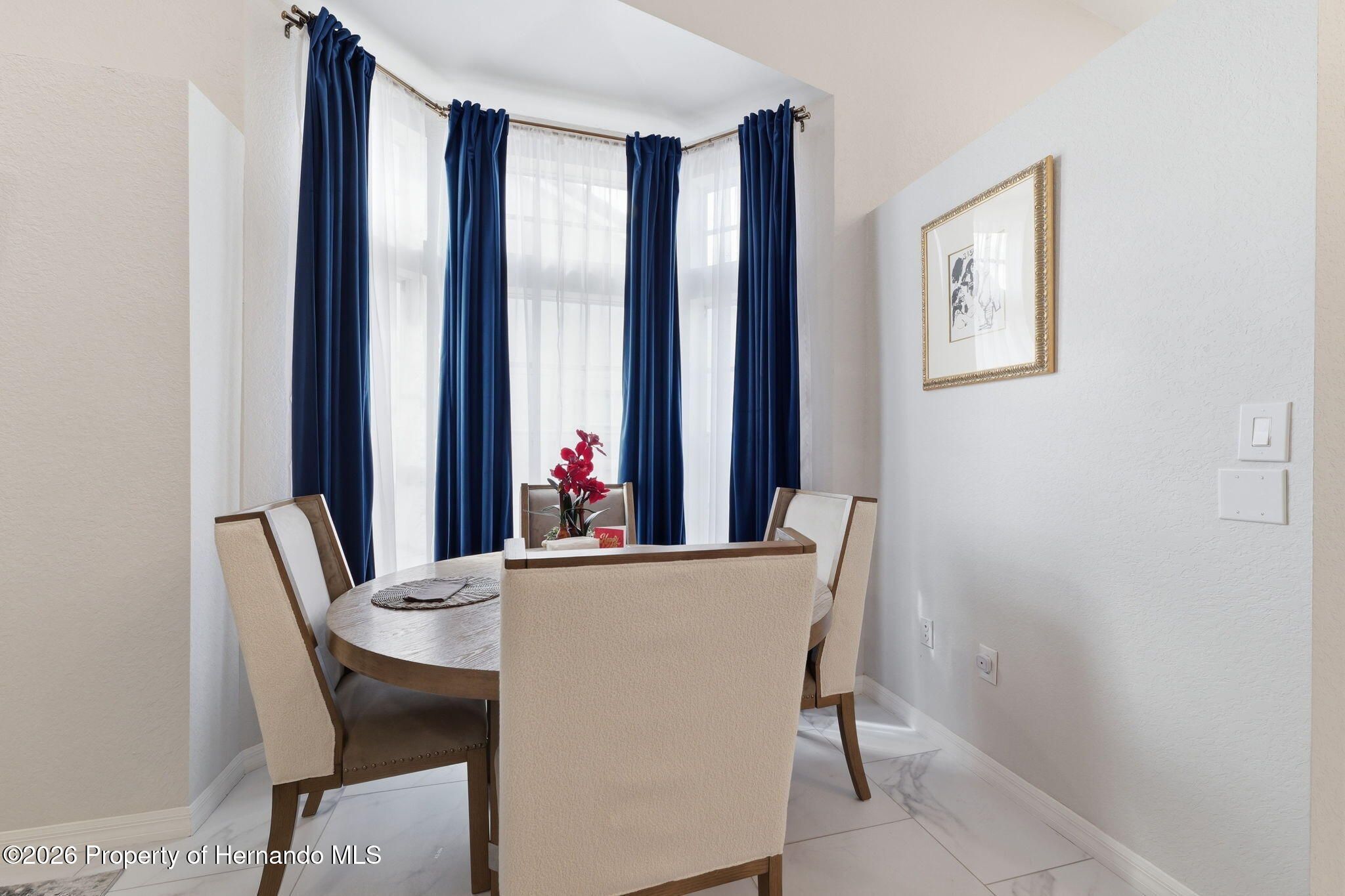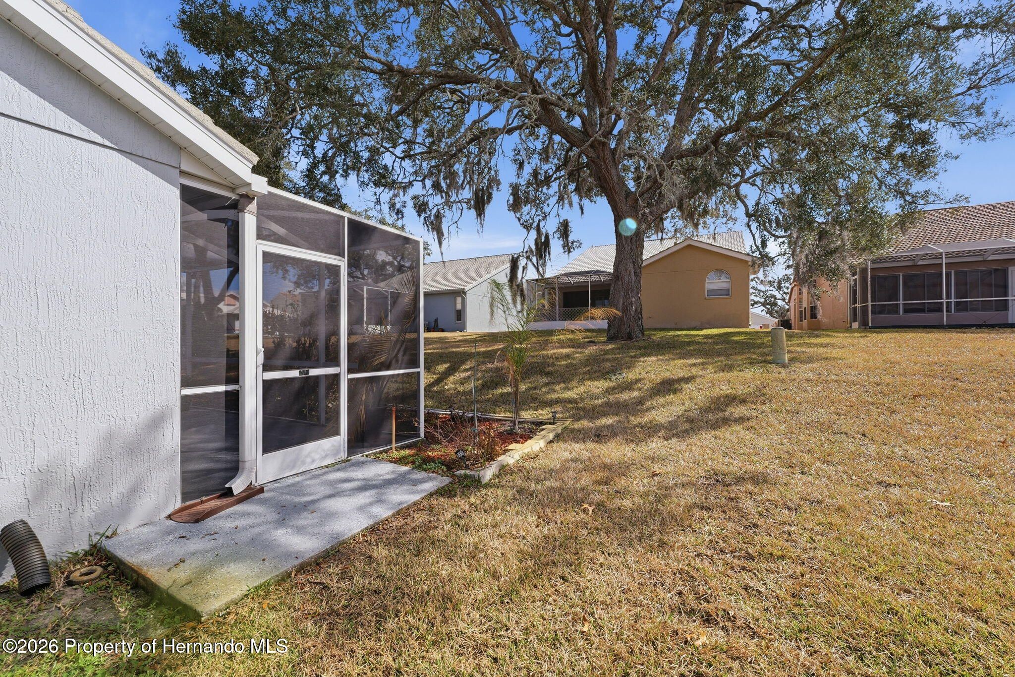 Located within the gated community of Glen Lakes Golf & Country Club, this beautifully updated 2-bedroom, 2-bath home with a 2-car garage offers refined finishes, soaring ceilings, and a thoughtfully designed open layout on a landscaped 0.12-acre lot. A long custom-painted concrete driveway with decorative scoring creates distinctive curb appeal and continues along the walkway to the covered, screened front porch, setting the tone for the upscale interior. Step through the arched entry into a bright white foyer with a coat closet and elegant tile flooring that extends throughout the foyer, kitchen, living, and dining areas, while both bedrooms feature luxury vinyl flooring for added comfort and style. The open-concept kitchen, living, and dining areas are filled with natural light and enhanced by tall ceilings and sliding glass doors leading to the expansive rear patio. The kitchen is both stylish and functional, showcasing granite countertops, a very large breakfast bar, gold chandeliers and accents, stainless steel appliances, and grey cabinetry with gold hardware. A central island with sink sits beneath large windows, and there is additional space perfect for a breakfast nook or casual dining area. The living room features an electric fireplace and abundant windows that create a bright, inviting atmosphere. Tucked discreetly behind a wall at the back of the kitchen is a convenient laundry cove, along with direct access to the garage. The primary suite offers a slanted ceiling for architectural interest, private access to the rear patio through a wall of sliding glass doors, dual walk-in closets, and a spacious ensuite bath complete with dual vanities, upscale round mirrors, and an oversized step-in shower with frameless glass, neutral tile, and a large window for natural light. The second bathroom is equally impressive, featuring dual sinks, an upscale vanity, a beautiful oval mirror, and a frameless glass shower with stone-look tile and a window. Outdoors, the large covered patio is fully screened, creating a private space to relax or entertain year-round. Residents of Glen Lakes enjoy resort-style amenities including a clubhouse for dining and social events, a junior Olympic-size pool, fitness center, tennis and pickleball courts, and optional golf membership, all conveniently located near Weeki Wachee Springs State Park, where crystal-clear waters invite kayaking and paddleboarding--offering a lifestyle that feels both active and effortlessly enjoyable.