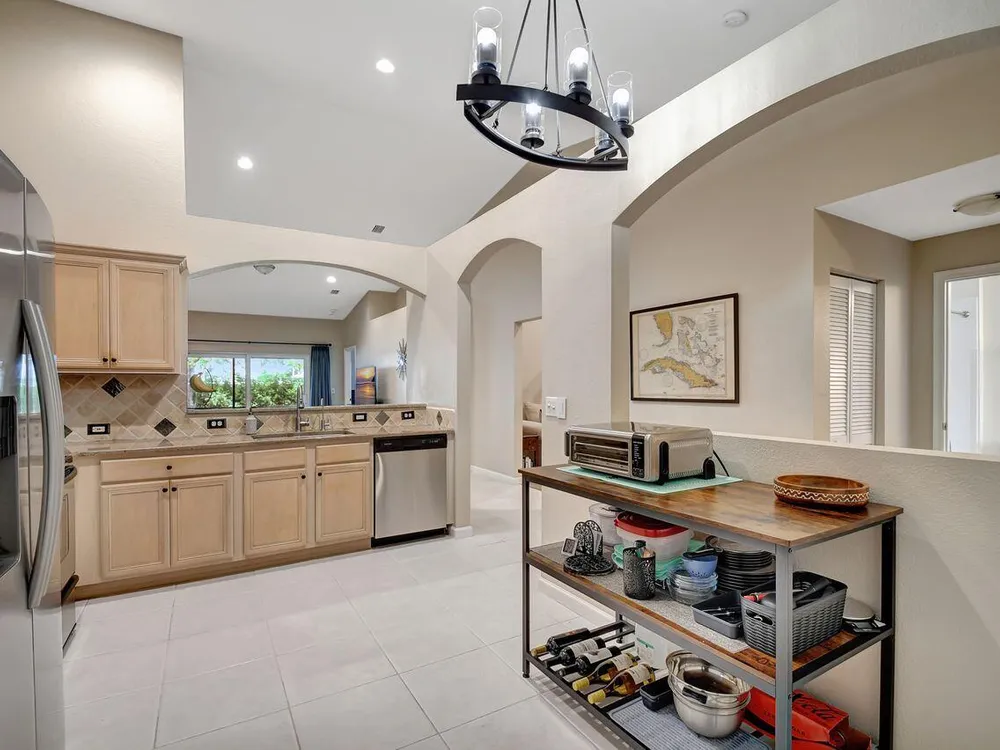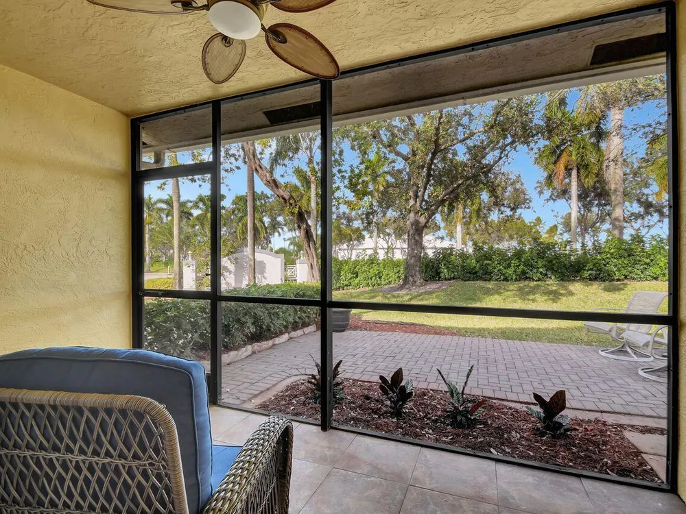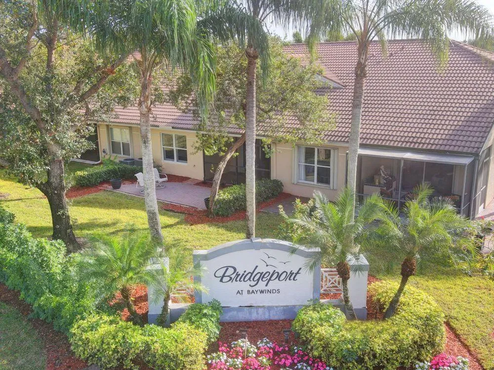 Impact windows & slider (2023), newer A/C, water heater & disposal! Inviting 2BR/2BA villa with den and 1-car garage in Bridgeport at Baywinds. Features include neutral tile floors, open kitchen with tumbled marble backsplash, upgraded light wood cabinetry, separate dining area, and den that can serve as a 3rd bedroom. Vinyl plank floors in bedrooms, fresh paint, plantation shutters, and a screened patio with extended paver area overlooking a serene backyard. Just steps to the clubhouse and pools! Resort-style amenities, cable w/ DVR, internet, landline, ADT, and 24/7 manned gate. Near shopping, dining, beaches, golf, downtown WPB & PBI airport.