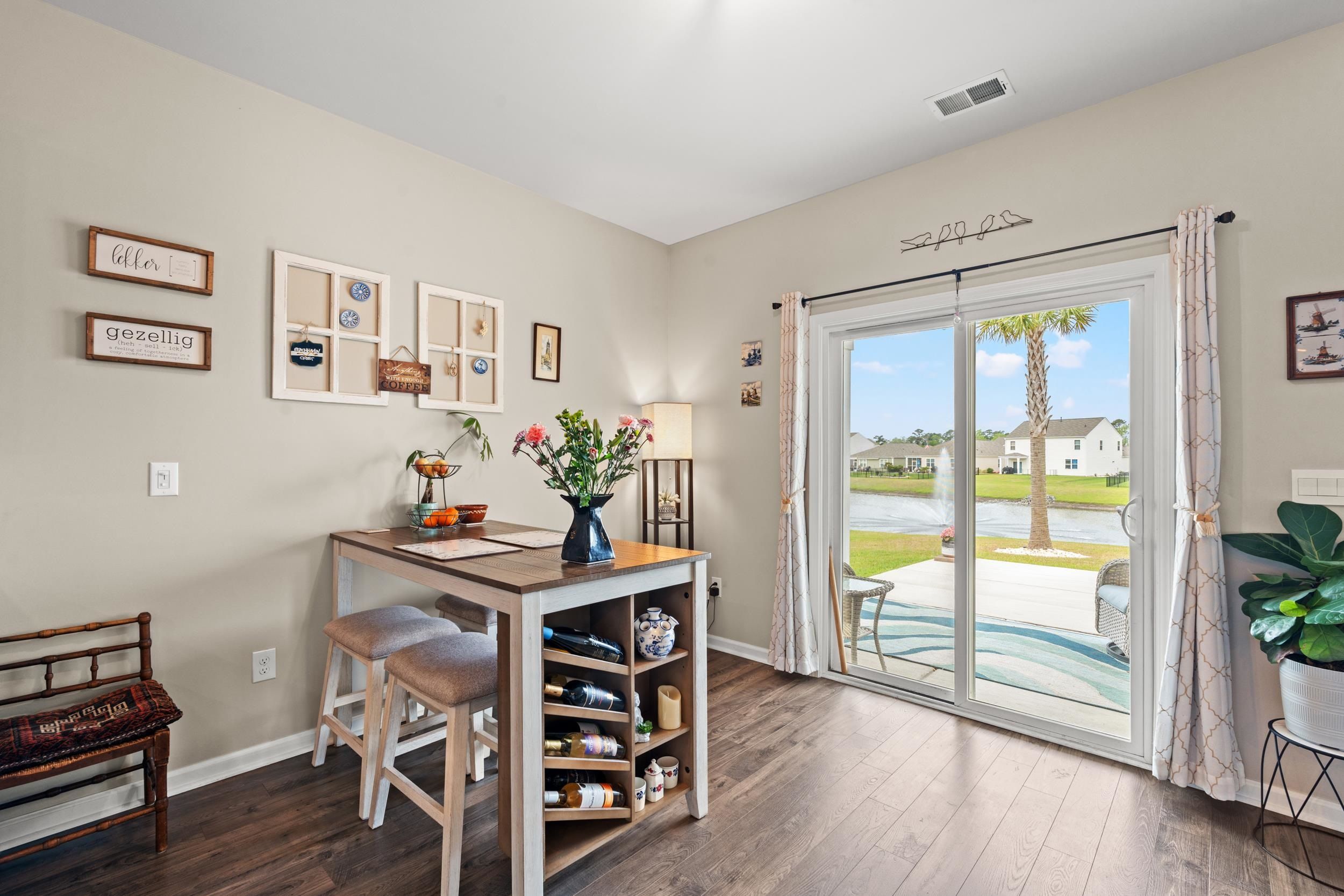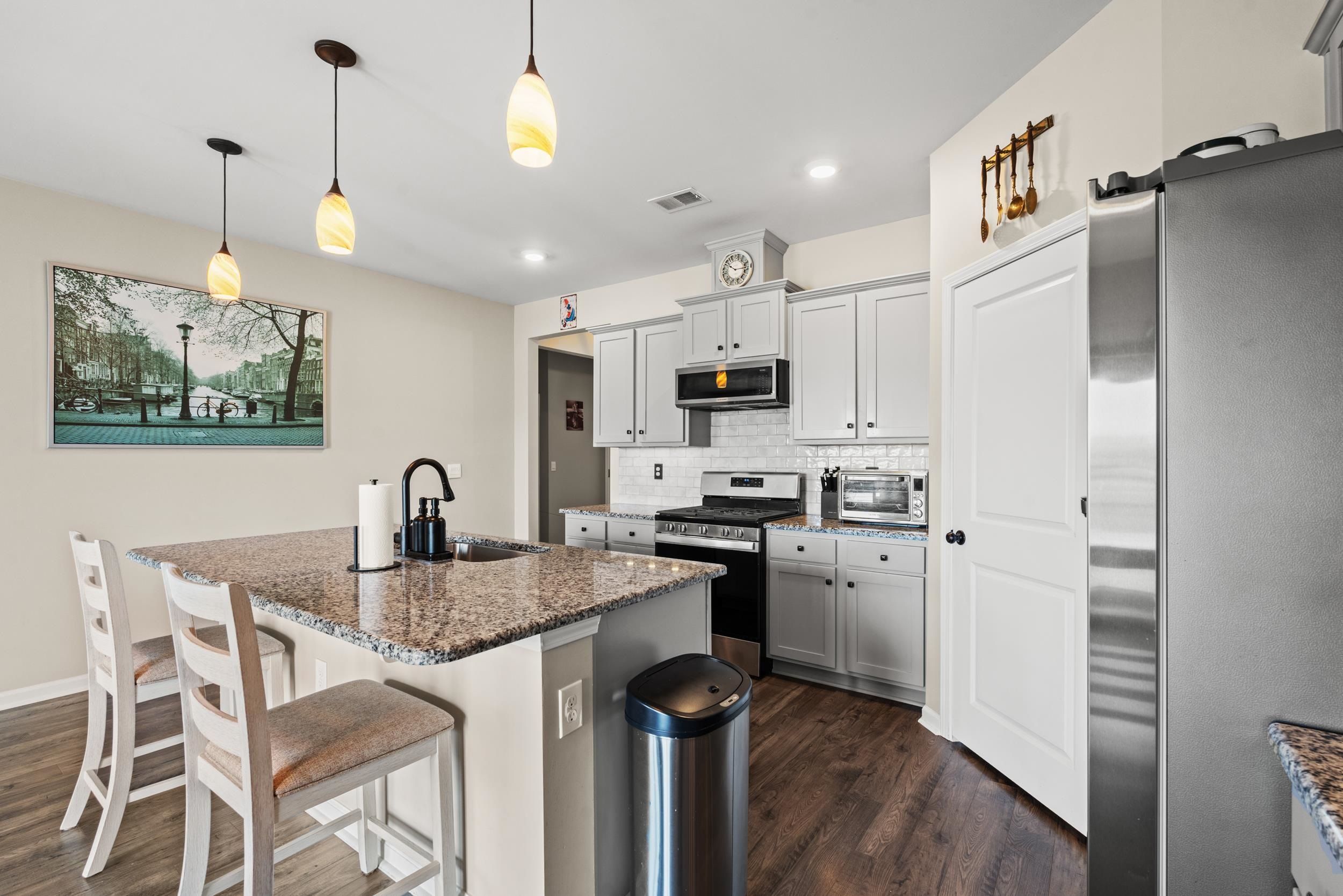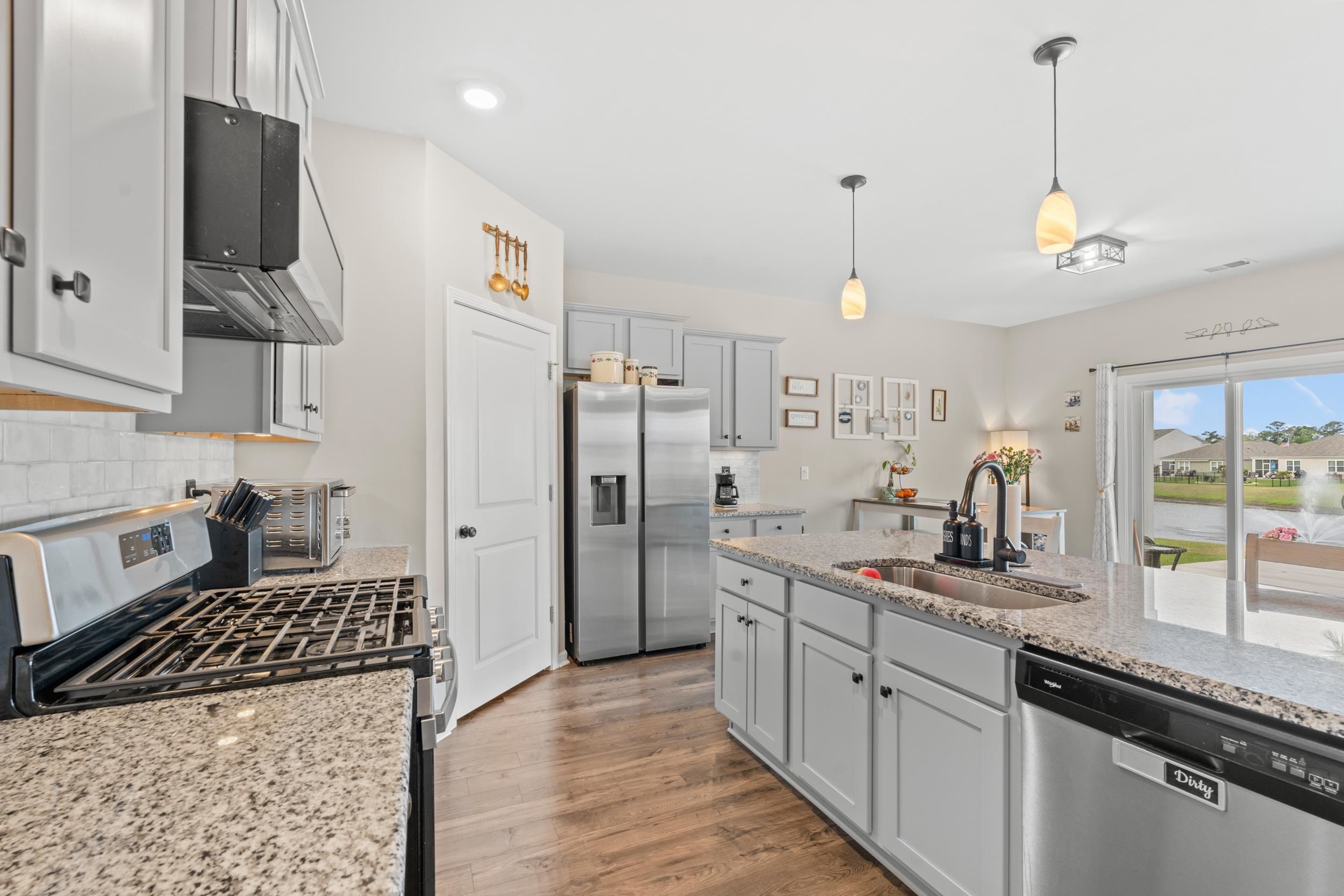This beautiful Cali floor plan is a desirable layout that is one of the best sellers. You'll fall in love with this floor plan in this sought-after natural gas community. This home features an open concept living room and kitchen that are great for entertaining. You will be able to visualize yourself hosting an event from this kitchen featuring stainless steel appliances, including a gas range with a custom stove hood and exterior vent. This home features 9'ceilings, 36" painted cabinets, a tankless water heater, granite countertops, tile backsplash in the kitchen, laminate wood floors flowing throughout the main living space, extended concrete patio overlooking the pond. The garage has been finished, painted and has a polysporic floor. There's a full house surge protector, an automatic sensor for HVAC, and a sprinkler system with a Rain Bird App and sensor.