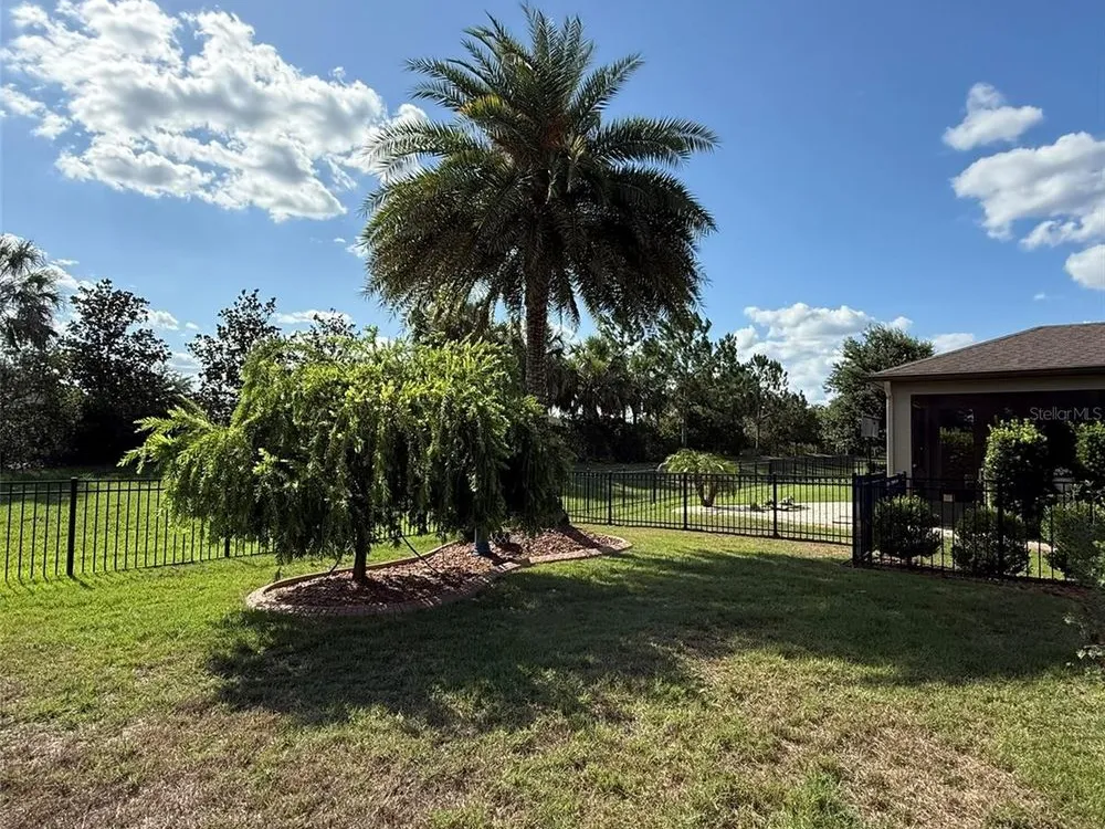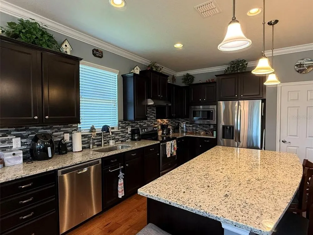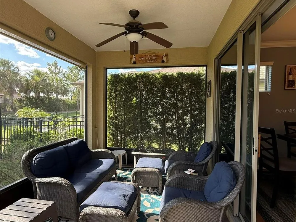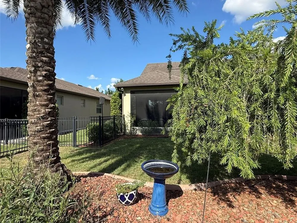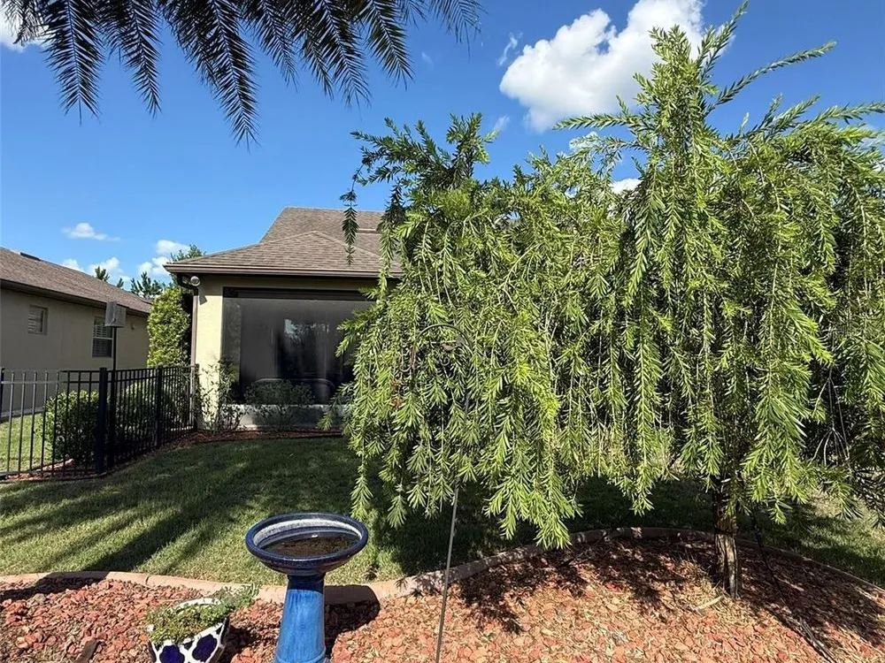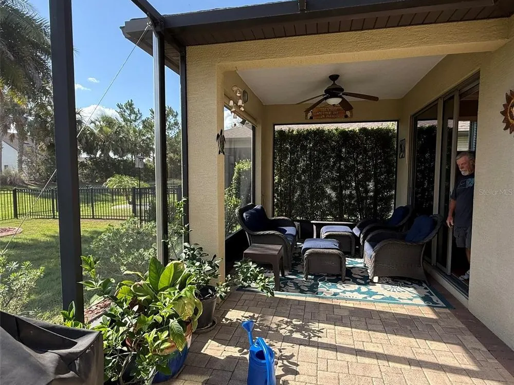If you are looking for the perfect home, take a look at this RARE ONE OWNER Abbeyville model with upgraded elevation and 2nd floor BONUS ROOM. Located in the premier 55+ community of Del Webb Stone Creek. Home is up to date, all the newest designs with granite countertops, expresso color maple cabinets, with all newer appliances. Refrigerator 2024, Stove and microwave have been replaced. Designer backsplash gives the kitchen the perfect touch along with pullout drawers and built in garbage container. Laminate flooring throughout the home, carpet in the bedrooms and tile in the laundry room and bathrooms. Master bedroom is fitted with a double crown tray ceiling and a spacious custom built walk in closet. This home is fitted with so many upgrades, you must see for yourself! Comes with details they don't build anymore, the lovely arch way as you walk in the home gives this home character. All fans stay with the home, coat closet by the stairway close to the garage which is extended by 4 feet, plenty of place for storage, whole house salt water softener and hideaway garage door screen. The front porch is screened and as you walk in you will see the large flex room, perfect for an office, craft and/or man cave! All fans and window coverings stay with the home. Walk upstairs to this bonus room which includes a bedroom, bathroom and living room, operates off a different thermostat then down stairs. This room can provide many options, great for extended family if they need to live with you, fun for company to come stay and can be used for storage. So much natural light in this home, when you walk out the slider doors doors to the screened lanai with added pavers, it feels like a whole new room with an extended bird cage, pavers through out. Plenty of room for patio furniture a grill and more. Walk out the screen door into the huge backyard which is already fenced for your dog(s), fully irrigated with beautiful landscaped bushes and trees and A/C replaced in 2025! All the privacy you could want with flood lights when needed. You can't help but notice the gorgeous landscaping with tree and bushes, added curbing in the backyard and palm tree island in the front yard and designer rocks in the flower beds for added curb appeal. Stone Creek has full calendar of activities every month, sparkling pools that are heated when needed, two club houses with ballrooms, sandwich shop, billiards, library, card rooms, golf simulator, darts and a beer and wine bar. Make new friends and enjoy all the clubs and amenities this community provides. The golf course is surrounded by glittering lakes and ponds that are seen throughout the community and a pier for fishing with on property restaurant and you can golf cart not only inside the community but outside to three different plazas and Sholom Park. Enjoy music at Circle Square Commons just a few minutes ride in the golf cart and grocery shopping is easy and you don't have to take the car! Stone Creek is the most affordable luxury community in the area!