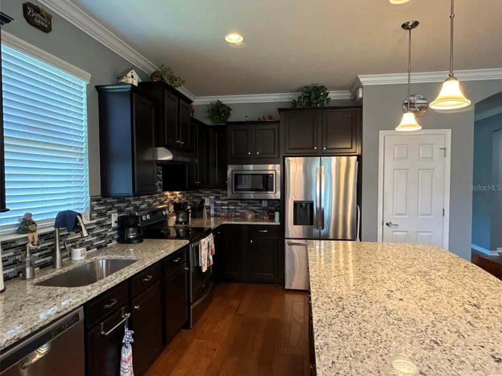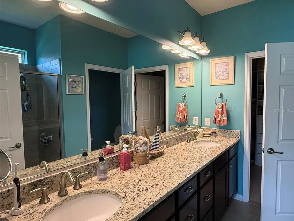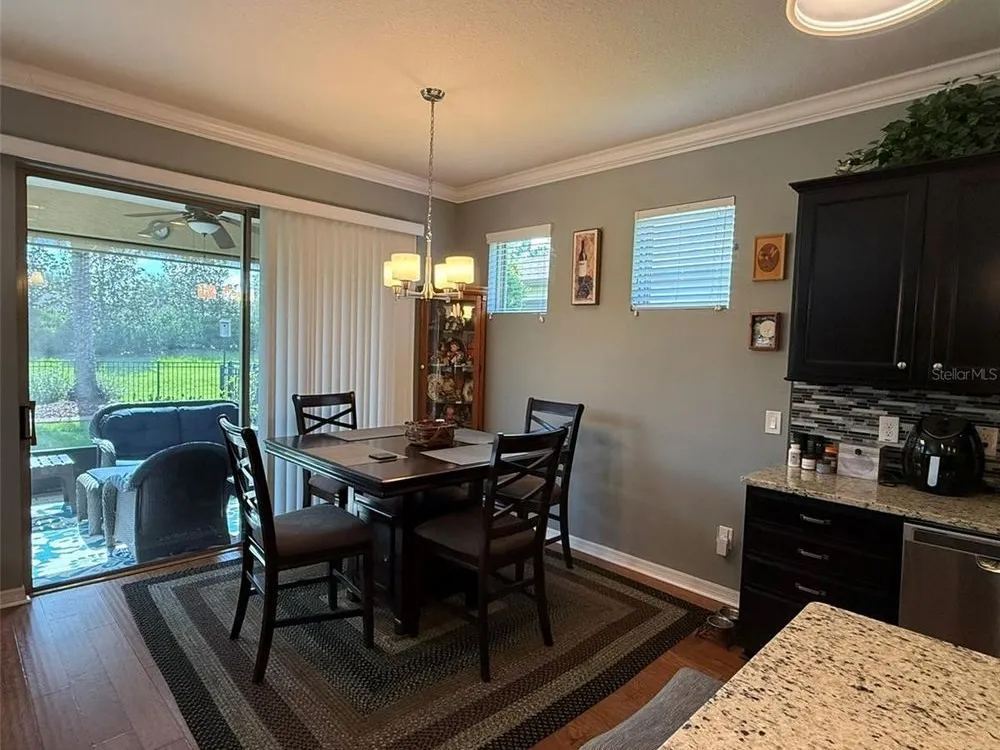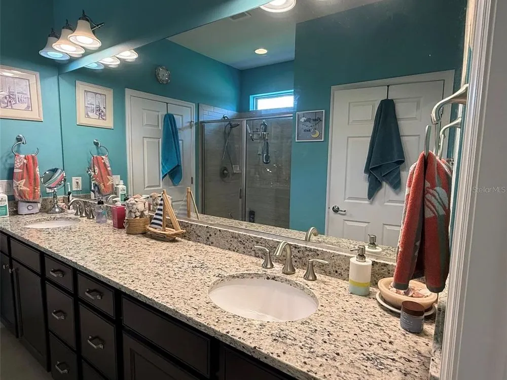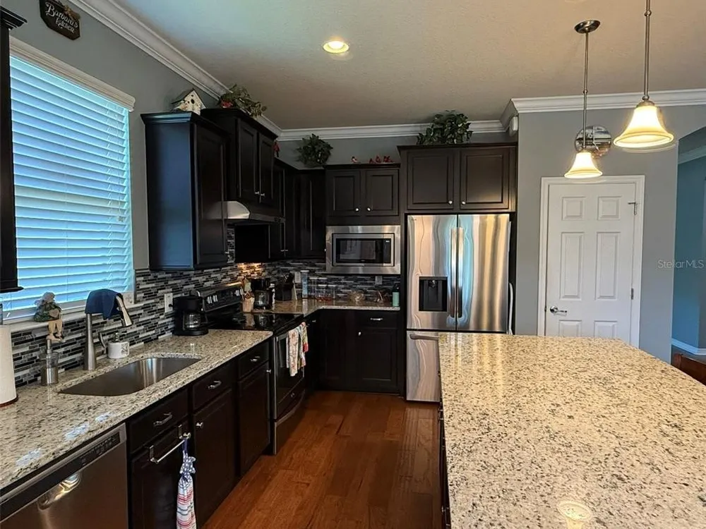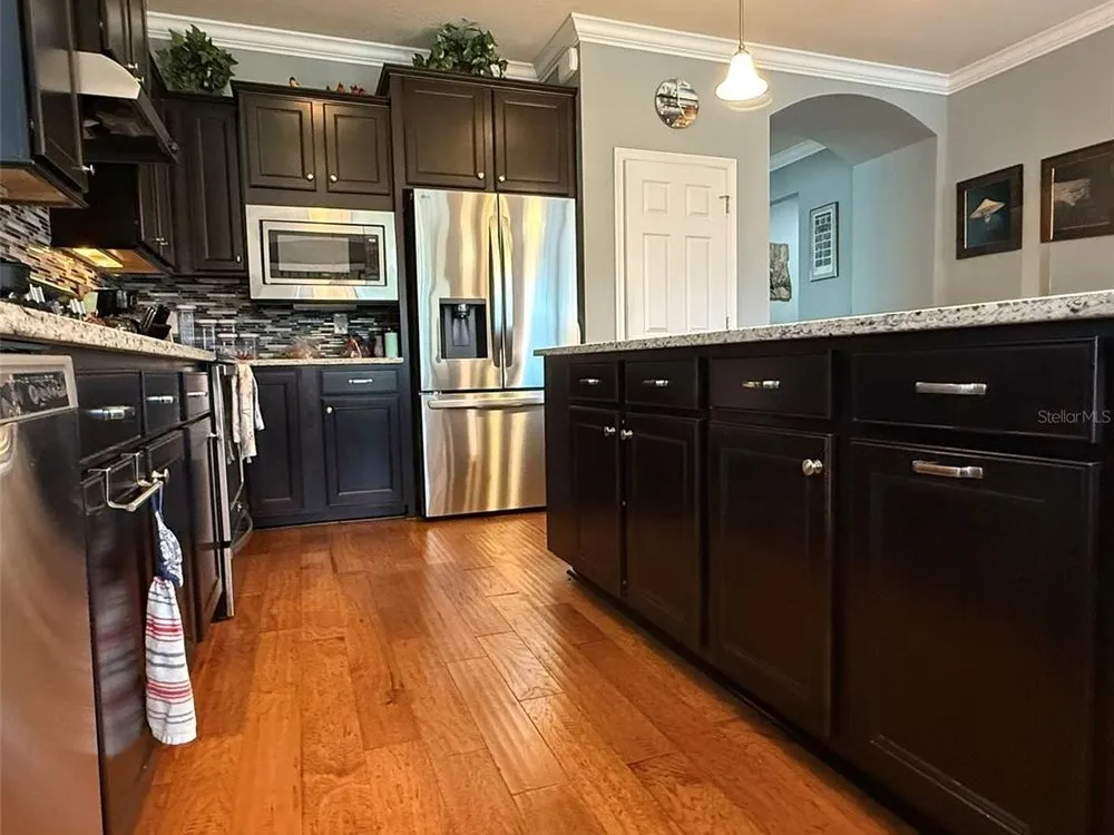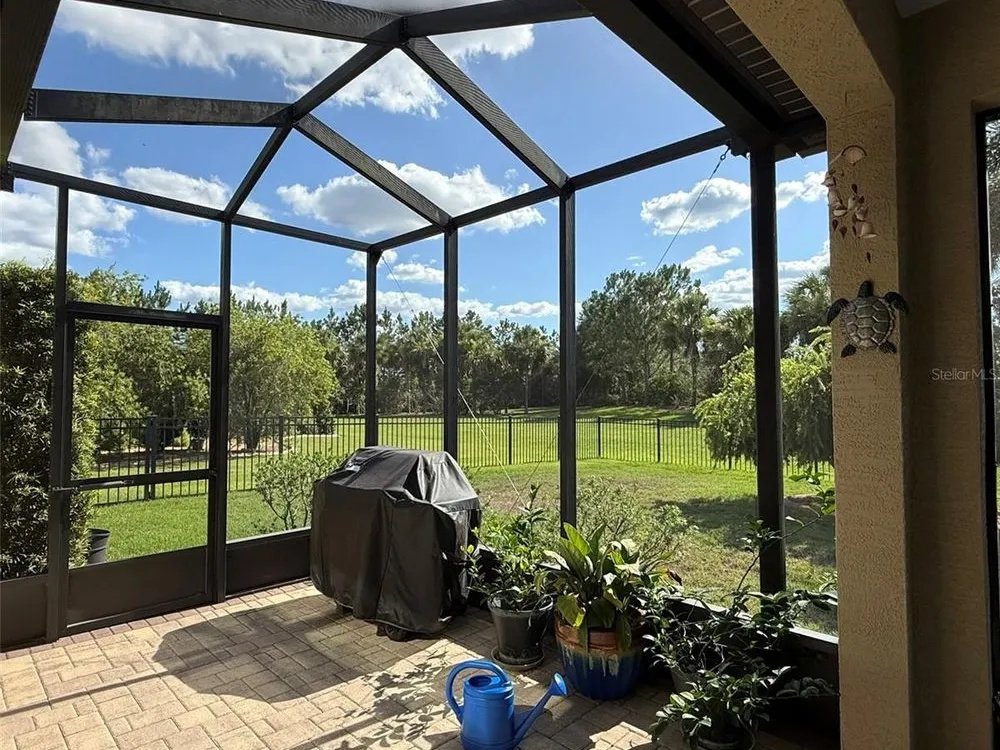 If you are looking for the perfect home, take a look at this RARE ONE OWNER Abbeyville model with upgraded elevation and 2nd floor BONUS ROOM. Located in the premier 55+ community of Del Webb Stone Creek. Home is up to date, all the newest designs with granite countertops, expresso color maple cabinets, with all newer appliances. Refrigerator 2024, Stove and microwave have been replaced. Designer backsplash gives the kitchen the perfect touch along with pullout drawers and built in garbage container. Laminate flooring throughout the home, carpet in the bedrooms and tile in the laundry room and bathrooms. Master bedroom is fitted with a double crown tray ceiling and a spacious custom built walk in closet. This home is fitted with so many upgrades, you must see for yourself! Comes with details they don't build anymore, the lovely arch way as you walk in the home gives this home character. All fans stay with the home, coat closet by the stairway close to the garage which is extended by 4 feet, plenty of place for storage, whole house salt water softener and hideaway garage door screen. The front porch is screened and as you walk in you will see the large flex room, perfect for an office, craft and/or man cave! All fans and window coverings stay with the home. Walk upstairs to this bonus room which includes a bedroom, bathroom and living room, operates off a different thermostat then down stairs. This room can provide many options, great for extended family if they need to live with you, fun for company to come stay and can be used for storage. So much natural light in this home, when you walk out the slider doors doors to the screened lanai with added pavers, it feels like a whole new room with an extended bird cage, pavers through out. Plenty of room for patio furniture a grill and more. Walk out the screen door into the huge backyard which is already fenced for your dog(s), fully irrigated with beautiful landscaped bushes and trees and A/C replaced in 2025! All the privacy you could want with flood lights when needed. You can't help but notice the gorgeous landscaping with tree and bushes, added curbing in the backyard and palm tree island in the front yard and designer rocks in the flower beds for added curb appeal. Stone Creek has full calendar of activities every month, sparkling pools that are heated when needed, two club houses with ballrooms, sandwich shop, billiards, library, card rooms, golf simulator, darts and a beer and wine bar. Make new friends and enjoy all the clubs and amenities this community provides. The golf course is surrounded by glittering lakes and ponds that are seen throughout the community and a pier for fishing with on property restaurant and you can golf cart not only inside the community but outside to three different plazas and Sholom Park. Enjoy music at Circle Square Commons just a few minutes ride in the golf cart and grocery shopping is easy and you don't have to take the car! Stone Creek is the most affordable luxury community in the area!