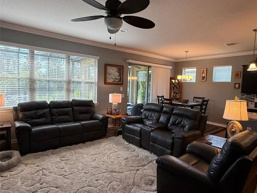 - Ceiling Fan(s), Crown Molding, High Ceilings, Open Floorplan, In-Wall Pest Control, Main Level Primary, Stone Counters, Thermostat, Walk-In Closet(s), Window Treatments