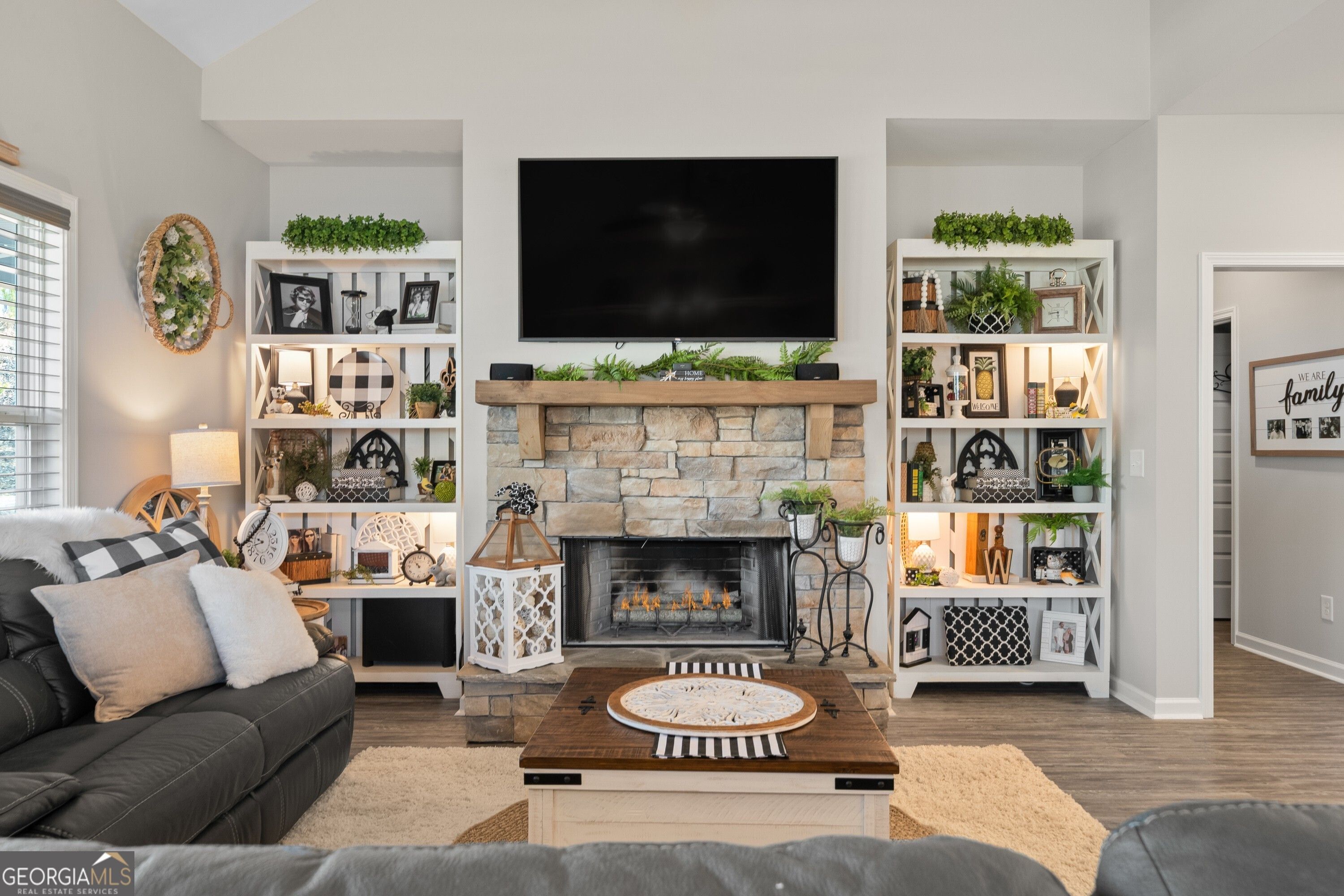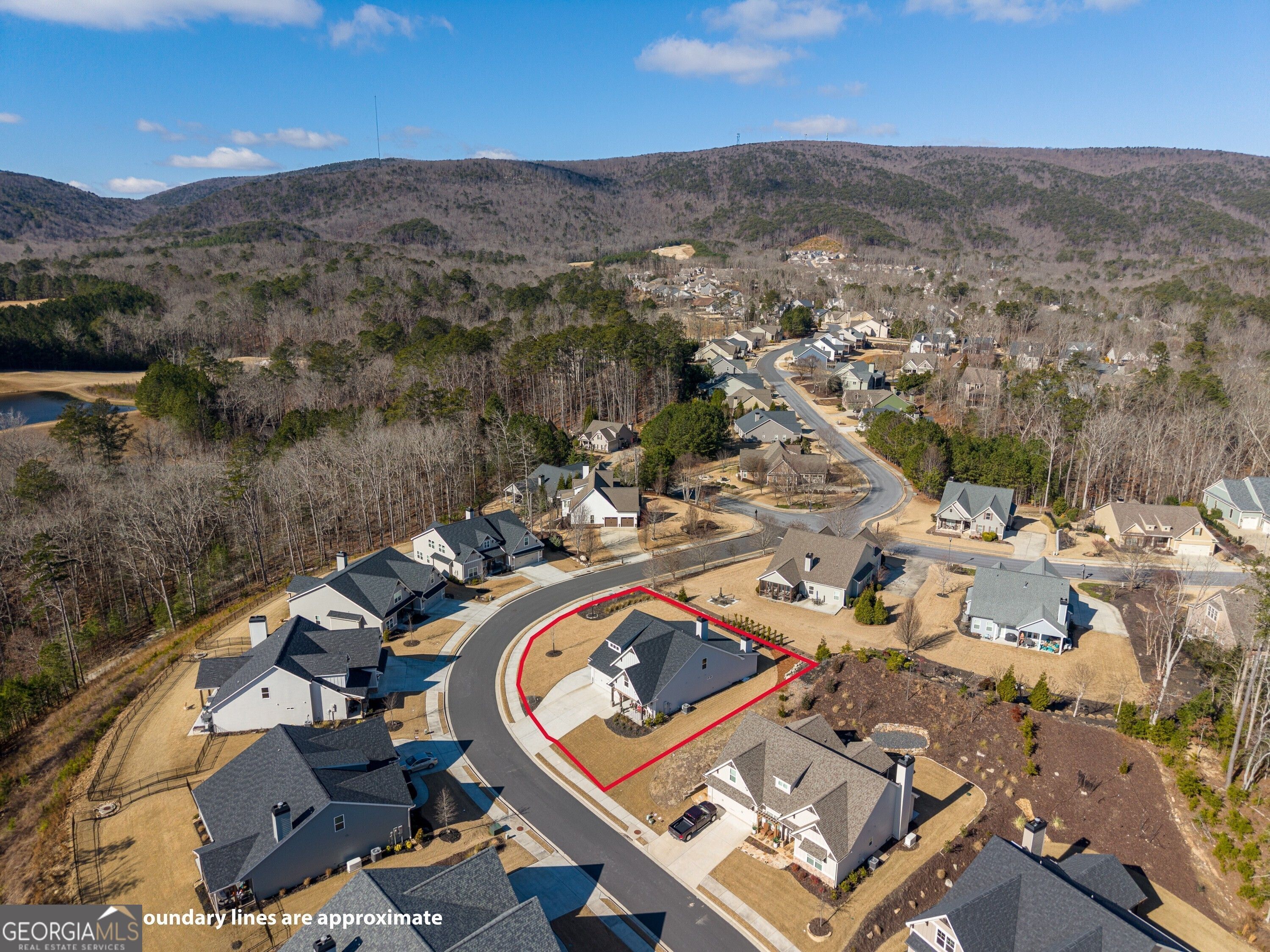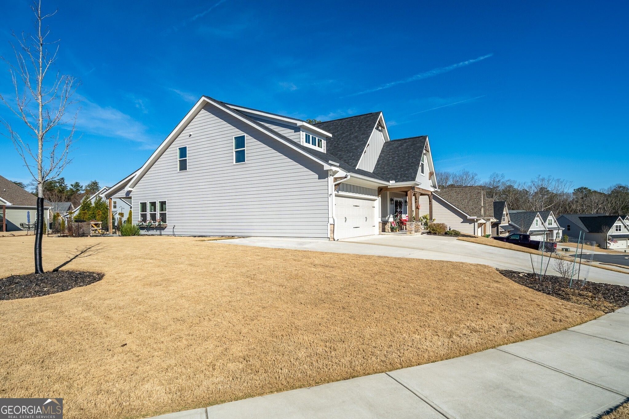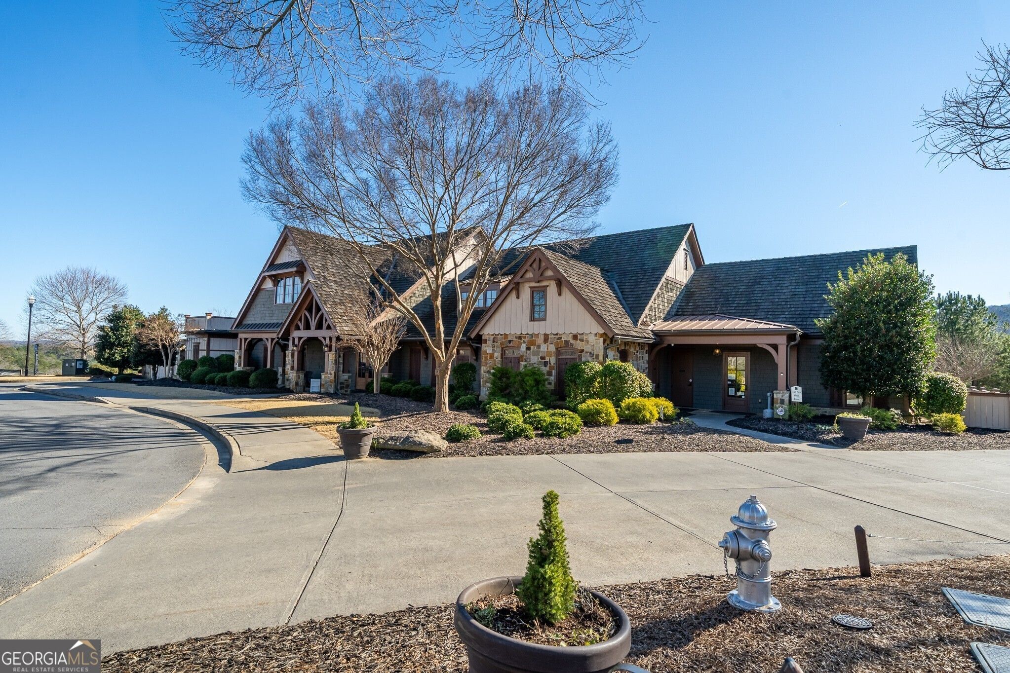Welcome home to this beautifully built Craftsman-style residence, perfectly positioned on a quiet cul-de-sac with mountain views and within walking distance of the golf course and clubhouse in the sought-after Lake Arrowhead community. From the moment you arrive, the setting invites you to slow down and enjoy the lifestyle this gated community is known for. Step inside to a welcoming foyer, where a hall closet provides convenient storage. Just off the entry is a main-level bedroom and full bathroom, ideal for guests, a teen suite, or in-law living. As you move forward, the home opens into a bright and airy open concept living space, anchored by a spacious kitchen designed for both everyday living and entertaining. The kitchen features quartz countertops, under-cabinet lighting, an oversized island with the sink, and is pre-wired for pendant lighting. A separate food pantry offers excellent storage, and the flow into the dining and family areas keeps everyone connected. The primary suite on the main level is thoughtfully placed near the laundry room for added convenience. The primary bathroom offers an oversized shower, a private toilet room with a built-in jewelry/necklace holder behind the door, and a well-designed walk-in closet with shoe shelving and hanging storage. Matte black fixtures throughout the home add a modern, cohesive touch. Off the kitchen and leading toward the garage is a practical mudroom/drop zone, perfect for daily comings and goings. Step outside to the back patio to enjoy a wood-burning outdoor fireplace with built-in shelving, creating a cozy space for relaxing or entertaining, while nearby plant window boxes add charm to the outdoor setting. Upstairs, you'll find a versatile loft area that leads to two additional bedrooms, one full bathroom, a closet large enough to step into, and an additional partially finished room with built-in shelves currently being used for storage. One of the two upstairs bedrooms features corner windows with mountain views and is currently being used as an office but could easily serve as a bedroom. The other bedroom features a large walk-in closet and attic access for additional storage, while the full bathroom is conveniently accessible from the loft. Located in Lake Arrowhead, residents enjoy access to hiking trails, the lake and marina, pickleball and tennis courts, Red Cloud Park, a dog park, Highlands Golf Course, clubhouse amenities, and a full calendar of social activities. Whether you're looking for a full-time residence or a mountain retreat, this home offers comfort, quality construction, and a true lifestyle experience