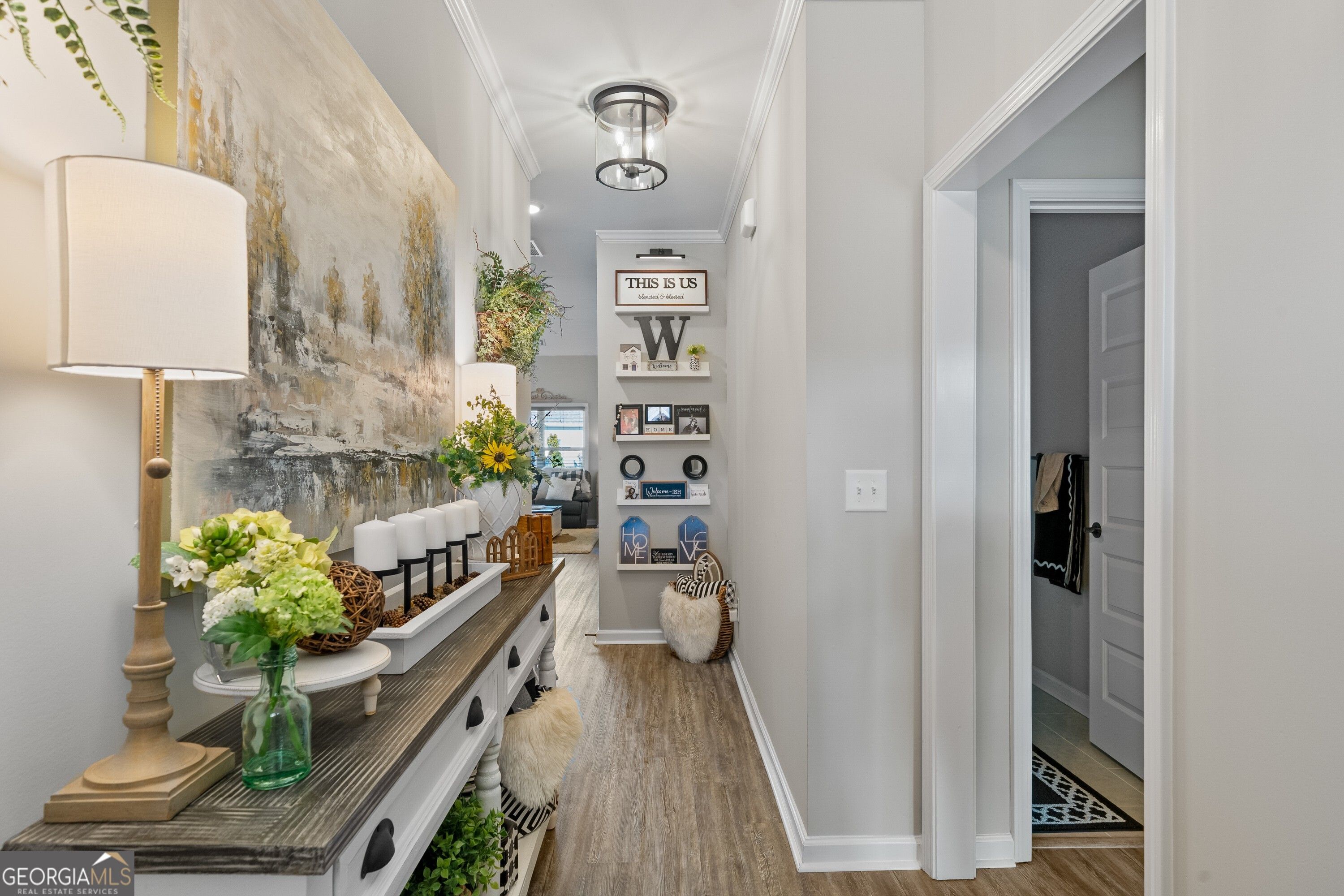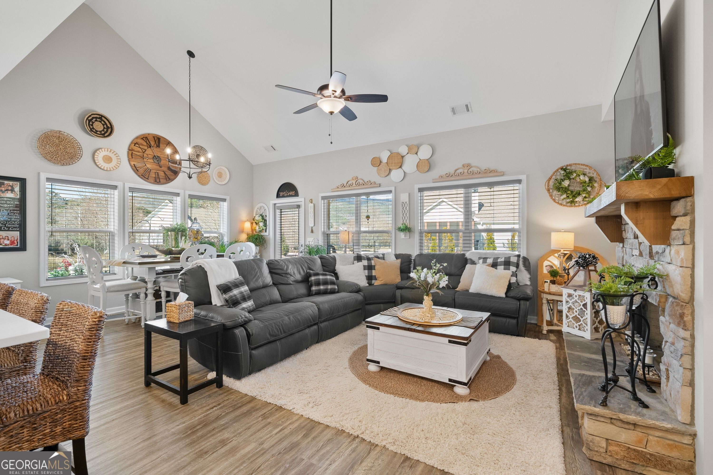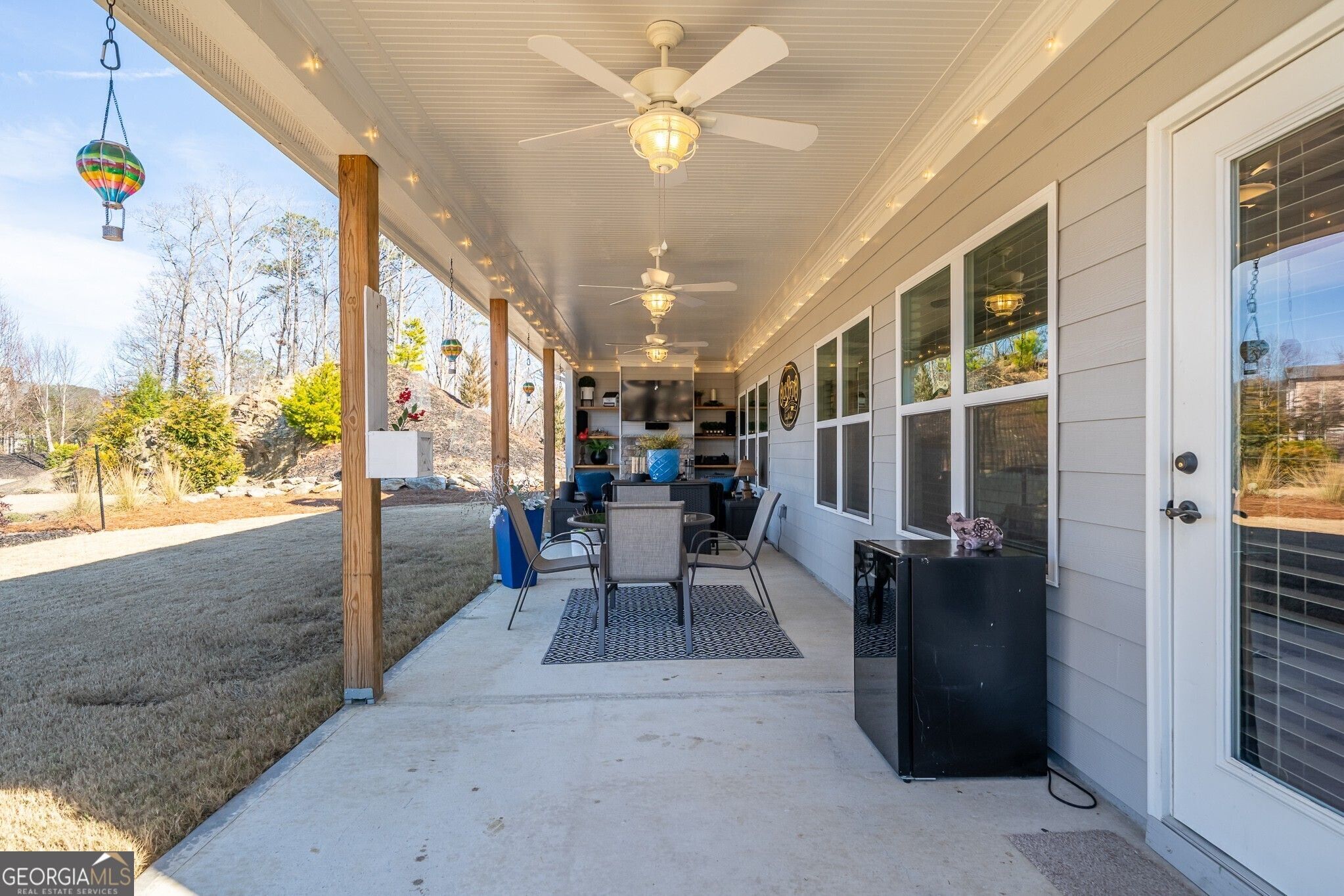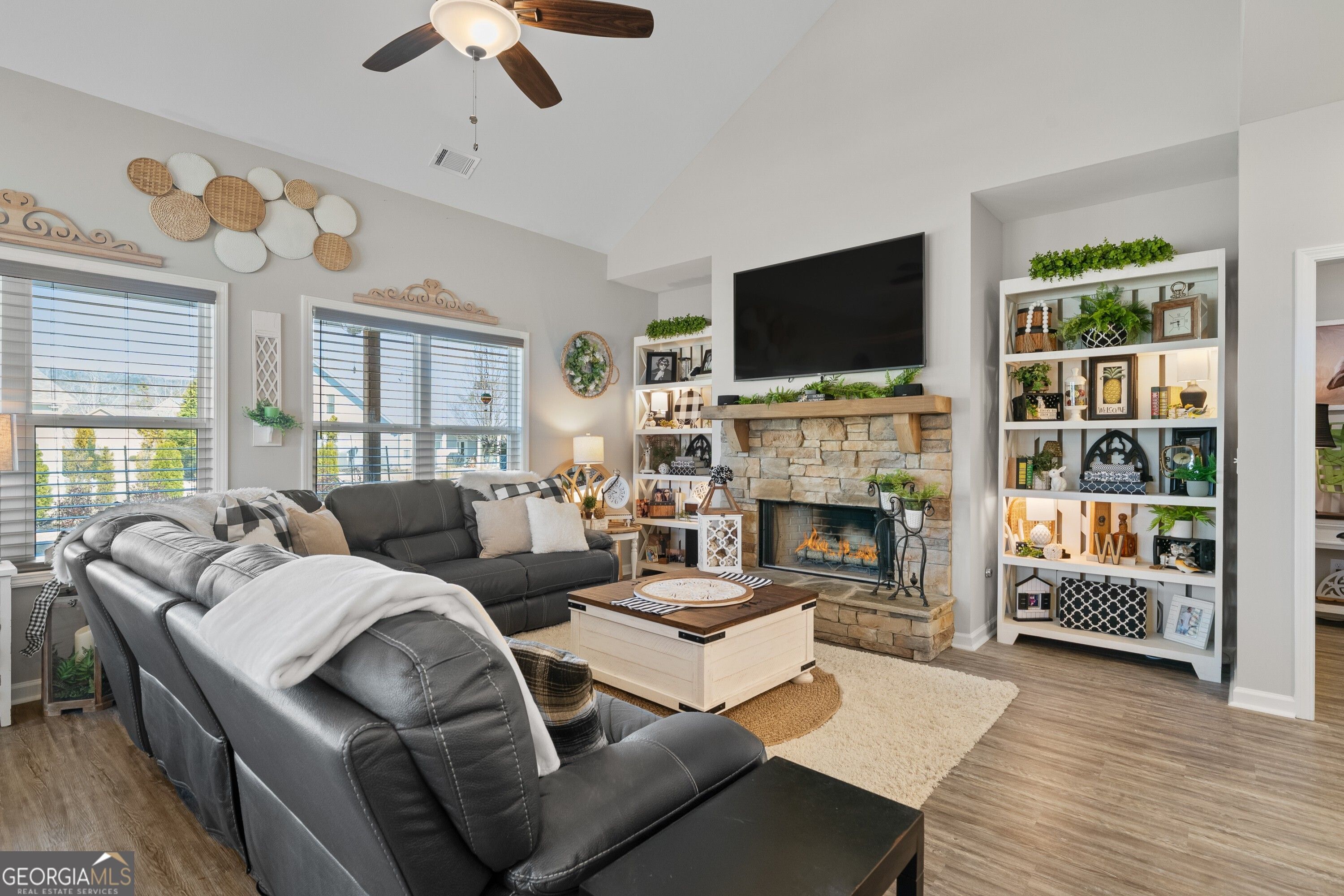 Welcome home to this beautifully built Craftsman-style residence, perfectly positioned on a quiet cul-de-sac with mountain views and within walking distance of the golf course and clubhouse in the sought-after Lake Arrowhead community. From the moment you arrive, the setting invites you to slow down and enjoy the lifestyle this gated community is known for. Step inside to a welcoming foyer, where a hall closet provides convenient storage. Just off the entry is a main-level bedroom and full bathroom, ideal for guests, a teen suite, or in-law living. As you move forward, the home opens into a bright and airy open concept living space, anchored by a spacious kitchen designed for both everyday living and entertaining. The kitchen features quartz countertops, under-cabinet lighting, an oversized island with the sink, and is pre-wired for pendant lighting. A separate food pantry offers excellent storage, and the flow into the dining and family areas keeps everyone connected. The primary suite on the main level is thoughtfully placed near the laundry room for added convenience. The primary bathroom offers an oversized shower, a private toilet room with a built-in jewelry/necklace holder behind the door, and a well-designed walk-in closet with shoe shelving and hanging storage. Matte black fixtures throughout the home add a modern, cohesive touch. Off the kitchen and leading toward the garage is a practical mudroom/drop zone, perfect for daily comings and goings. Step outside to the back patio to enjoy a wood-burning outdoor fireplace with built-in shelving, creating a cozy space for relaxing or entertaining, while nearby plant window boxes add charm to the outdoor setting. Upstairs, you'll find a versatile loft area that leads to two additional bedrooms, one full bathroom, a closet large enough to step into, and an additional partially finished room with built-in shelves currently being used for storage. One of the two upstairs bedrooms features corner windows with mountain views and is currently being used as an office but could easily serve as a bedroom. The other bedroom features a large walk-in closet and attic access for additional storage, while the full bathroom is conveniently accessible from the loft. Located in Lake Arrowhead, residents enjoy access to hiking trails, the lake and marina, pickleball and tennis courts, Red Cloud Park, a dog park, Highlands Golf Course, clubhouse amenities, and a full calendar of social activities. Whether you're looking for a full-time residence or a mountain retreat, this home offers comfort, quality construction, and a true lifestyle experience