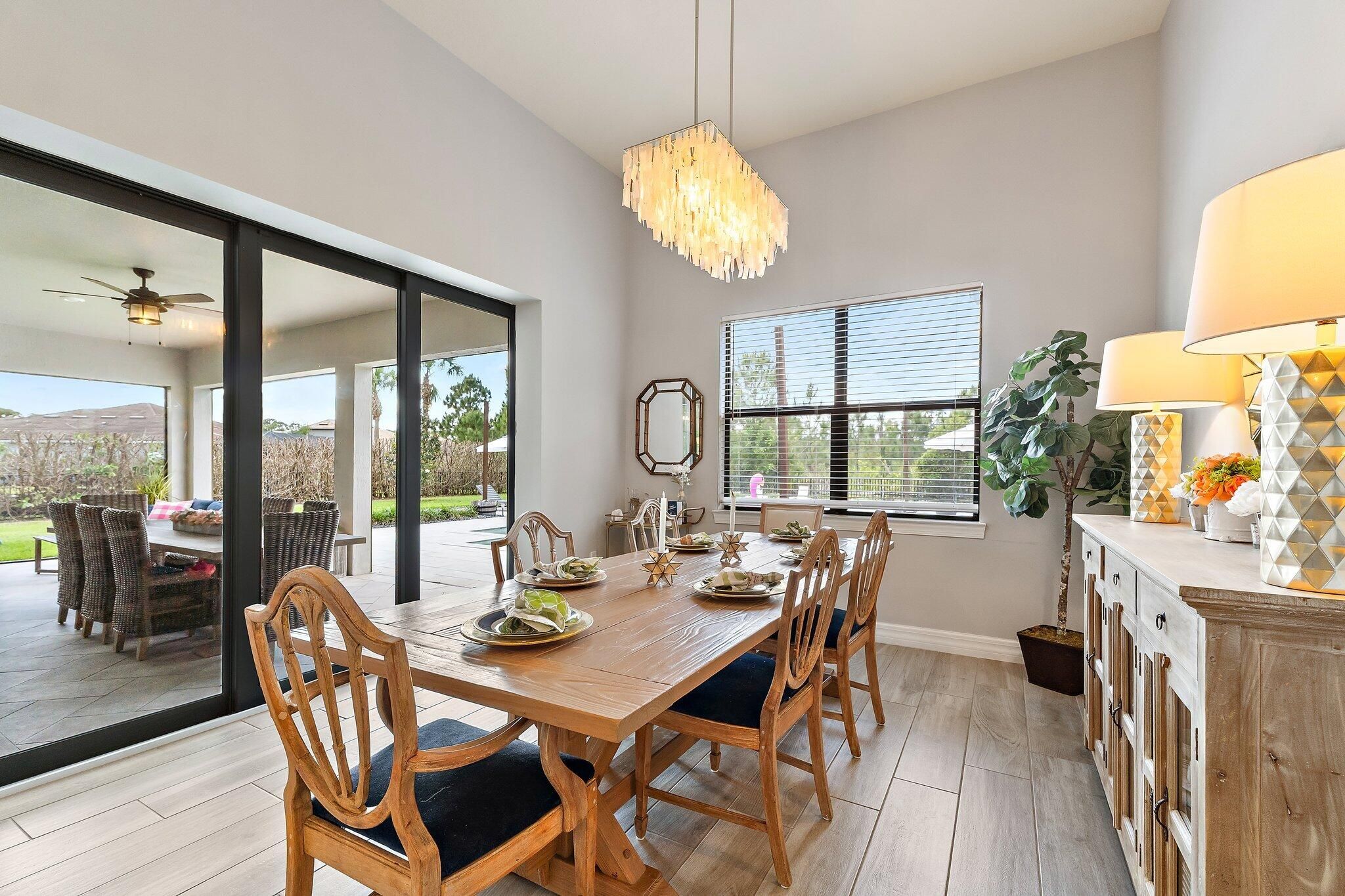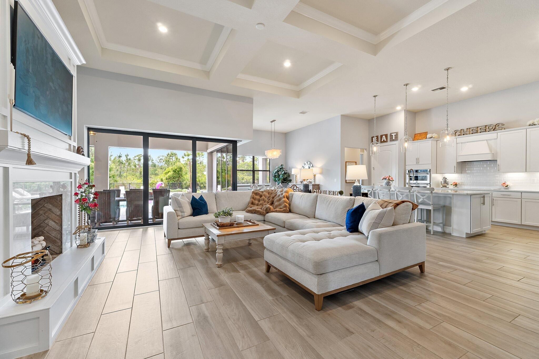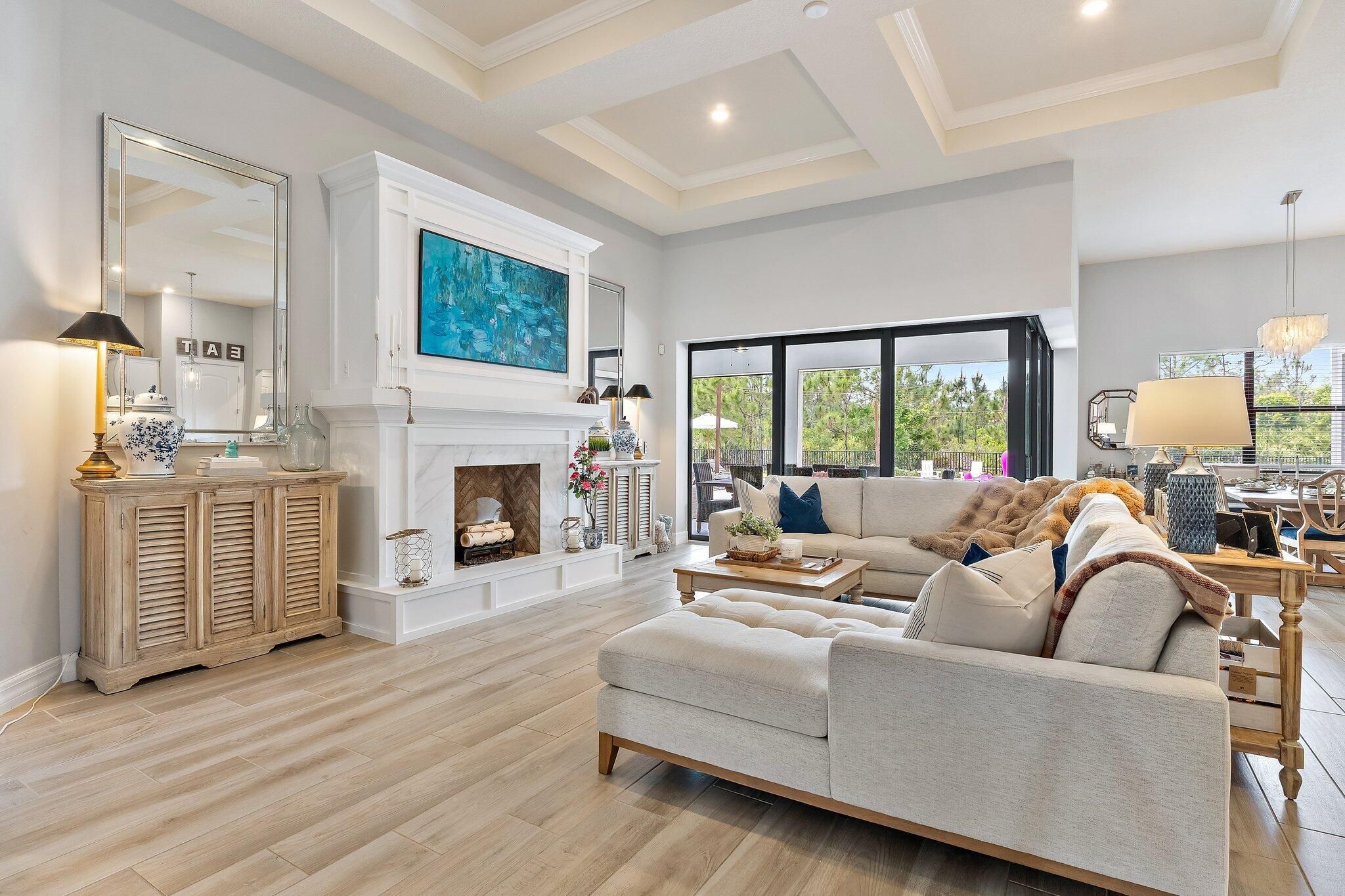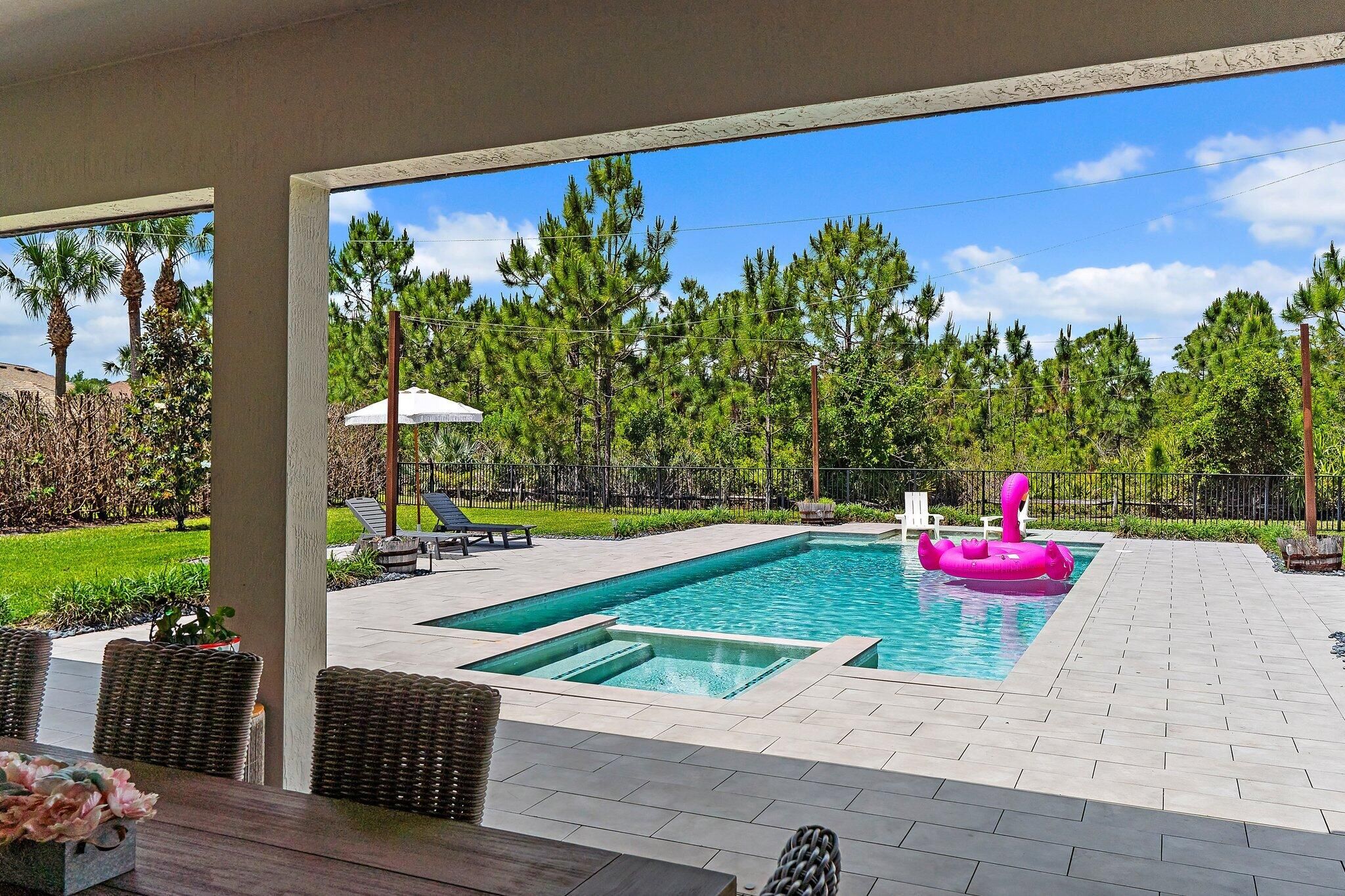 4 bed/3 bath + den preserve-view luxury on a rare .58-acre fully fenced homesite in Phase 4 of Copperleaf's exclusive private gated enclave with rear gate access. Solid CBS construction with impact windows and doors, dramatic zero-corner pocketing impact sliders that open fully to a resort-caliber outdoor retreat. Inside, the home continues to impress with a sophisticated open layout, coffered ceiling in great room, newly installed 12x60 wood-look tile flooring in the bedrooms, and a 2023 built-out electric fireplace that adds warmth and contemporary elegance. The kitchen is beautifully appointed with an upgraded beverage center, induction cooktop, and a new refrigerator (2025). The primary suite is elevated by a tray ceiling and dual walk-in closets, offering a luxurious retreat within the home. The oversized laundry room features a new washer and dryer (2025), and additional space to convert to a hobby room / storage space. Step outside to your own private sanctuary, where an oversized 16x33 pool, 7x7 spa, cabana bath, new salt cell system, and expansive lanai with motorized screens create the ultimate setting for refined relaxation and entertaining. Framed by serene preserve views, the outdoor space offers a rare combination of beauty, privacy, and functionality. Additional highlights include a freshly painted exterior (2025), full epoxy garage floor, and an extended roof warranty with 3 years remaining. Copperleaf is an upscale gated community in the heart of Palm City. With its resort style amenities, Fitness Center updated in 2025, Clubhouse Renovated 2025 with modern finishes, Library, Tennis/Pickleball courts, and a Basketball hoop. This community offers monthly activities such as Food Truck Nights, Game Nights, Community BBQ's, Visits from Easter Bunny, and Santa making this a wonderful community, fun for all ages. Located within an A-rated Martin County school district and offering easy access to I-95 and the Florida Turnpike. This remarkable home combines exclusivity, elegance, and convenience in one extraordinary package. **Landscaping around pool being revamped next week and will update photos**