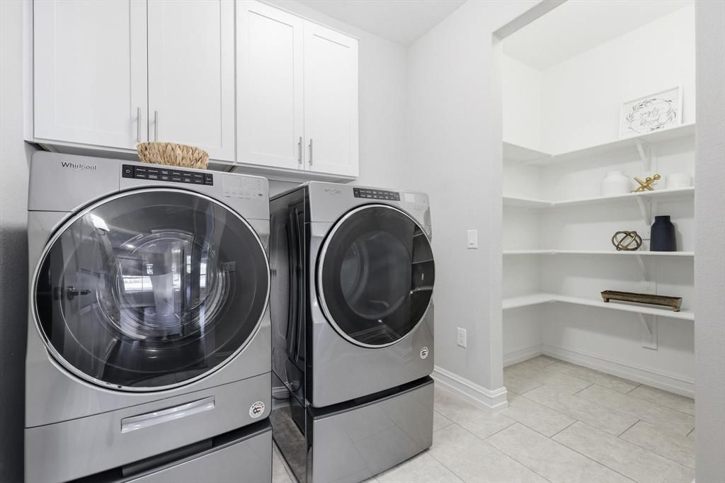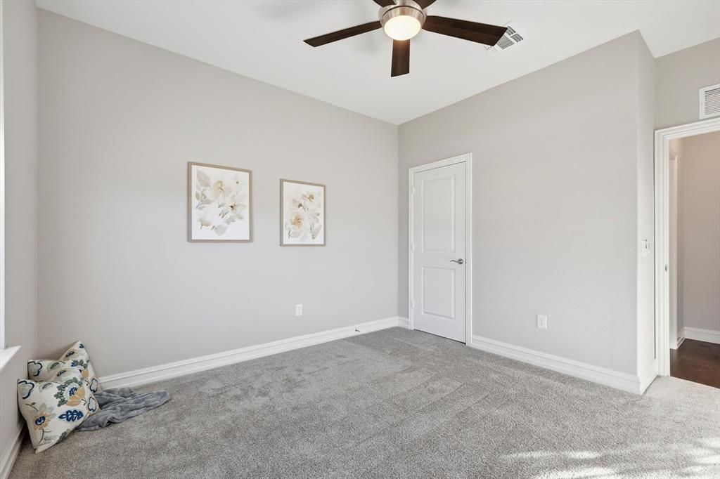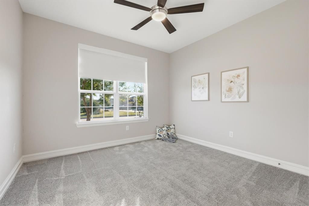 One of the very best lots available - The gorgeous views out the back windows of trails, trees, blue sky and open space - No houses behind. Welcome to this pristine, move-in-ready Abbeyville floor plan located in the sought-after 55+ community of Del Webb at Trinity Falls. Thoughtfully designed for low-maintenance living, this home blends elegant design with everyday comfort. Step inside through a decorative glass and iron front door to discover a bright open layout with rich Colton Maple hardwood floors and designer finishes throughout. The gourmet kitchen showcases 42-inch white maple cabinetry, Silestone Ocean Jasper quartz countertops, stainless steel appliances, brushed-nickel pendants, and a white 3×12 subway-tile backsplash. The adjoining sunroom offers a perfect spot for morning coffee or relaxed evenings, while the flex room serves as a versatile office or den. The primary suite features dual sinks, quartz counters, and a large walk-in closet. Additional highlights include a mud bench entry, laundry room with matching cabinetry, tankless water heater, and ceiling fans throughout. The home is positioned on a premium lot offering added privacy and tranquil views of the nearby green space and walking trail. Residents enjoy resort-style amenities including a clubhouse with fitness center, resort-style pools, pickleball and bocce courts, a dog park, fishing ponds, and miles of scenic walking and biking trails. Experience luxury and community in this beautifully appointed Abbeyville home.