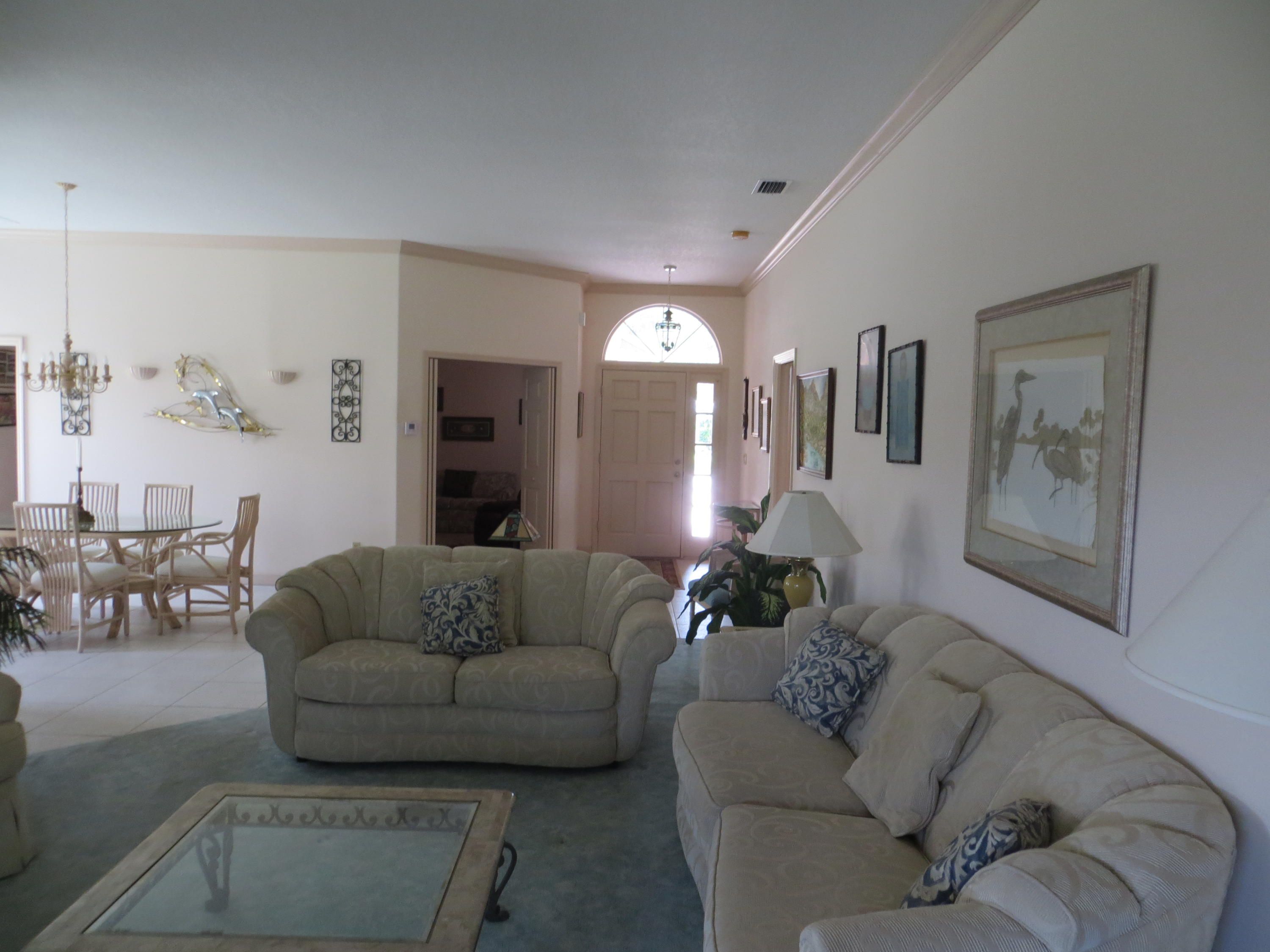 Gorgeous Meadowood Golf Community! On the golf course. Expanded floor plan with high ceilings, clerestory windows and incredible golf course views. Have you been dreaming about relocating to sunny Florida? This home feels super spacious with an open floor plan and tons of natural light. With a huge master bedroom with large ensuite bath, large closets in every bedroom and the most peaceful setting you could ever imagine, this could be the one. The kitchen opens to a lovely eat in area overlooking the golf course and even includes a pantry closet with loads of shelves for ample storage. Roof 2021, HVAC 2024. HOA provides excellent value with a manned security gate, cable, wifi and water included. The enormous, screened lanai provides plenty of space for grilling and outdoor enjoyment.