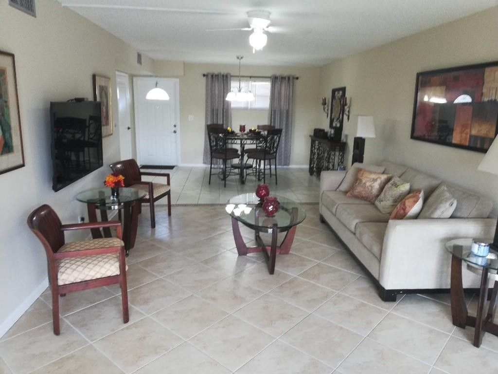 Neighborhood: -55+ Gated community with 24-hour roving patrol -Golf: 18-hole PGA championship course and 18-hole executive course, putting green and driving range Apartment features: 2 BEDROOM 1 ½ Bathroom 3rd floor APARTMENT, FULLY FurnishedBeautiful Upgraded Eat-in Kitchen and bathrooms. Freshly painted throughout.Master BEDROOM includes full en-suite bathroom, large walk-in closet, ceiling fan and window treatments. AIR CONDITIONING THROUGHOUT. Tiled throughout except Master bedroom.Enclosed patio with Garden view **FREE MEMBERSHIP**-4 Tennis Courts: 6 soft courts, 8 hard courts. Tennis pro and ball machine available-4 Pickleball and Bocci courts-7 heated swimming pools with Sauna and covered BBQ grills and picnic area. -Multiple Shuffleboard courts-Full Gym: Weight room, Cybex equipment, Treadmills, Ellipticals, Recumbent bikes and a Stair Master.-Playhouse /Club house: Theater, 2 professional Pool tables, two professional table tennis tables, library, Game rooms, conference rooms-Full-Service Restaurant overlooking golf course.-Electric Vehicle Charging Stations and Vehicle wash Area.-Pet Friendly!-Courtesy Bus provides free transportation for shopping and to some restaurants.