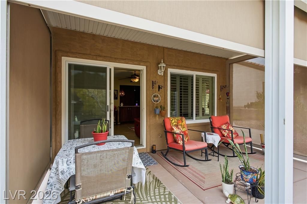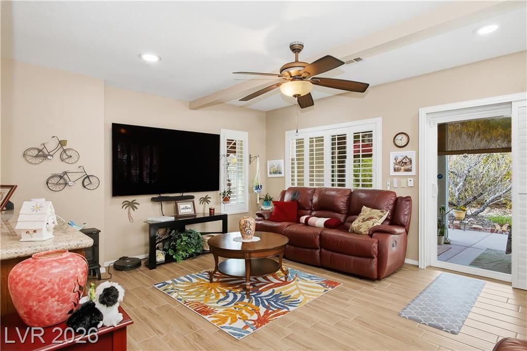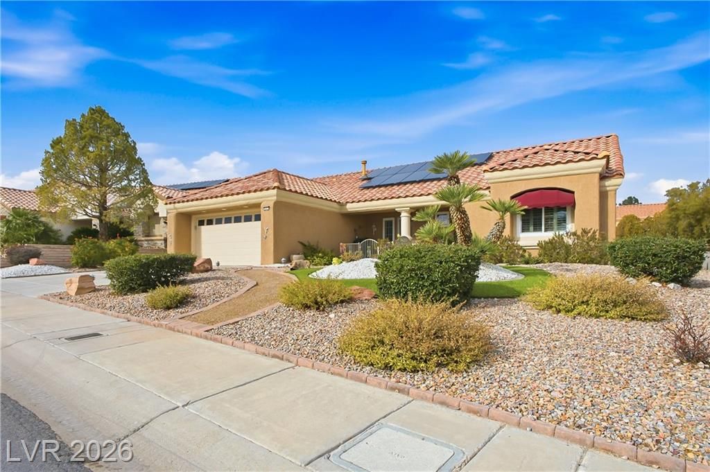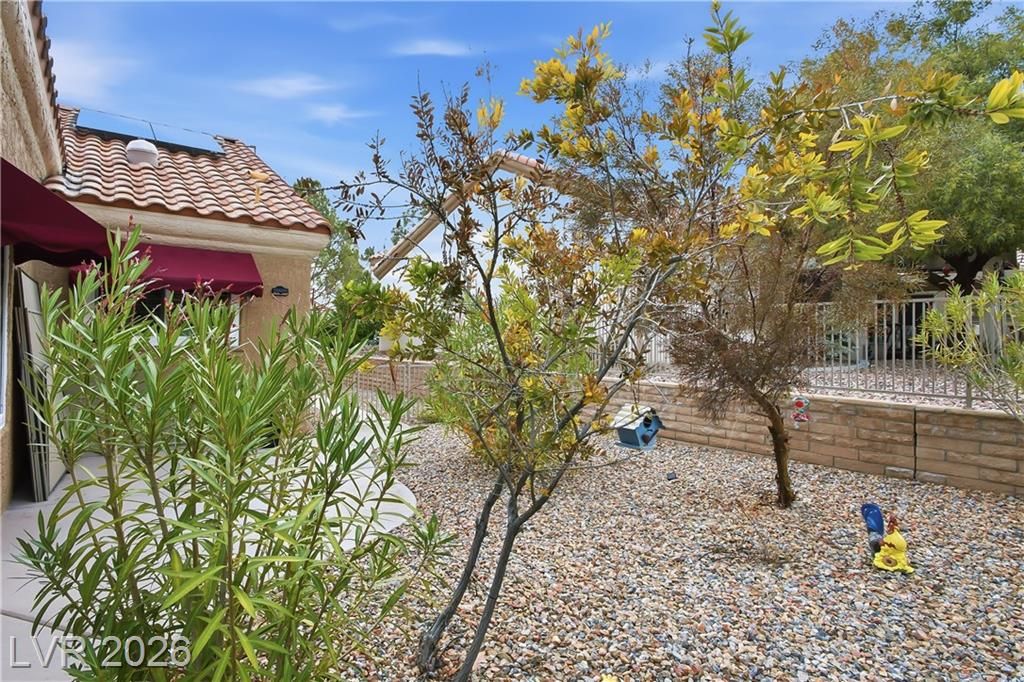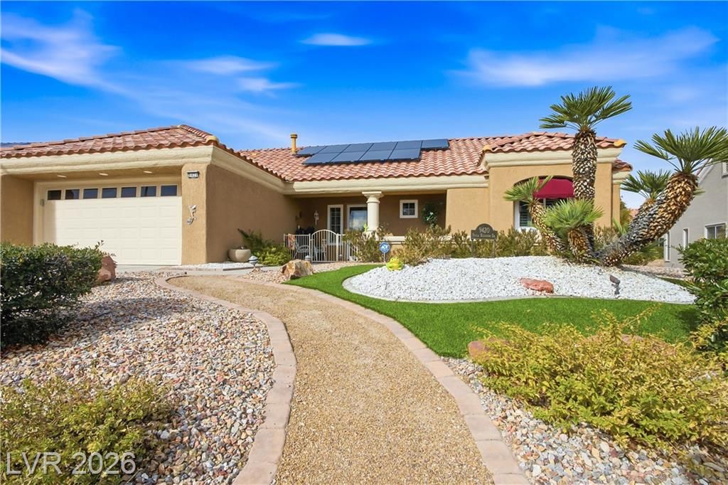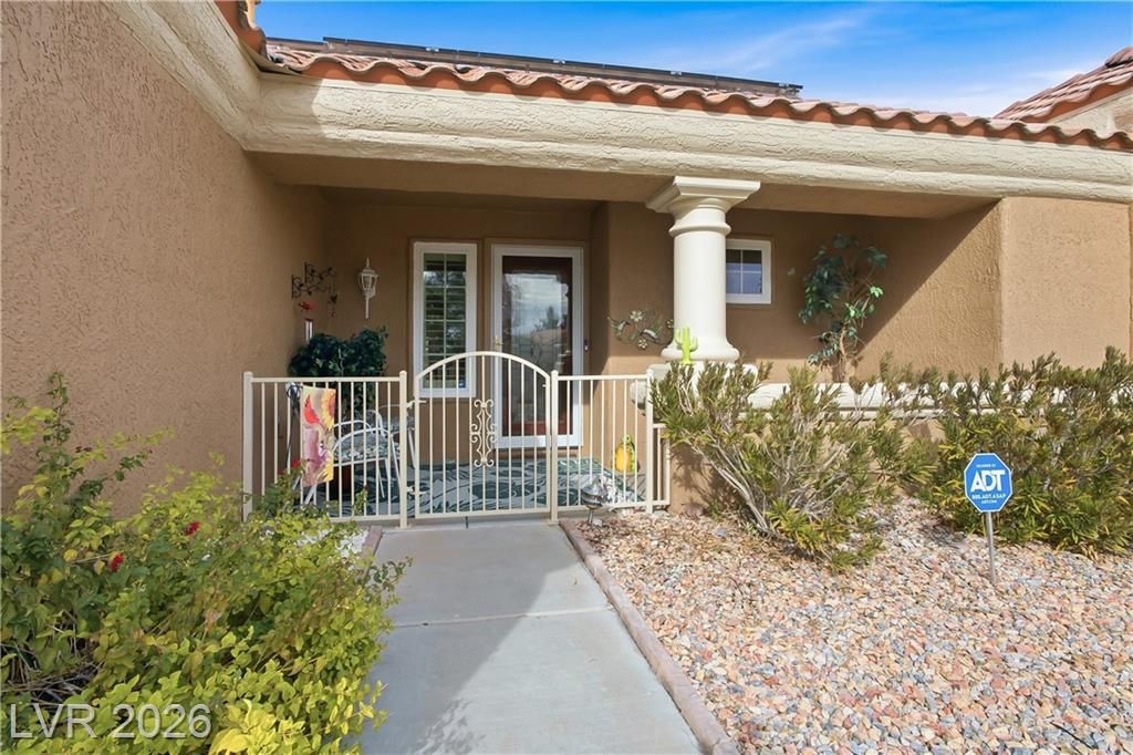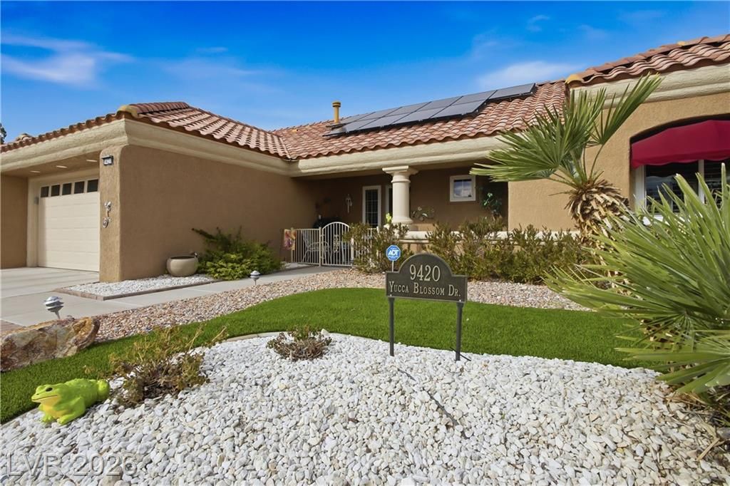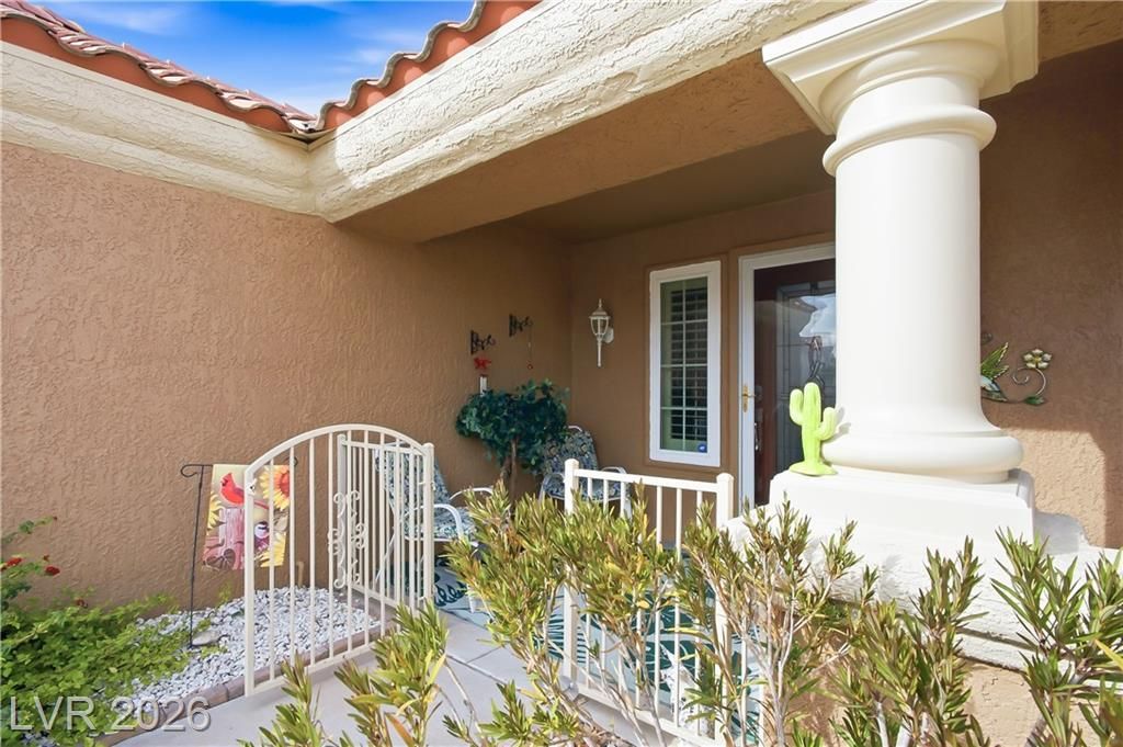 Beautifully expanded 1,423 sq. ft. Weston model offering 2 bedrooms and 2 baths in the premier 55+ community of Sun City Summerlin. Exceptional curb appeal welcomes you with manicured landscaping, artificial turf, and a charming gated front porch. Inside, enjoy tasteful updates including granite countertops in the kitchen and both baths, refinished cabinetry, plantation shutters and wood-look tile flooring throughout. The primary en-suite features vaulted ceilings, a walk-in closet, and a step-in shower. A full, updated bath is conveniently located near the second bedroom. New windows were installed in late 2024. Outdoors, relax under the covered patio with drop-down power shades, overlooking a fully fenced yard with lush landscaping and artificial turf. The home also includes leased solar panels for cost-effective energy savings. There are 3 golf courses, 4 pools and clubhouses, gyms, tennis and pickleball courts in the community located nearby all that Vegas has to offer.