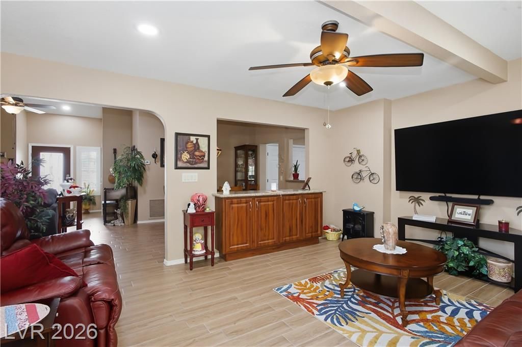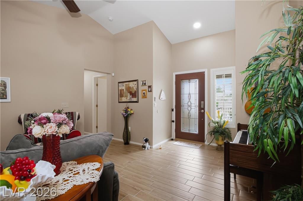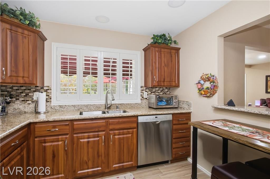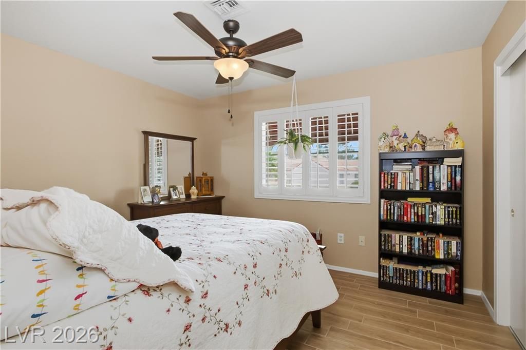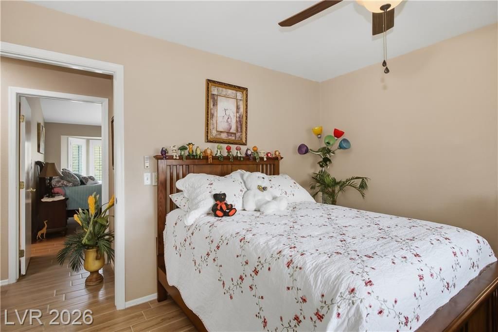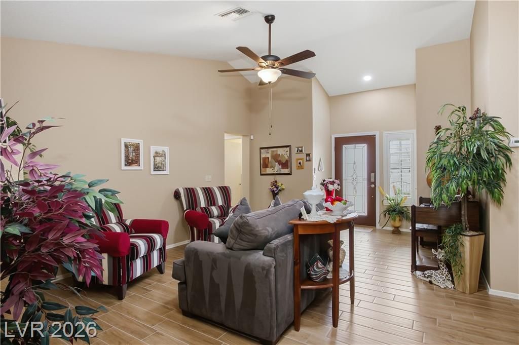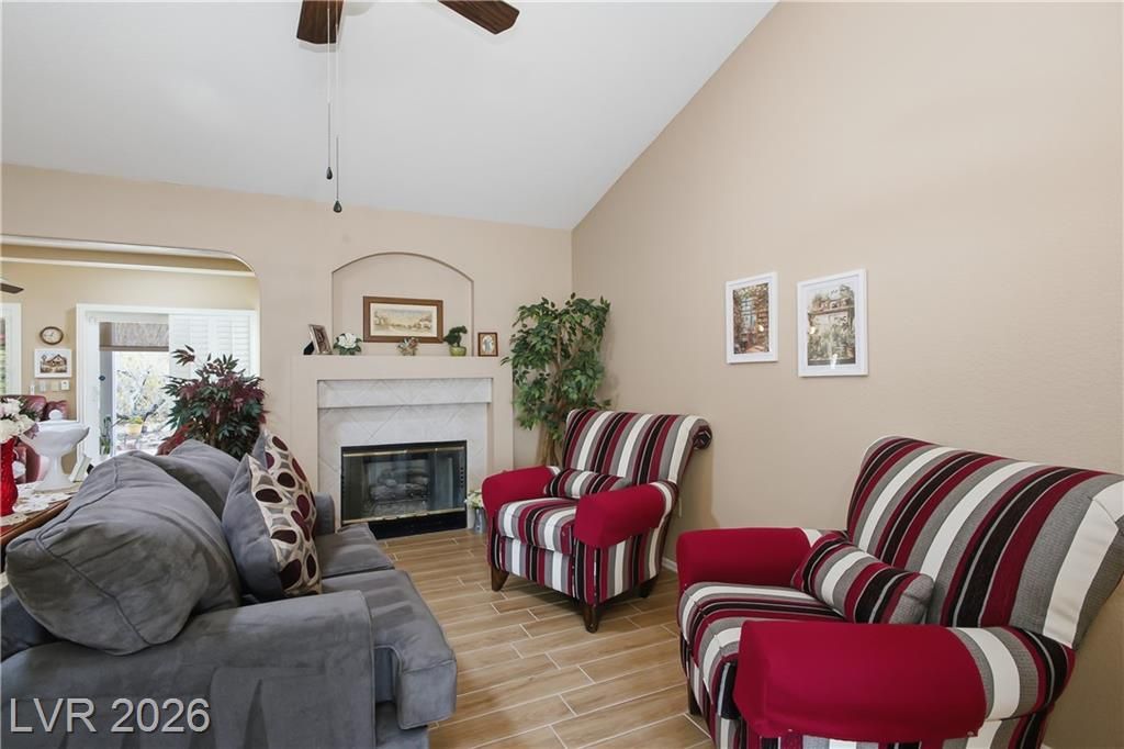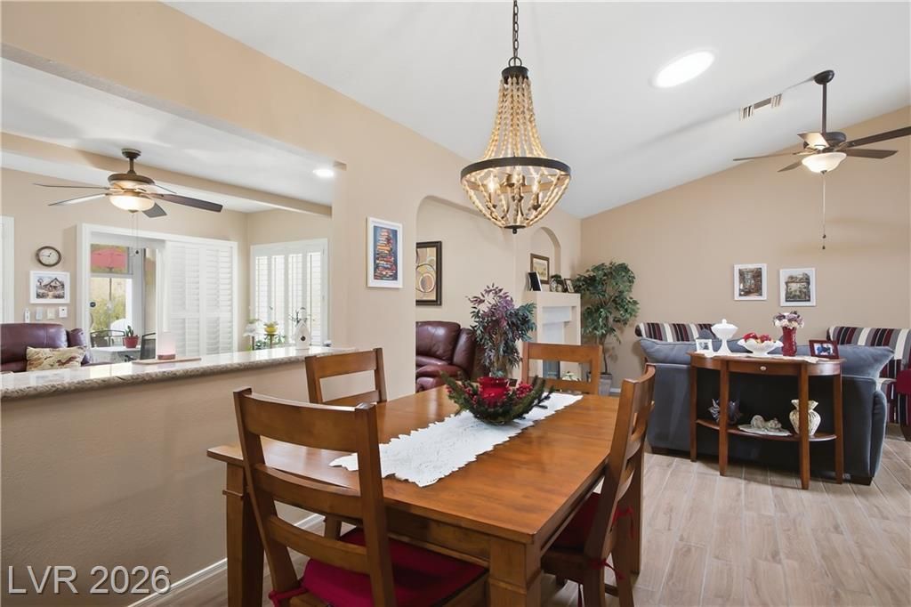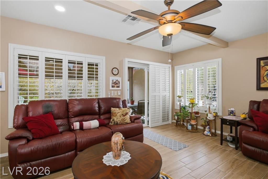 Beautifully expanded 1,423 sq. ft. Weston model offering 2 bedrooms and 2 baths in the premier 55+ community of Sun City Summerlin. Exceptional curb appeal welcomes you with manicured landscaping, artificial turf, and a charming gated front porch. Inside, enjoy tasteful updates including granite countertops in the kitchen and both baths, refinished cabinetry, plantation shutters and wood-look tile flooring throughout. The primary en-suite features vaulted ceilings, a walk-in closet, and a step-in shower. A full, updated bath is conveniently located near the second bedroom. New windows were installed in late 2024. Outdoors, relax under the covered patio with drop-down power shades, overlooking a fully fenced yard with lush landscaping and artificial turf. The home also includes leased solar panels for cost-effective energy savings. There are 3 golf courses, 4 pools and clubhouses, gyms, tennis and pickleball courts in the community located nearby all that Vegas has to offer.
