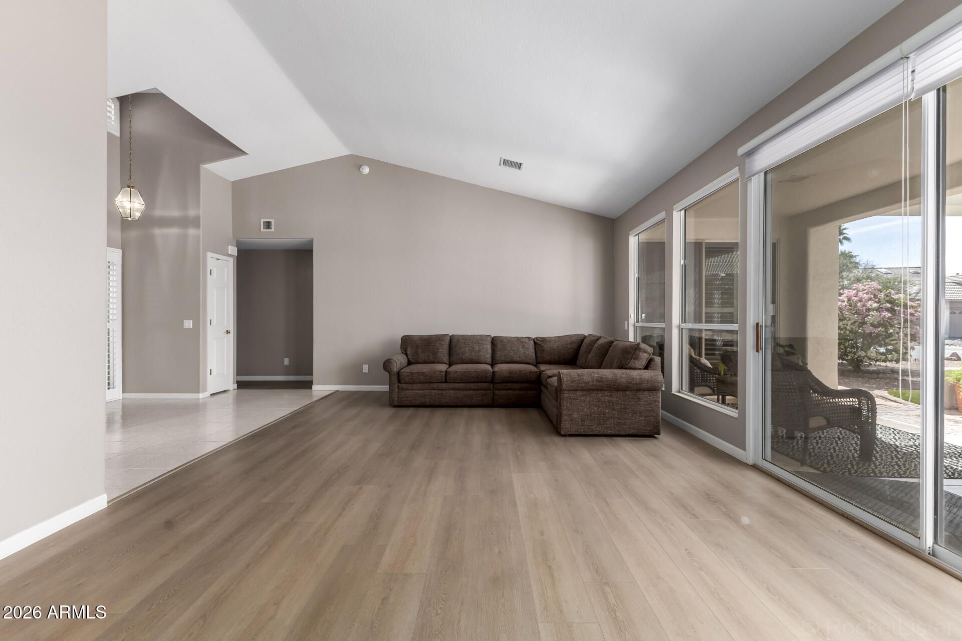 Welcome to resort-style living in the highly sought-after Oakwood community of Sun Lakes, where active adult living meets comfort, connection, and convenience. Residents enjoy access to championship golf, tennis and pickleball courts, fitness centers, community pools, walking paths, and a vibrant clubhouse filled with social events, dining, and activities year-round. Perfectly positioned on a premium corner lot just steps from the golf course, this home offers both privacy and proximity to everything that makes Sun Lakes so special. Featuring 2 bedrooms, a 2-car garage plus a dedicated golf cart garage, and easy-care landscaping, this property is designed for low-maintenance living so you can fully enjoy the lifestyle. Inside, you'll find an inviting living room with vaulted ceilings abundant natural light, and beautiful wood-look flooring. Plantation shutters throughout the home add timeless style and functionality. A separate family room provides additional space to relax or entertain. The eat-in kitchen is well-appointed with granite countertops, ample wood cabinetry, recessed lighting, built-in appliances, and a center island for added prep space. The spacious primary suite offers private backyard access, dual sinks, and a walk-in closet. Step outside to your private backyard retreat, complete with a covered patio, pristine artificial turf, and an electronic shade screen for added privacy and comfort--perfect for enjoying Arizona's beautiful weather year-round. Whether you're golfing, socializing, or simply relaxing at home, this is your opportunity to enjoy the best of Sun Lakes living.