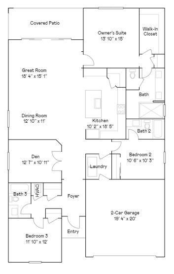 Exclusive to active adults 55+ and better, this single-story home's open design gives it a modern flare. The Great Room and dining room lead to a covered patio perfect for indoor-outdoor living, while the kitchen is designed for ease of use and comes with a center island for increased counter space. The expansive owner's suite, which includes a private bathroom, has convenient access to the rest of the home. A versatile den, two secondary bedrooms and a two-car garage complete the layout. Prices, dimensions and features may vary and are subject to change. Photos are for illustrative purposes only.Be sure to ask a new home consultant about our Builder Incentives!!