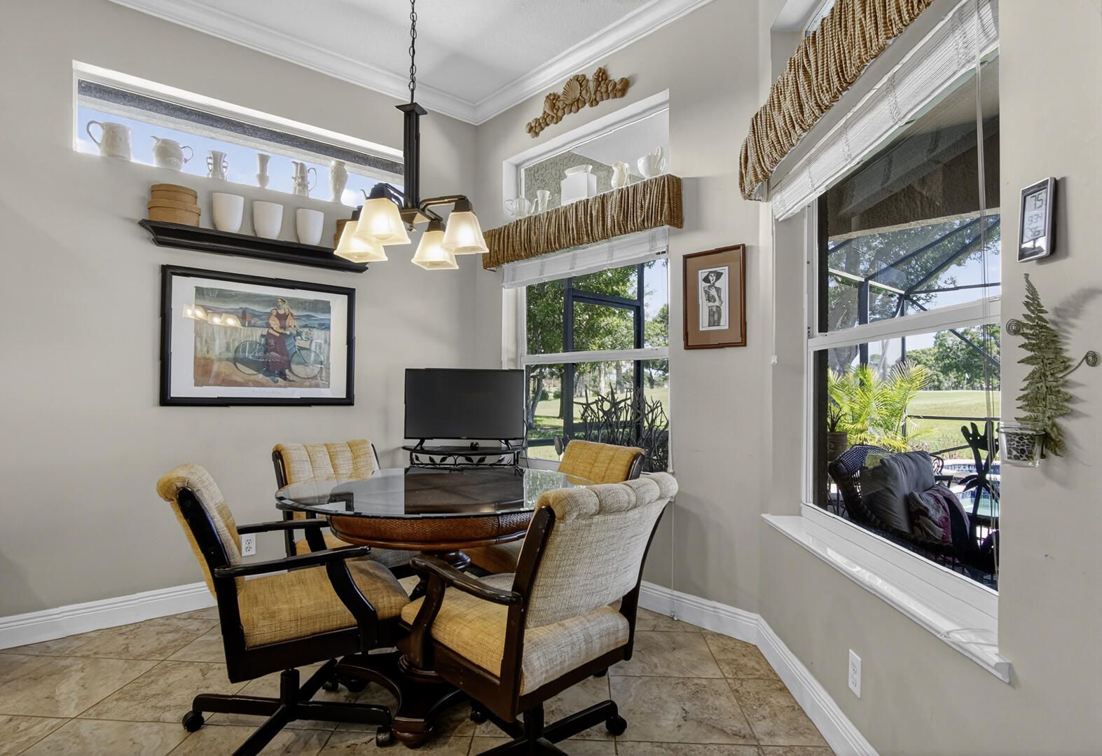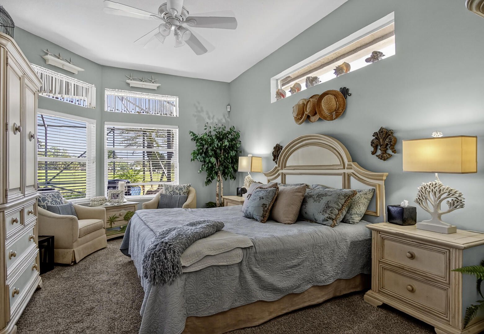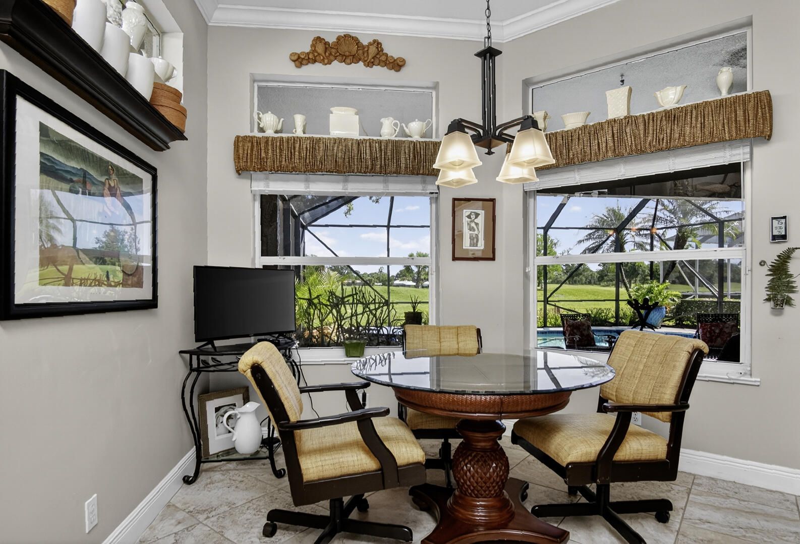 Beautiful 3/2/2/ pool home situation on the golf course with stunning views. Expansive great room opens to a covered patio and screened in pool and spa, blending indoor and outdoor living. The kitchen offers granite counter tops, pantry, custom cabinets with under counter top lighting and also an eat-in dining area. Master bedroom has additional sitting area overlooking the pool and golf course. One guest bedroom has been converted into a craft/art room. The other guest bedroom can be converted into an ensuite with the pocket door.Upgrades include crown molding and diagonal tile in the main living areas, and extended front parking pad. Laundry room has custom cabinets and shelves with a desk. Garage has a laundry tub, plenty of storage. Located in Meadowood C.C. this home is a must see.