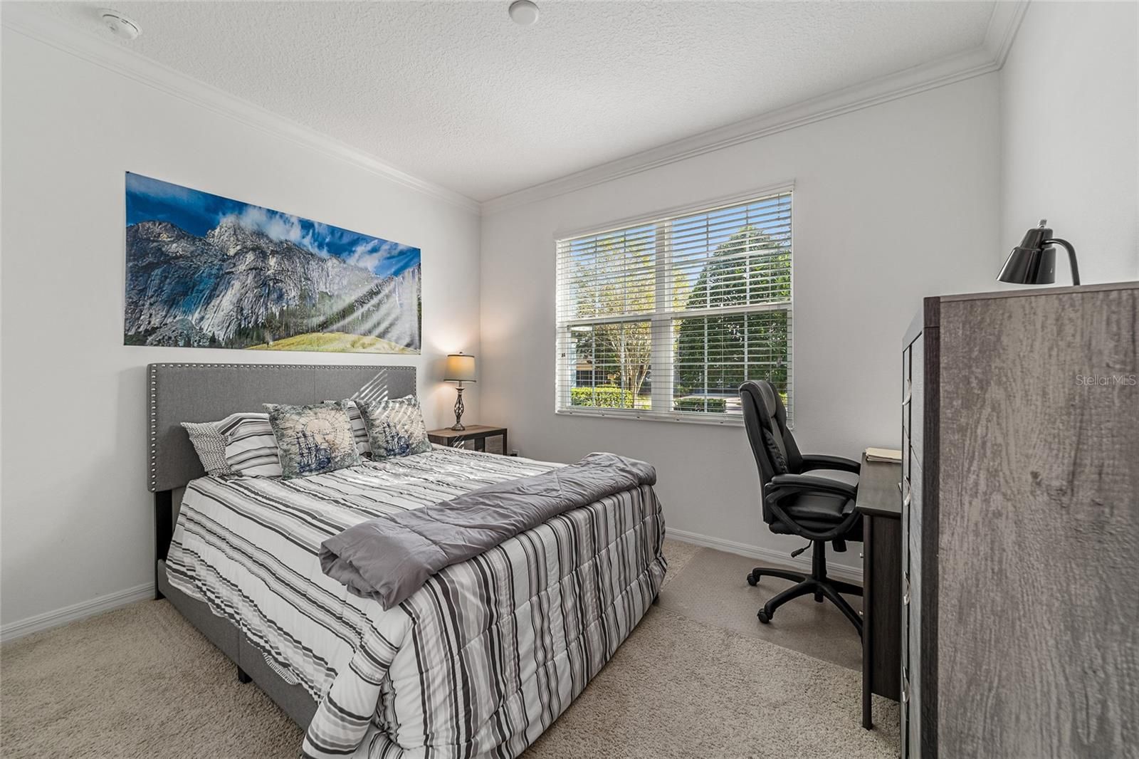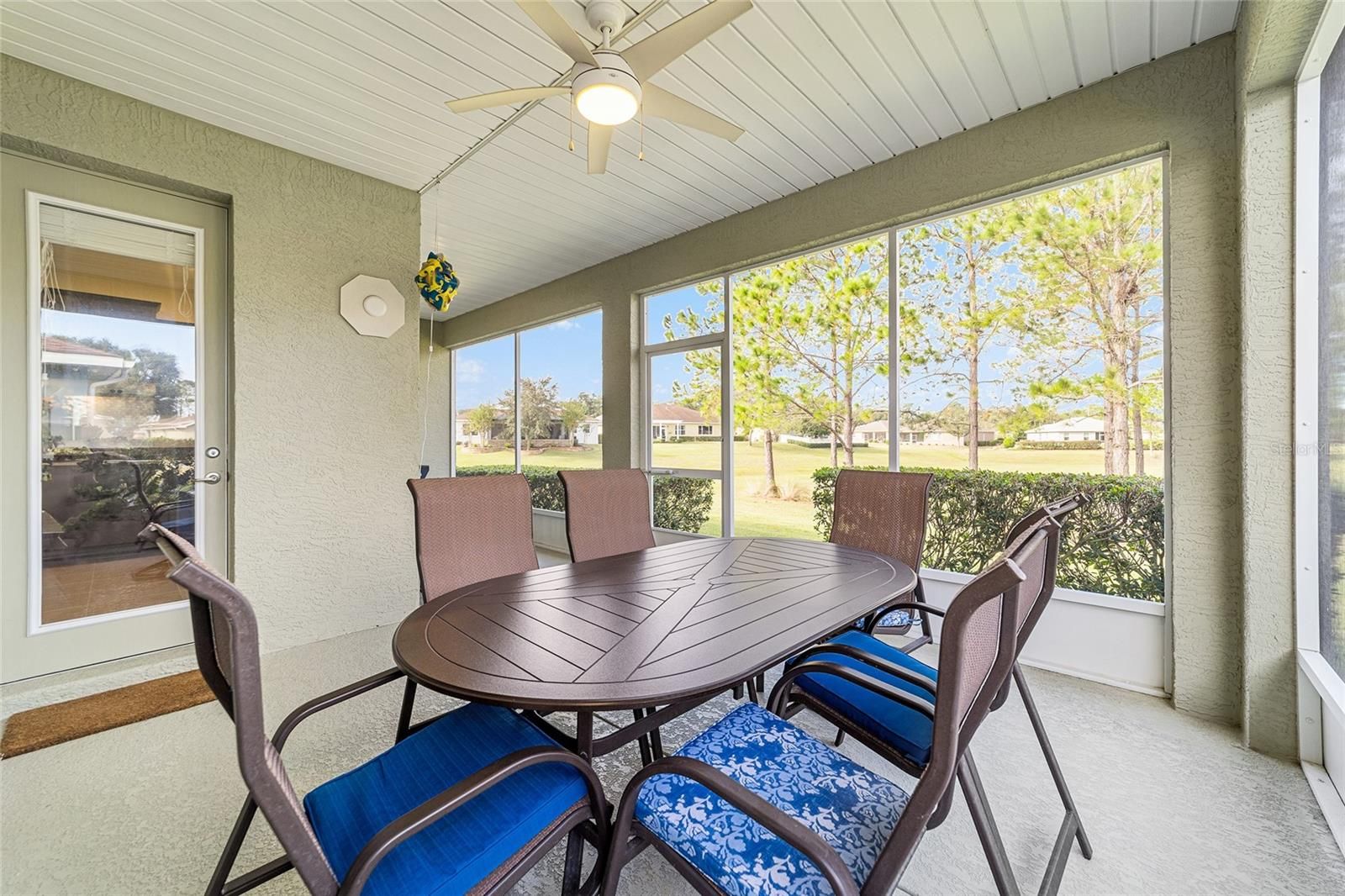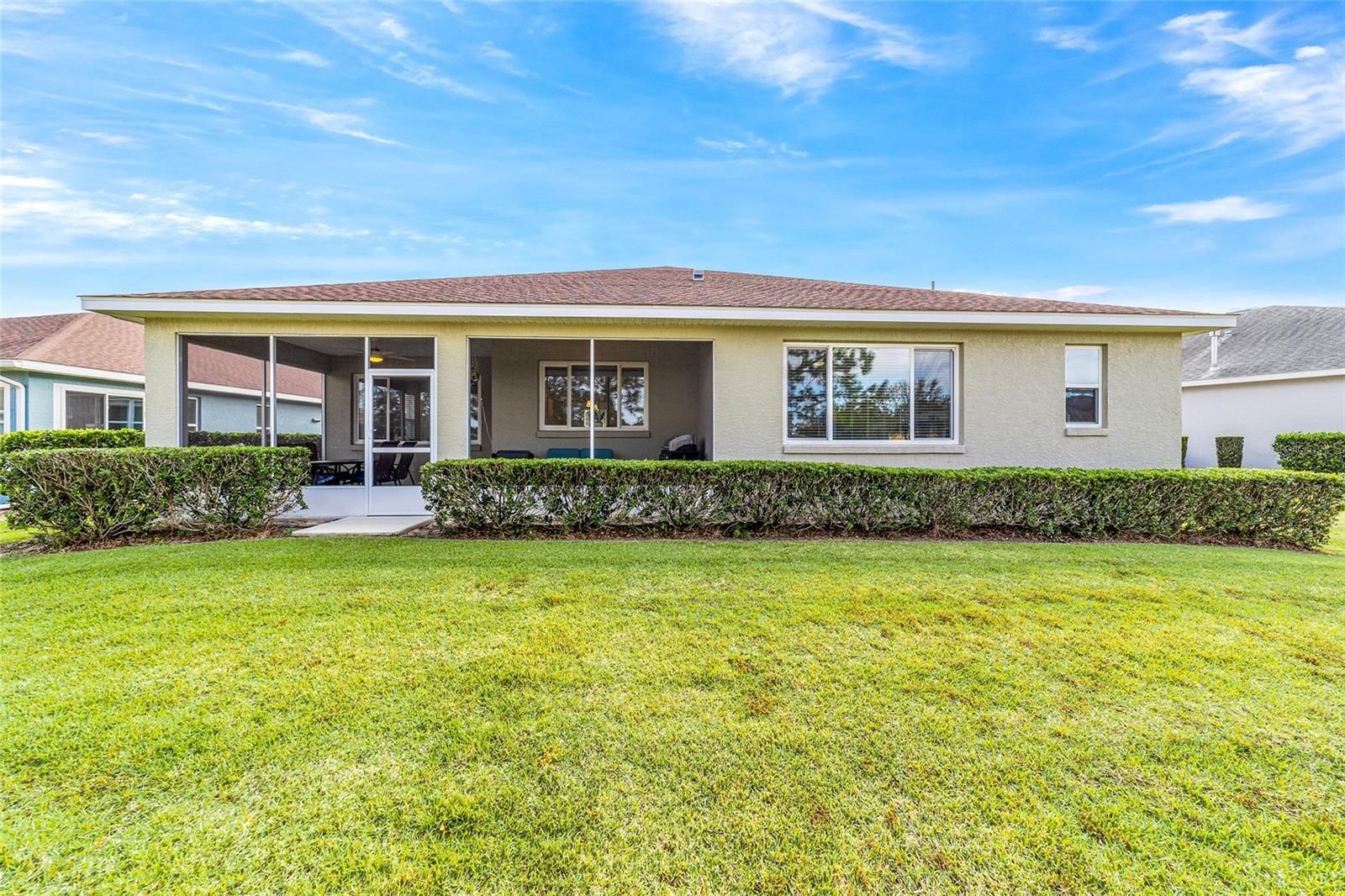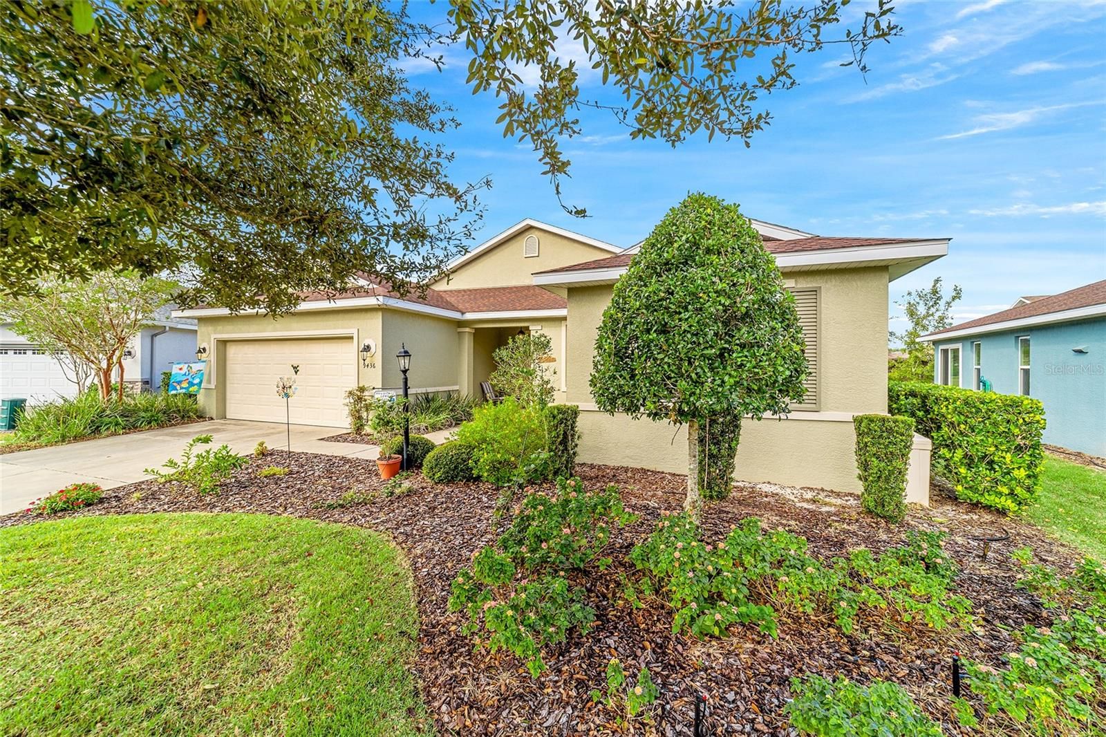 Step into elegance with this beautifully designed 2-bedroom + flex room, 2-bath, 2-car garage York/Yvette home, perfectly positioned to overlook a peaceful dry retention greenspace. From the moment you enter, crown molding and thoughtful details set the tone for sophistication throughout. At the front of the home, a private guest suite awaits with carpet, generous closet space, and an upgraded bath featuring a quartz vanity and sleek, tiled shower with glass enclosure. Follow the foyer into the open flex room - ideal for a home office, library, or hobby space. Here, natural light pours through oversized windows into the living room, creating a bright, inviting atmosphere that flows seamlessly to the screened lanai. The chef's kitchen is a showstopper with granite counters, staggered espresso cabinetry, built-in wall oven, drawer microwave, and a large island perfect for entertaining. A sunlit dining nook and a picture window overlooks the backyard, blending indoor comfort with outdoor beauty. The spacious primary suite offers a tranquil retreat with large windows, a ceiling fan, and a spa-like ensuite featuring dual quartz vanities, a walk-in tiled shower with bench seating, and an expansive walk-in closet. Enjoy Florida living year-round on the L-shaped screened lanai, complete with ceiling fan and private, lush views of your own outdoor sanctuary. Located in Ocala's premier, gated, active 55+ community, loaded with amenities, including golf cart access to 2 shopping centers!
