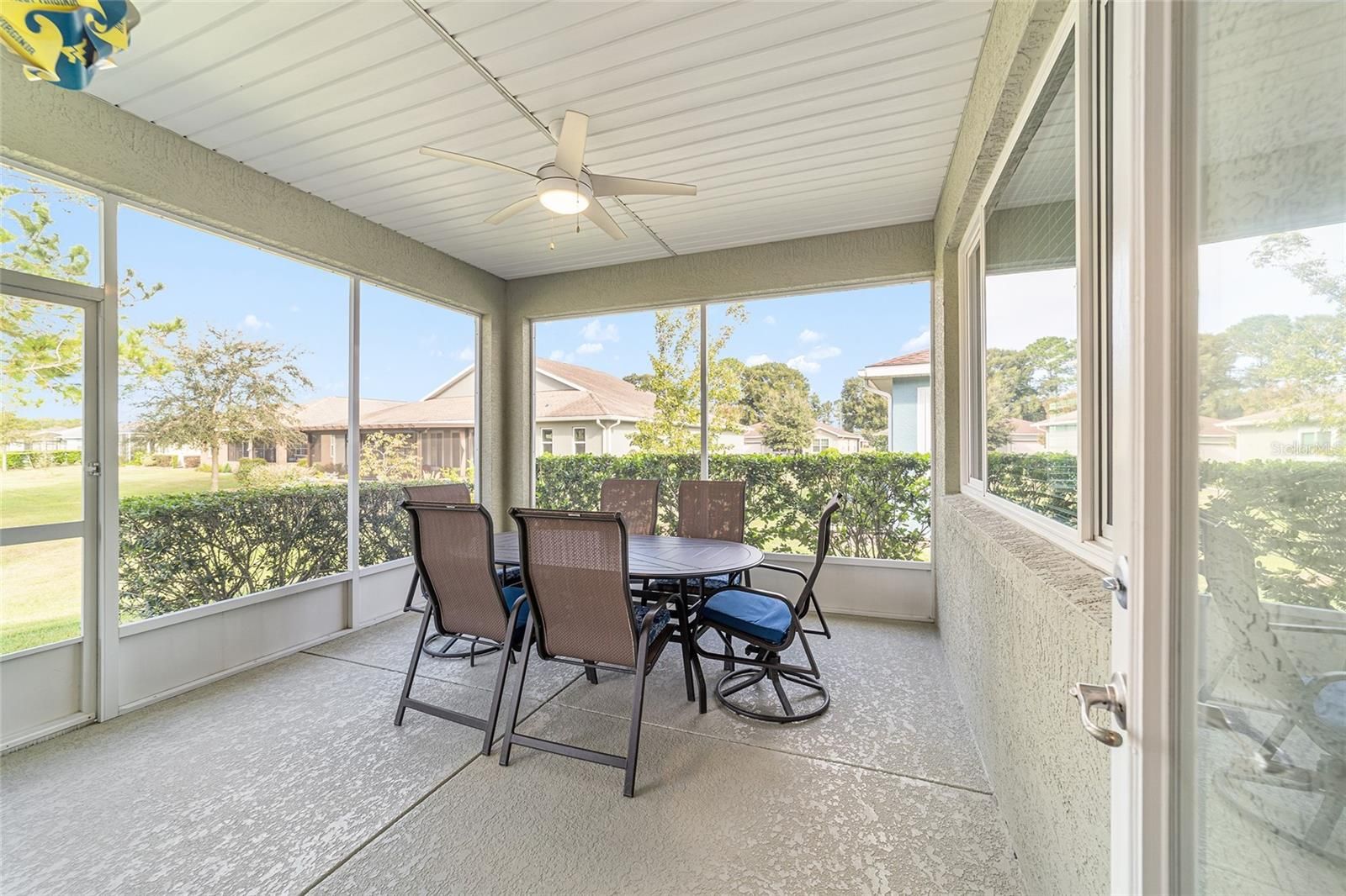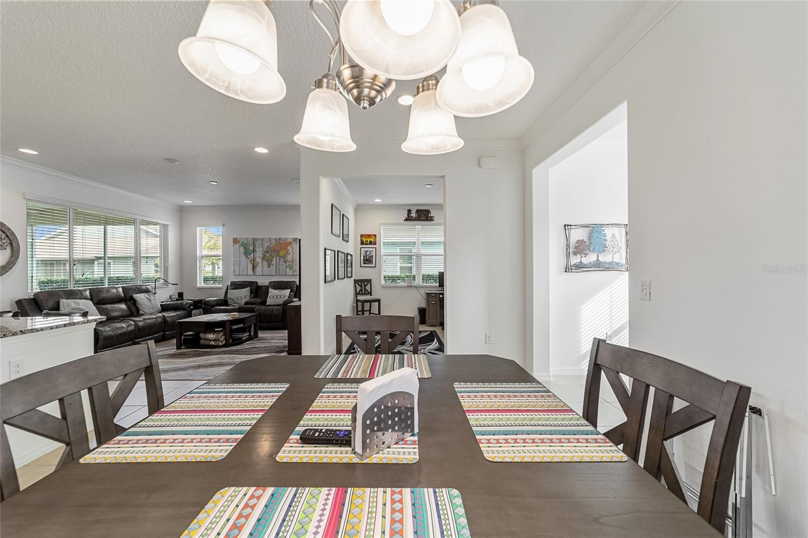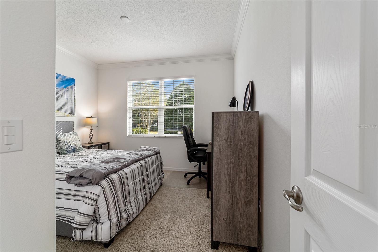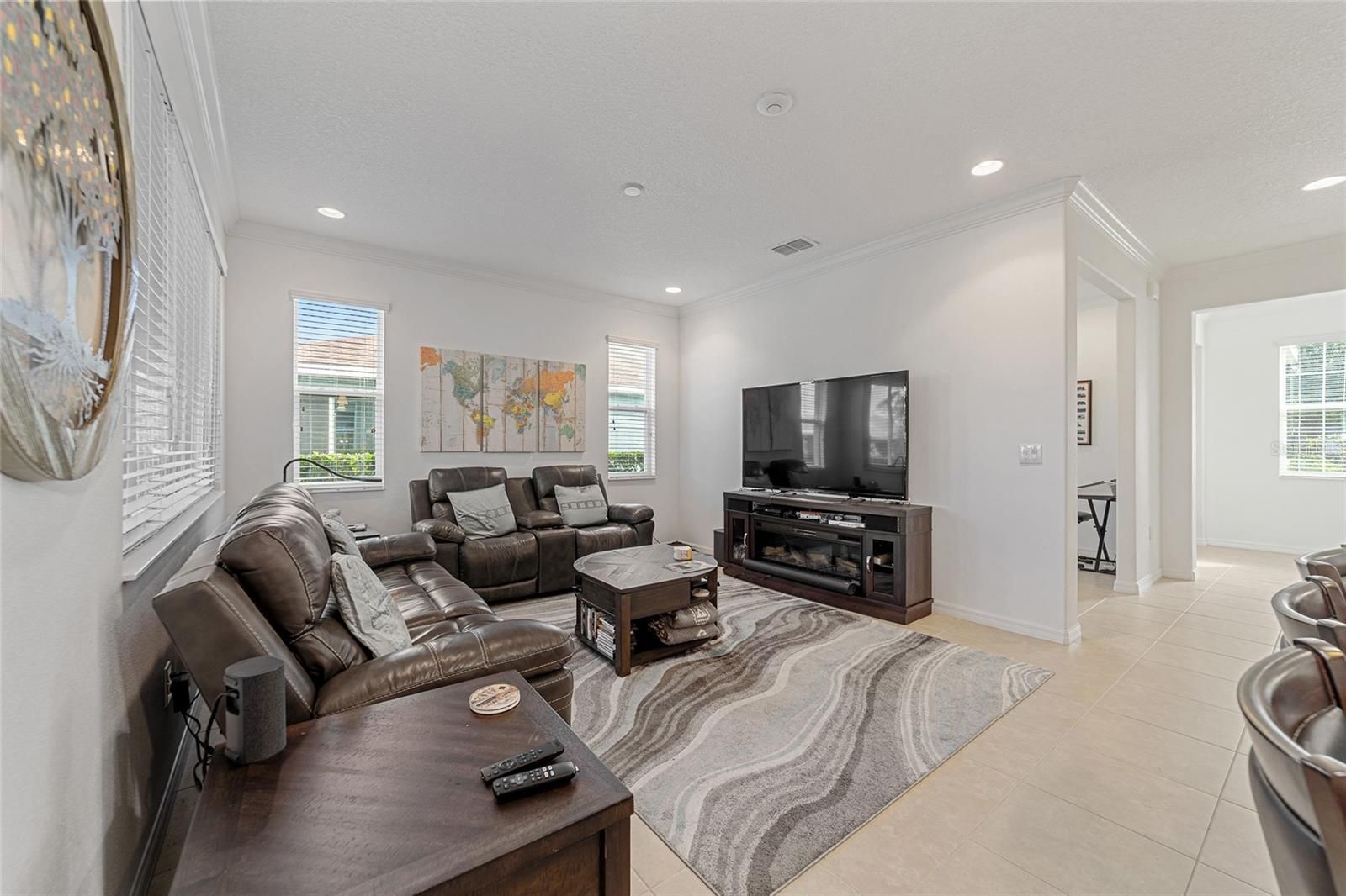 Step into elegance with this beautifully designed 2-bedroom + flex room, 2-bath, 2-car garage York/Yvette home, perfectly positioned to overlook a peaceful dry retention greenspace. From the moment you enter, crown molding and thoughtful details set the tone for sophistication throughout. At the front of the home, a private guest suite awaits with carpet, generous closet space, and an upgraded bath featuring a quartz vanity and sleek, tiled shower with glass enclosure. Follow the foyer into the open flex room - ideal for a home office, library, or hobby space. Here, natural light pours through oversized windows into the living room, creating a bright, inviting atmosphere that flows seamlessly to the screened lanai. The chef's kitchen is a showstopper with granite counters, staggered espresso cabinetry, built-in wall oven, drawer microwave, and a large island perfect for entertaining. A sunlit dining nook and a picture window overlooks the backyard, blending indoor comfort with outdoor beauty. The spacious primary suite offers a tranquil retreat with large windows, a ceiling fan, and a spa-like ensuite featuring dual quartz vanities, a walk-in tiled shower with bench seating, and an expansive walk-in closet. Enjoy Florida living year-round on the L-shaped screened lanai, complete with ceiling fan and private, lush views of your own outdoor sanctuary. Located in Ocala's premier, gated, active 55+ community, loaded with amenities, including golf cart access to 2 shopping centers!