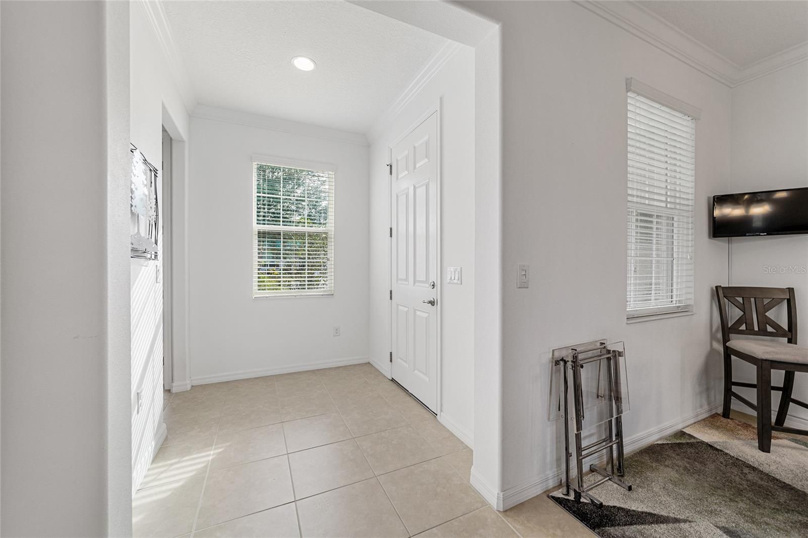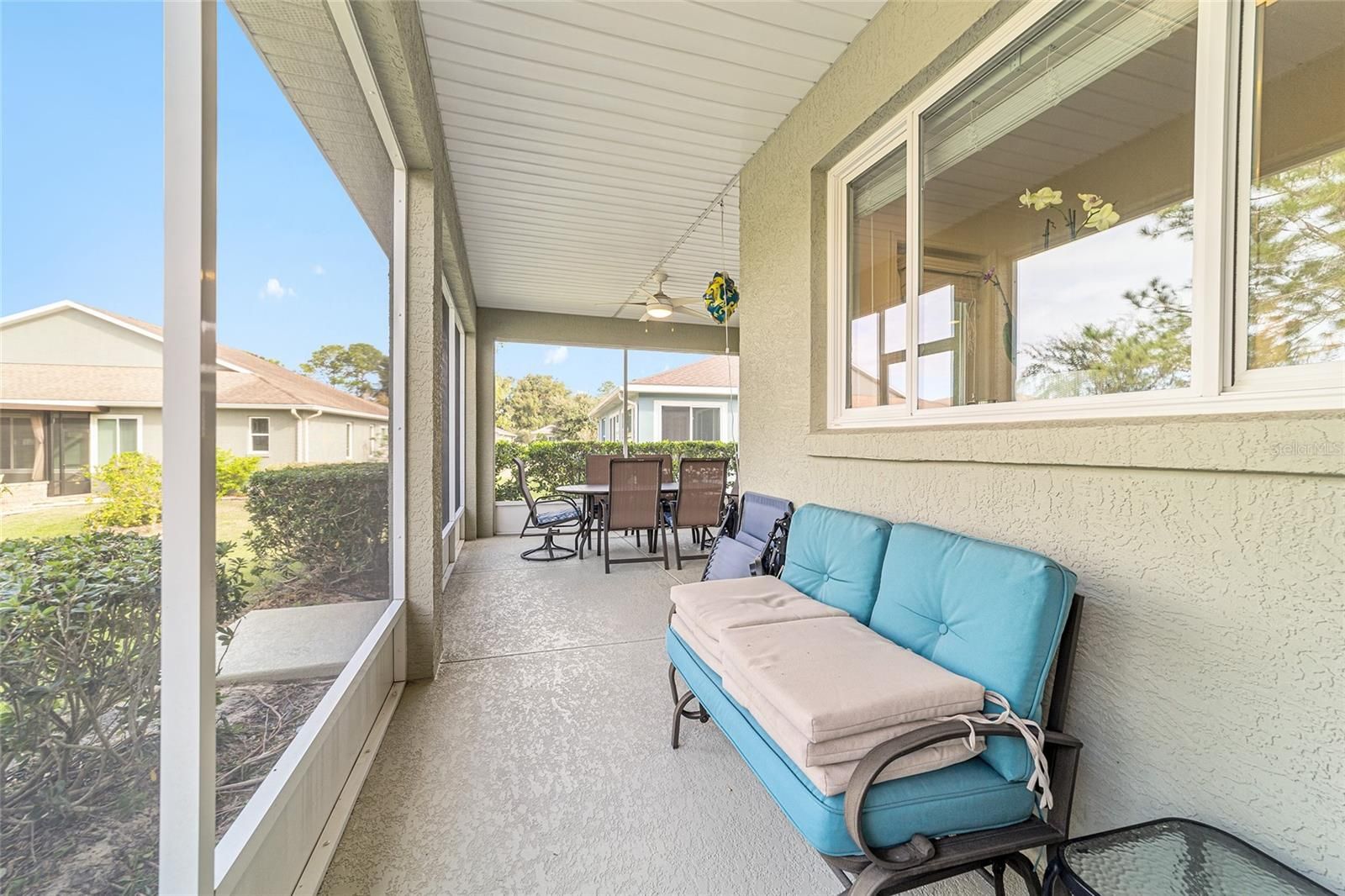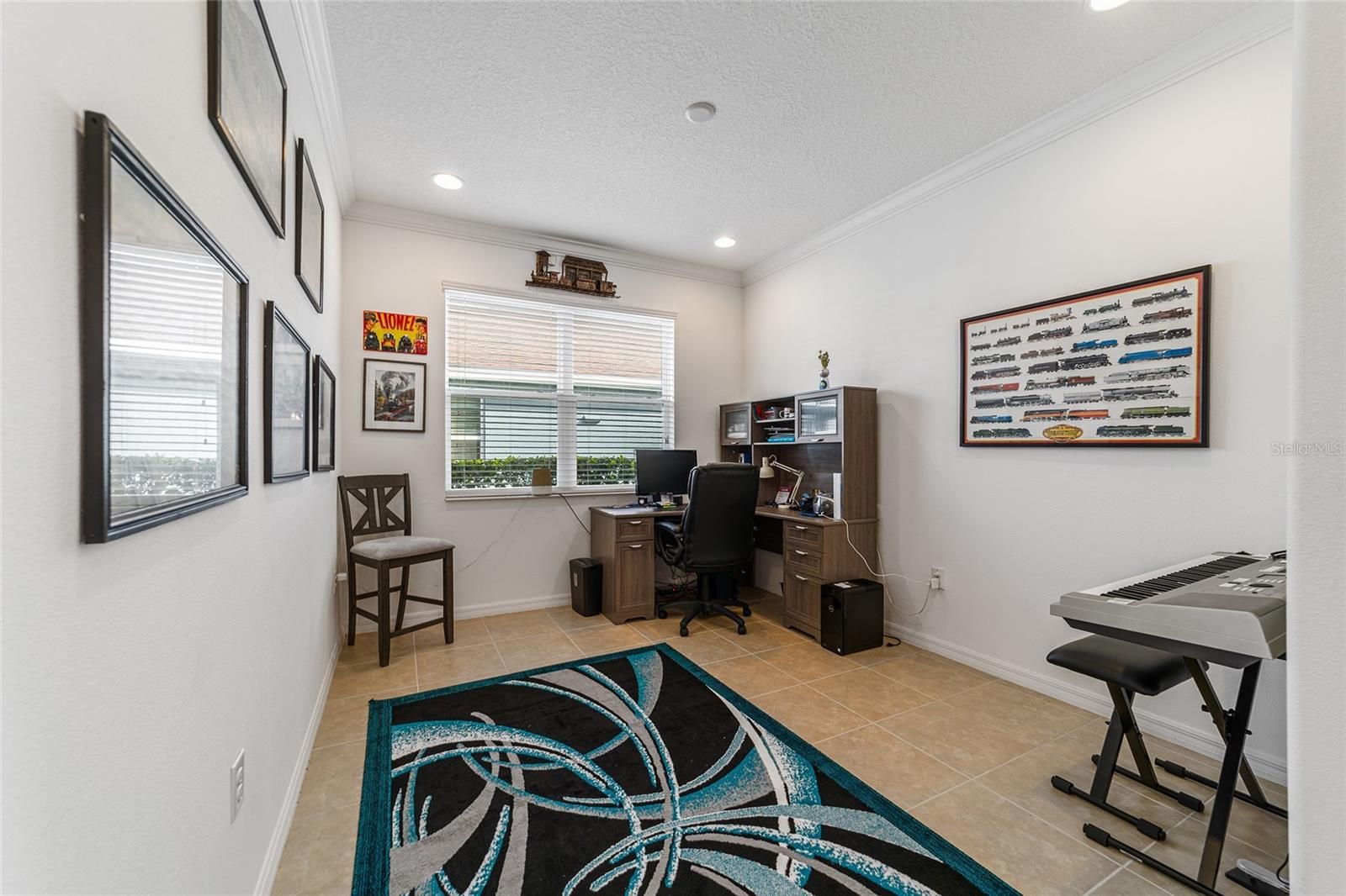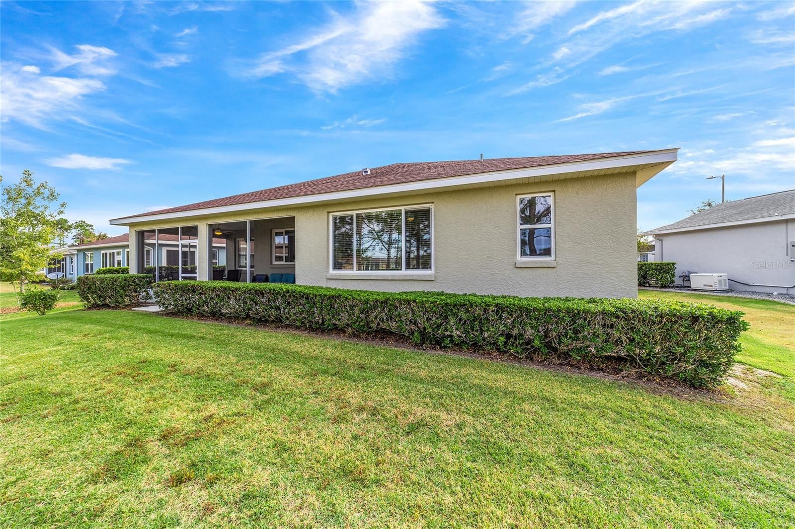 Step into elegance with this beautifully designed 2-bedroom + flex room, 2-bath, 2-car garage York/Yvette home, perfectly positioned to overlook a peaceful dry retention greenspace. From the moment you enter, crown molding and thoughtful details set the tone for sophistication throughout. At the front of the home, a private guest suite awaits with carpet, generous closet space, and an upgraded bath featuring a quartz vanity and sleek, tiled shower with glass enclosure. Follow the foyer into the open flex room - ideal for a home office, library, or hobby space. Here, natural light pours through oversized windows into the living room, creating a bright, inviting atmosphere that flows seamlessly to the screened lanai. The chef's kitchen is a showstopper with granite counters, staggered espresso cabinetry, built-in wall oven, drawer microwave, and a large island perfect for entertaining. A sunlit dining nook and a picture window overlooks the backyard, blending indoor comfort with outdoor beauty. The spacious primary suite offers a tranquil retreat with large windows, a ceiling fan, and a spa-like ensuite featuring dual quartz vanities, a walk-in tiled shower with bench seating, and an expansive walk-in closet. Enjoy Florida living year-round on the L-shaped screened lanai, complete with ceiling fan and private, lush views of your own outdoor sanctuary. Located in Ocala's premier, gated, active 55+ community, loaded with amenities, including golf cart access to 2 shopping centers!
