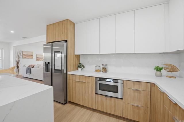Step into this spectacular Lake San Marcos home, professionally designed and renovated from floor to ceiling, where refined modern design and gorgeous views of the garden, green space, or golf course from every window draw you through the space. An inviting layout places the kitchen at the center, creating a natural flow and connection between the living and dining areas. The reimagined kitchen features custom-built cabinetry, elegant quartz surfaces extending across the countertops, full backsplash, and waterfall island along with all-new stainless-steel appliances including a smart frig with digital touch screen, 5-burner range, and microwave drawer; a pass-through connects to the dining area, where sliding doors open to the patio for indoor-outdoor flow. Bathrooms are fully renovated with custom cabinetry, quartz countertops, Moen® fixtures, and showers with porcelain tile surround and frameless glass doors. The en suite primary bedroom features dual closets, ceiling fan, and peaceful garden views. Additional features: LVP flooring, recessed lighting, shaker-style doors, Decora® switches & outlets, Nest® thermostat, solid walnut front door, dual-pane windows, and more - see list uploaded to MLS. Ideally positioned behind the Hole 15 tee off box outside the direct line of play, the backyard opens to fairway & foothill views, creating a peaceful setting for entertaining or dining al fresco. Set on an oversized lot with green space across the street, the front yard offers additional space for outdoor living. Optional resort membership provides access to golf, gym, lake activities, pools, tennis, pickleball, boat mooring, and more. Enjoy lakeside dining at Amalfi or the Marina Bar, plus nearby shopping, dining, and conveniences, with the coast about 8 miles away. Meticulously maintained golf course with NO HOA. Termite clearance provided. Homes with this level of renovation, setting, and views are a rare find—don’t miss this opportunity to make it yours.