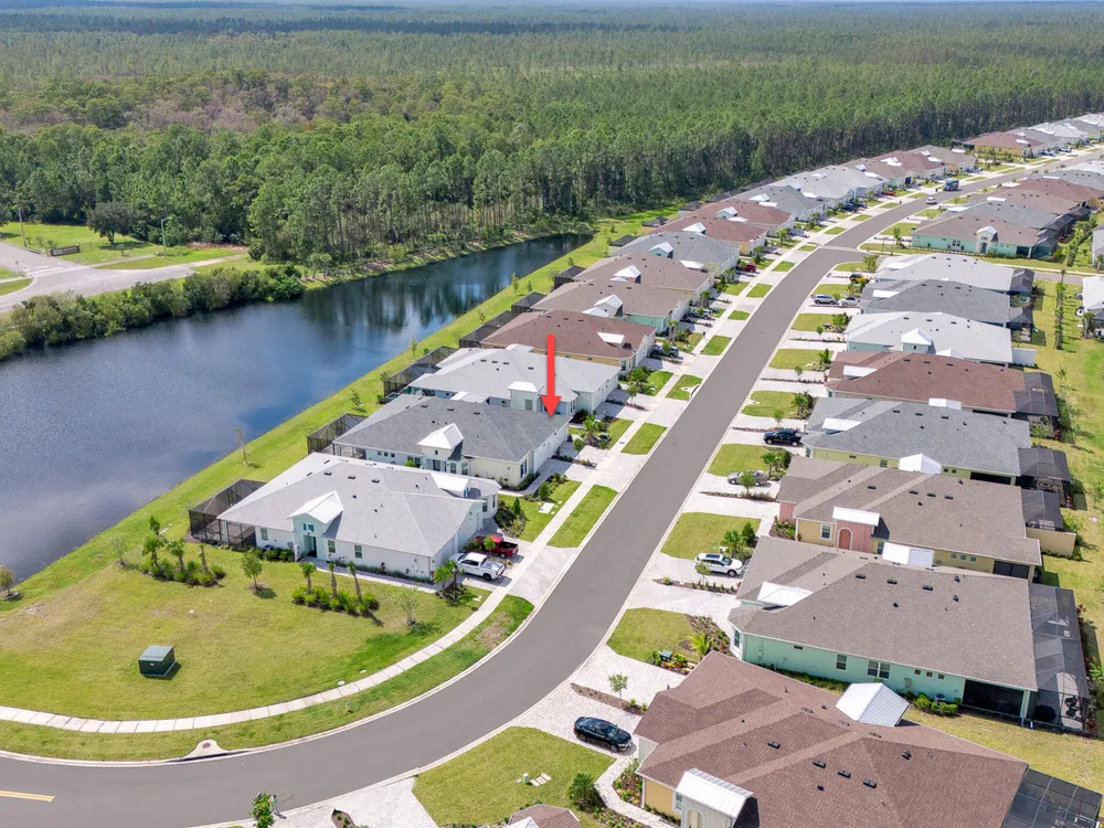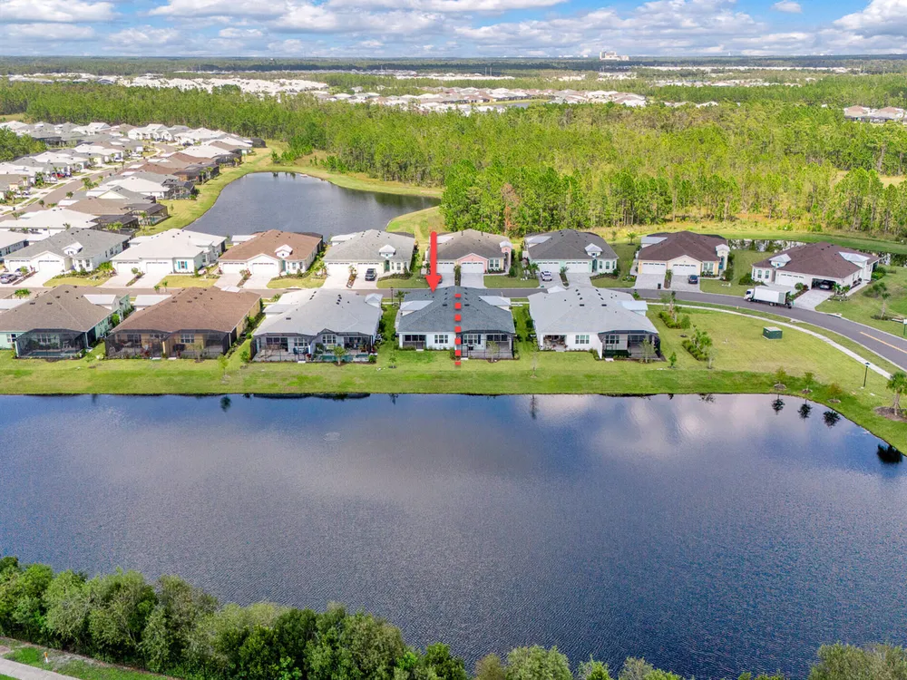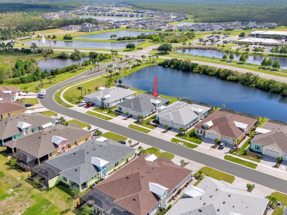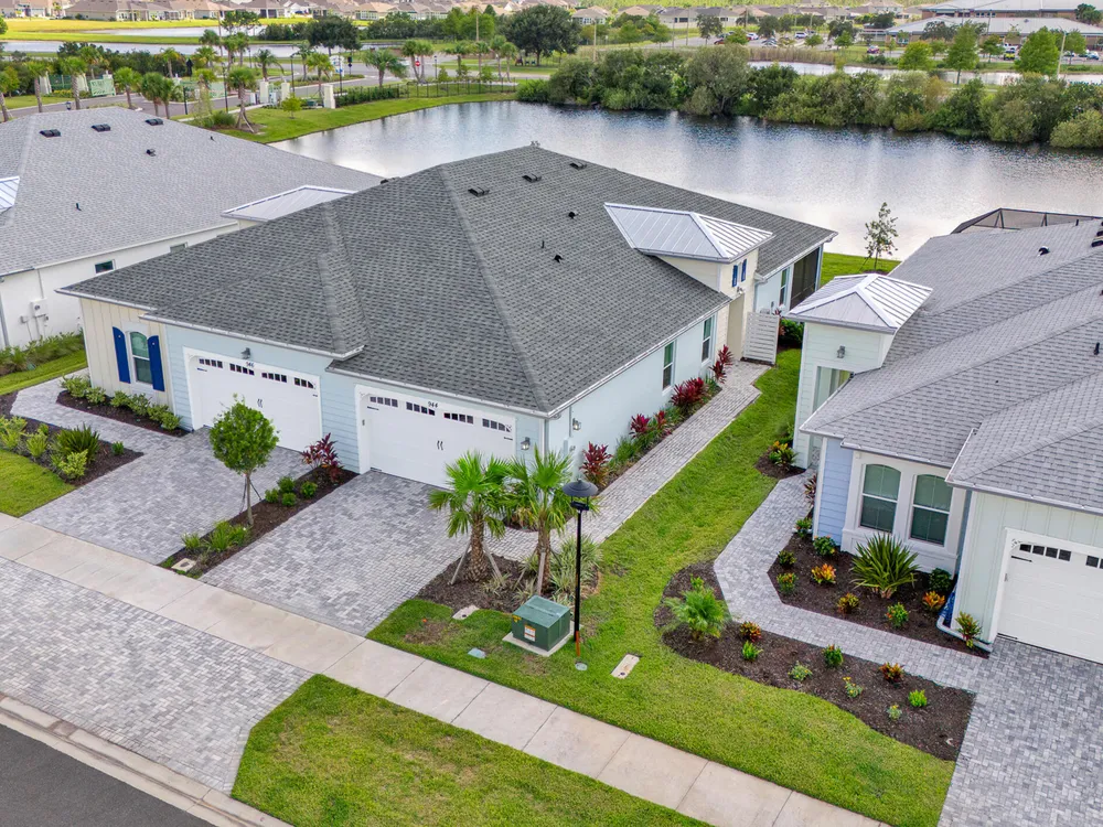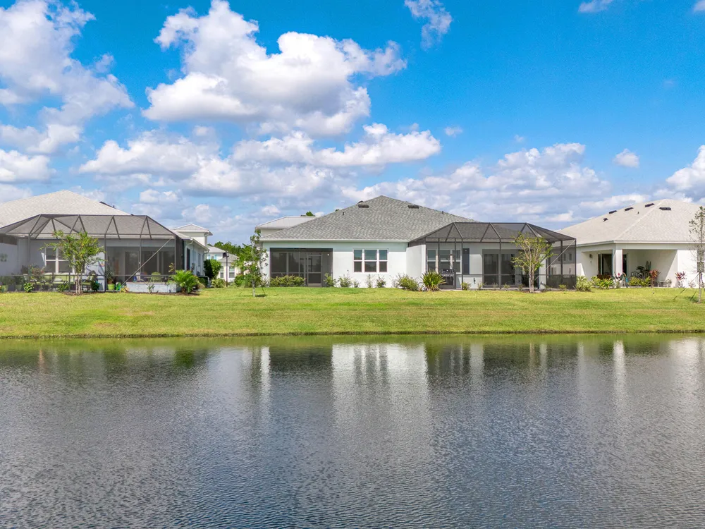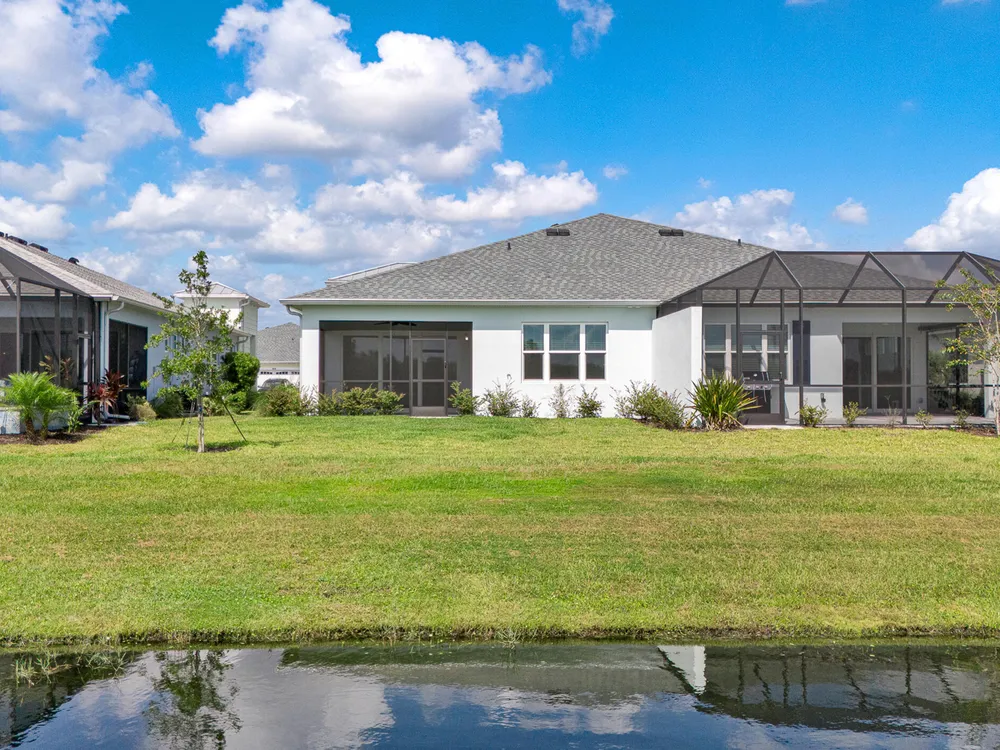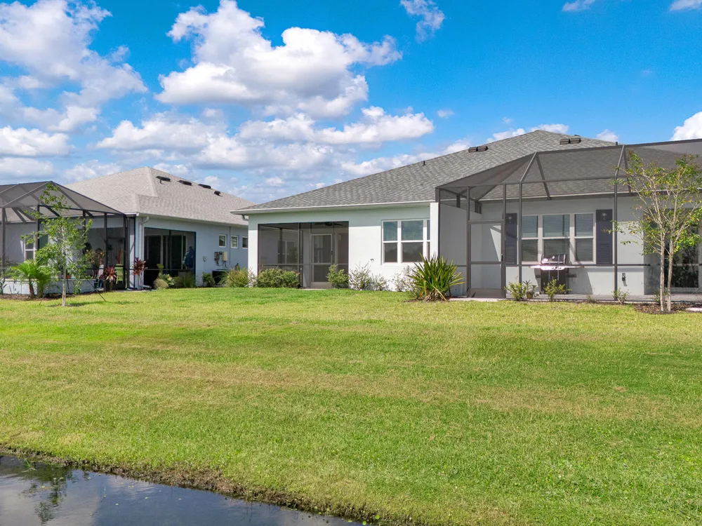 Wanna move to Margaritaville? This nearly new Antigua Villa is conveniently located by the Resident Only gate with water views, screened covered lanai, and custom beverage station with drink fridge! Eight ft. doors, Ceramic diagonal tile flooring, Glass front door, disposal button, full quartz backsplash, single sink, Zero-entry primary shower, single handle faucets, granite countertops throughout and iSpring whole house water filtration system! Enjoy the award-winning amenities of this resort-style 55+ community with Private Beach Club with pool, live poolside entertainment daily and concerts every Friday and Saturday at the bandshell in Town Center! Three pools in Town Center, take a class then sauna and spa in Fins Up Fitness Center, play Finball, Bocce ball, Pickleball, oh my! Play Trivia, Canasta, Mahjong, Mexican Train or see a show! Learn Ukulele, Pottery, Woodworking! Join Cycling, Water Volleyball, or a resident special interest club: whiskey, cigars, cruisers, food, decor