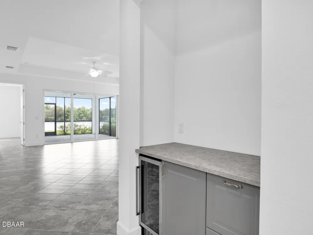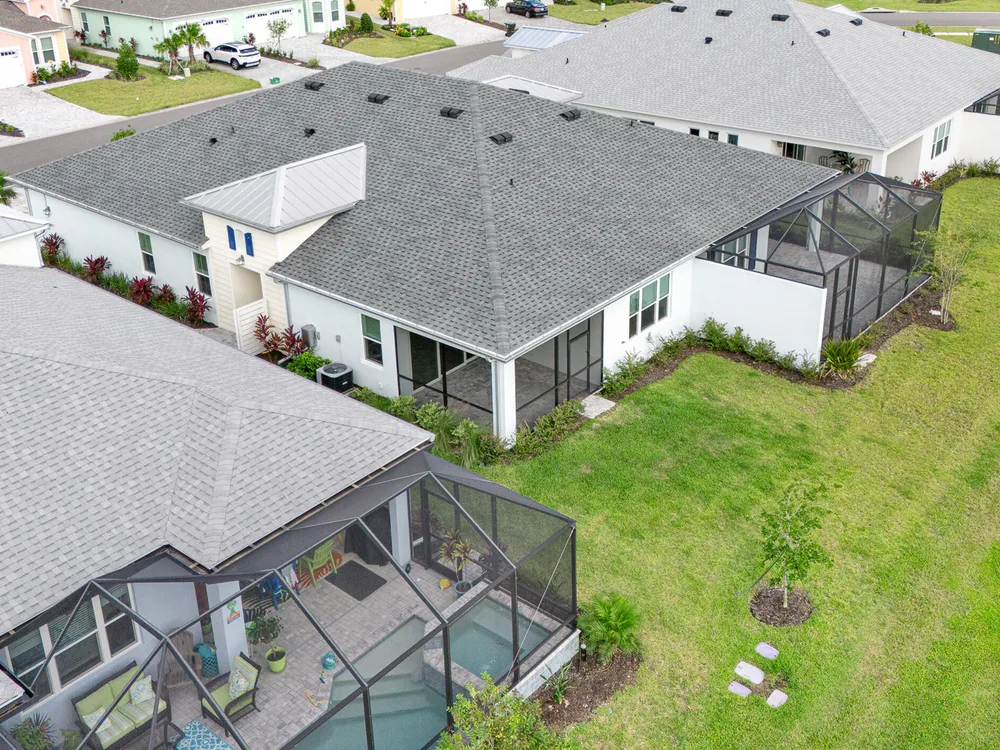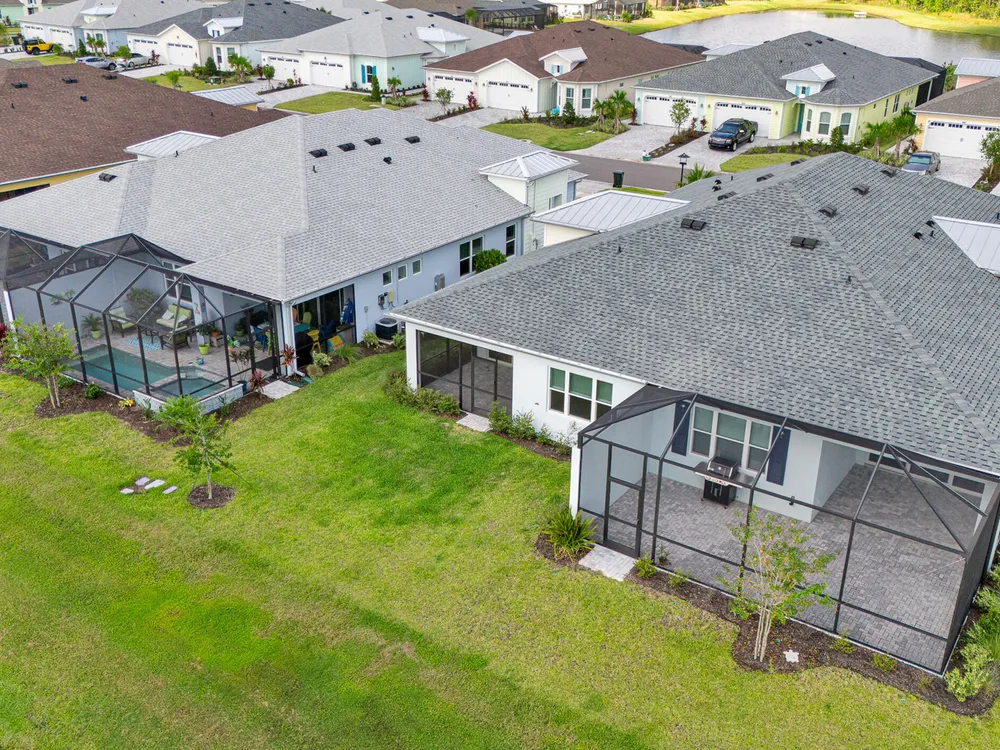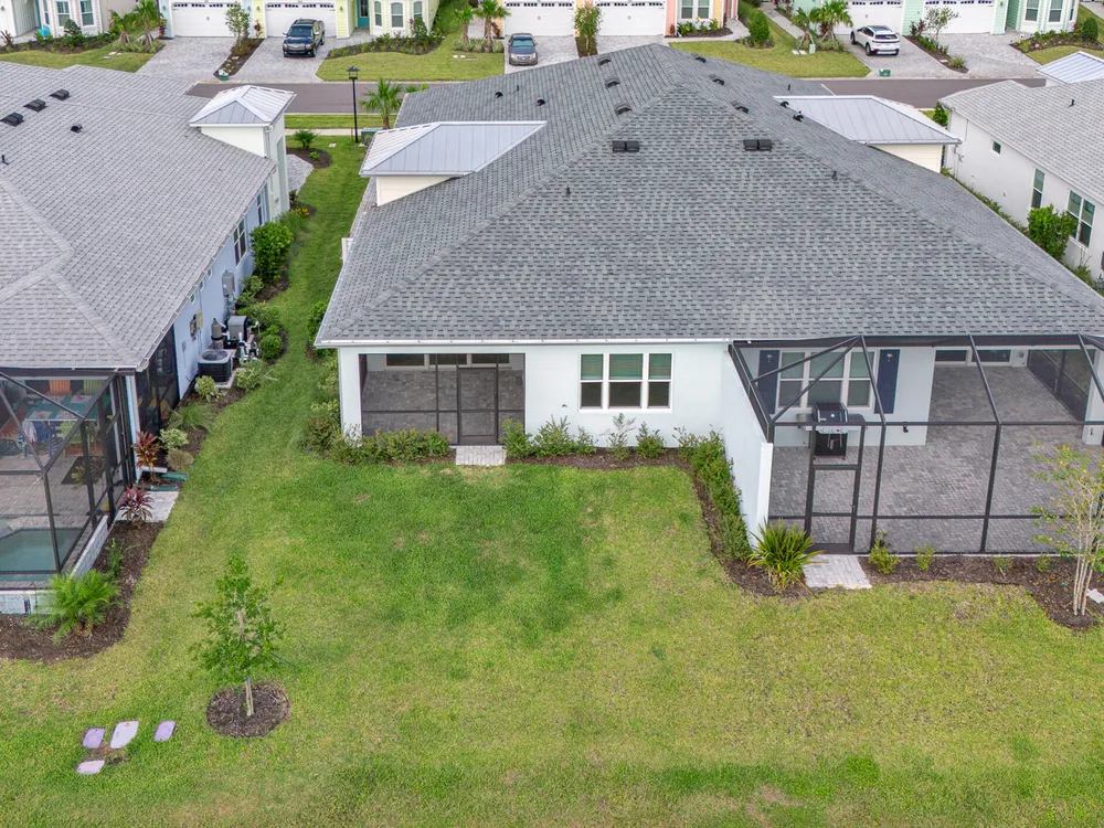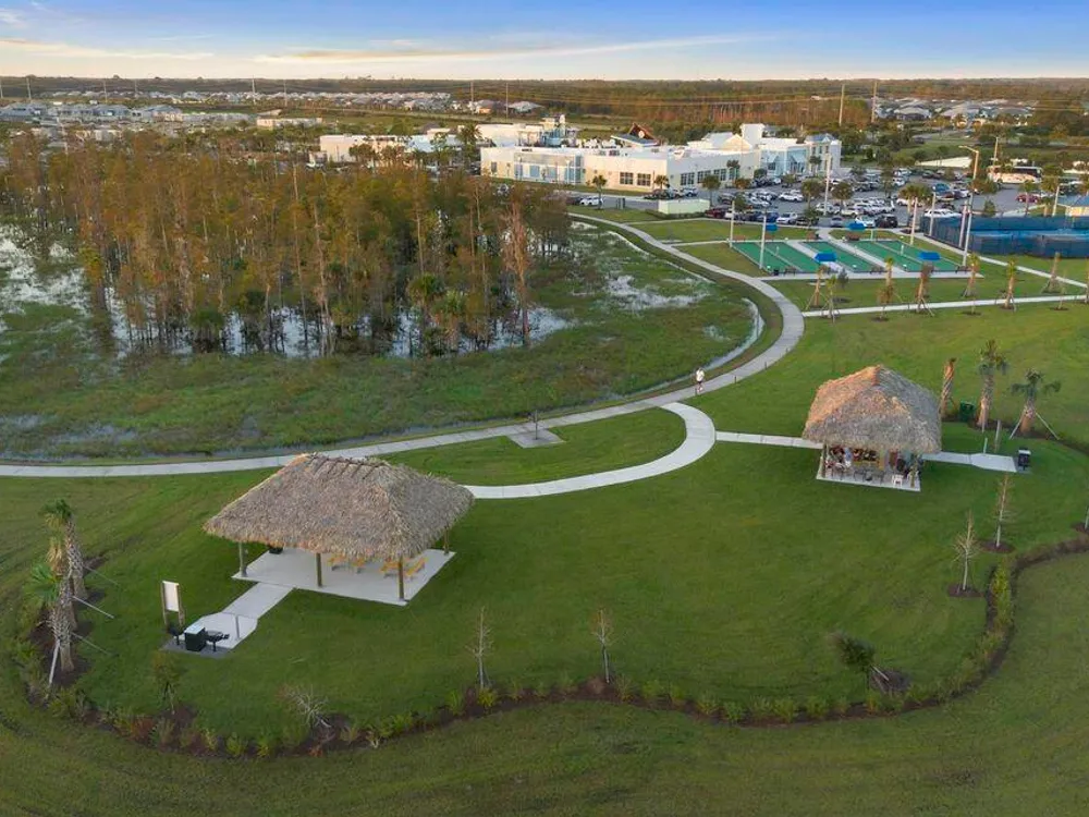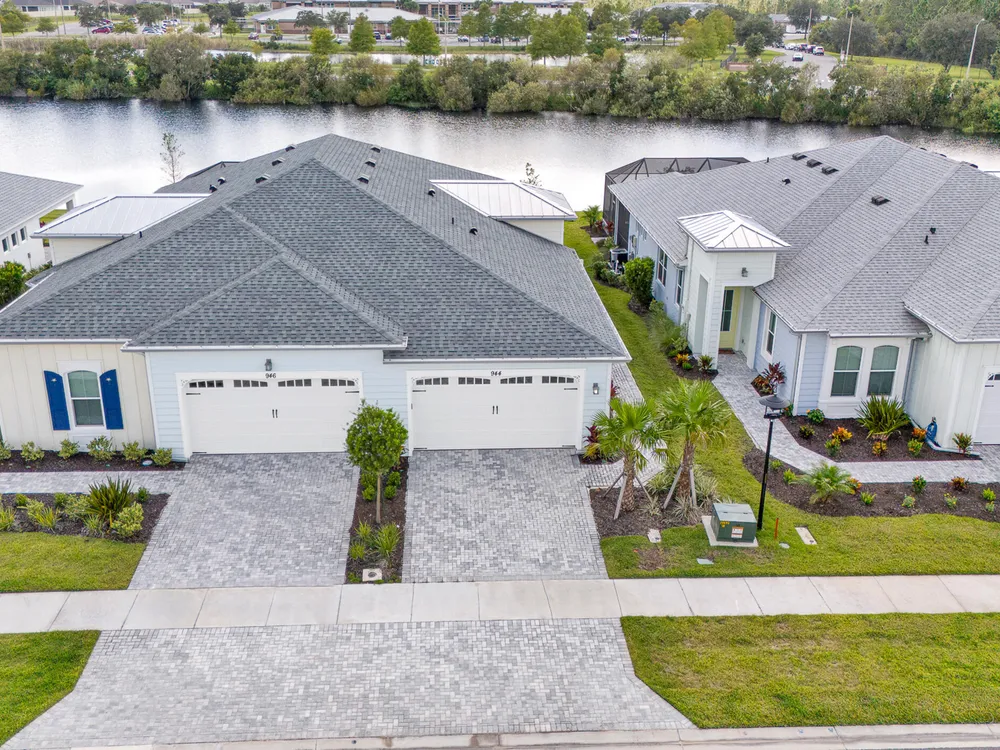 Wanna move to Margaritaville? This nearly new Antigua Villa is conveniently located by the Resident Only gate with water views, screened covered lanai, and custom beverage station with drink fridge! Eight ft. doors, Ceramic diagonal tile flooring, Glass front door, disposal button, full quartz backsplash, single sink, Zero-entry primary shower, single handle faucets, granite countertops throughout and iSpring whole house water filtration system! Enjoy the award-winning amenities of this resort-style 55+ community with Private Beach Club with pool, live poolside entertainment daily and concerts every Friday and Saturday at the bandshell in Town Center! Three pools in Town Center, take a class then sauna and spa in Fins Up Fitness Center, play Finball, Bocce ball, Pickleball, oh my! Play Trivia, Canasta, Mahjong, Mexican Train or see a show! Learn Ukulele, Pottery, Woodworking! Join Cycling, Water Volleyball, or a resident special interest club: whiskey, cigars, cruisers, food, decor