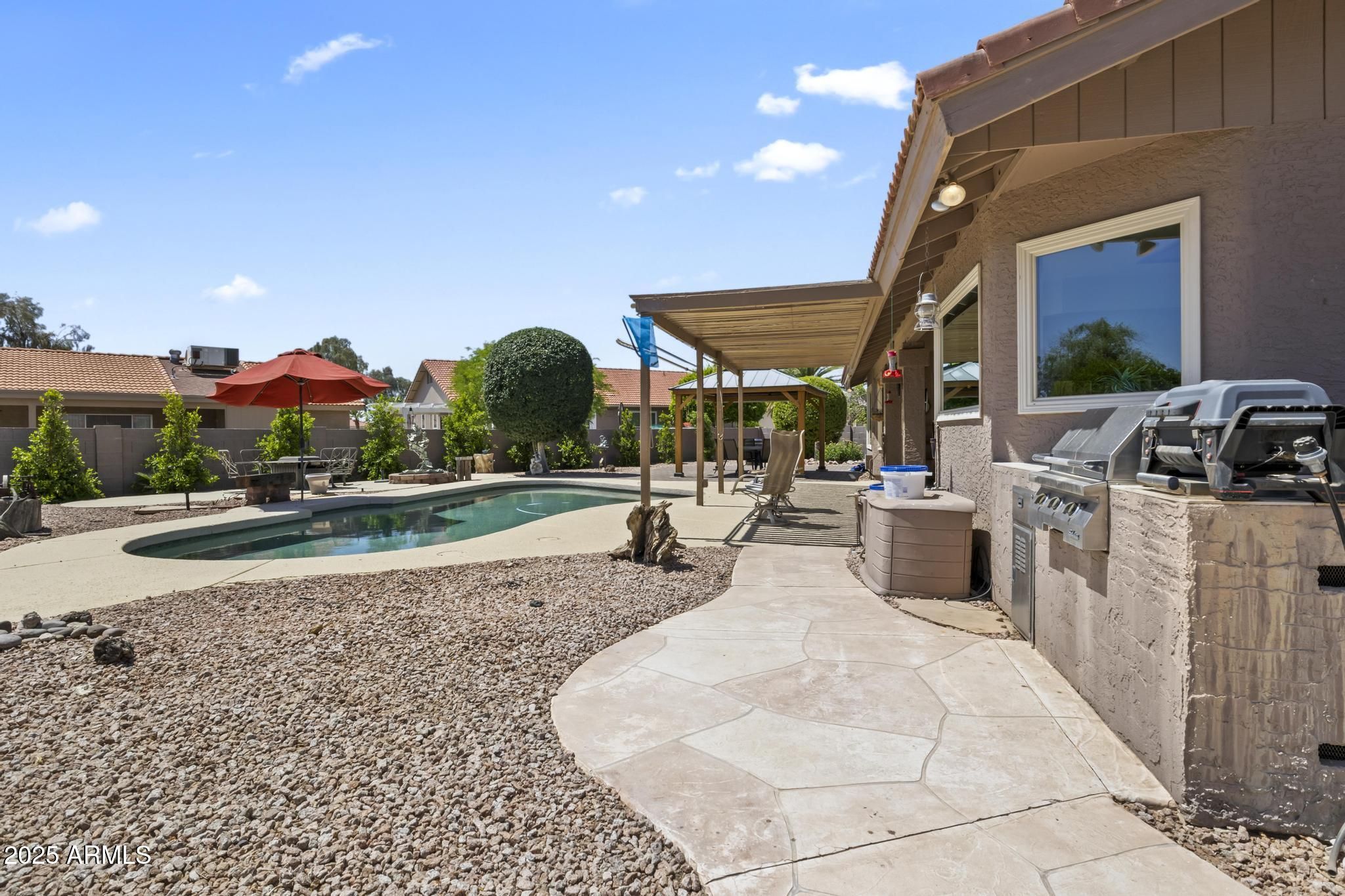 Newly painted and a new roof being installed 2/26. Immaculate single-story home nestled in a quiet cul-de-sac within the vibrant, resort-style community of Sun Lakes. Offering 1,794 sq ft of thoughtfully designed living space, this home combines comfort, style, and functionality. Step inside to an inviting living room filled with natural light, seamlessly flowing into a formal dining area--ideal for hosting gatherings and holiday dinners. The beautifully kitchen features granite countertops, stainless steel appliances, and ample cabinetry, perfect for the home chef. Retreat to a spacious primary suite with a walk-in closet and spa-inspired en suite bathroom, complete with dual vanities and a custom walk-in shower. Two additional bedrooms offer flexibility for guests or a home office. Backyard oasis with a paradise complete with a covered patio, built-in BBQ, putt-putt golf and a sparkling pool. It's the perfect setting for soaking up the Arizona sunshine or entertaining under the stars. Enjoy all the amenities Sun Lakes has to offer golf, pickleball, clubs, restaurants, and more. Don't miss your chance to own this exceptional home.