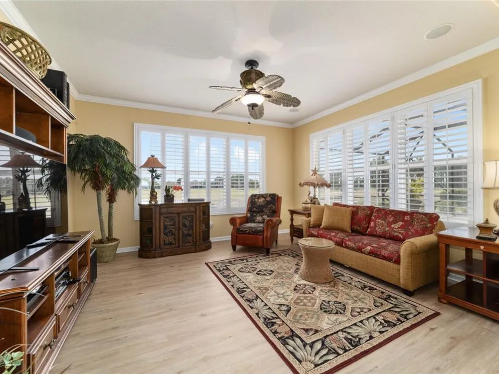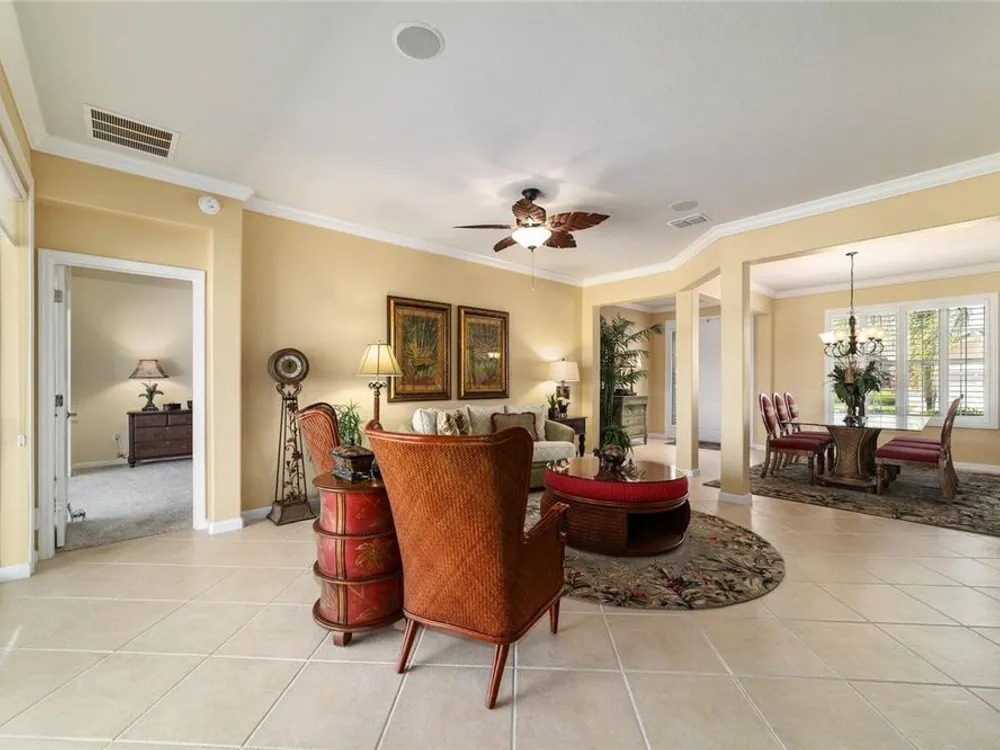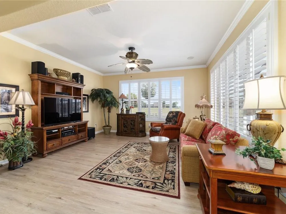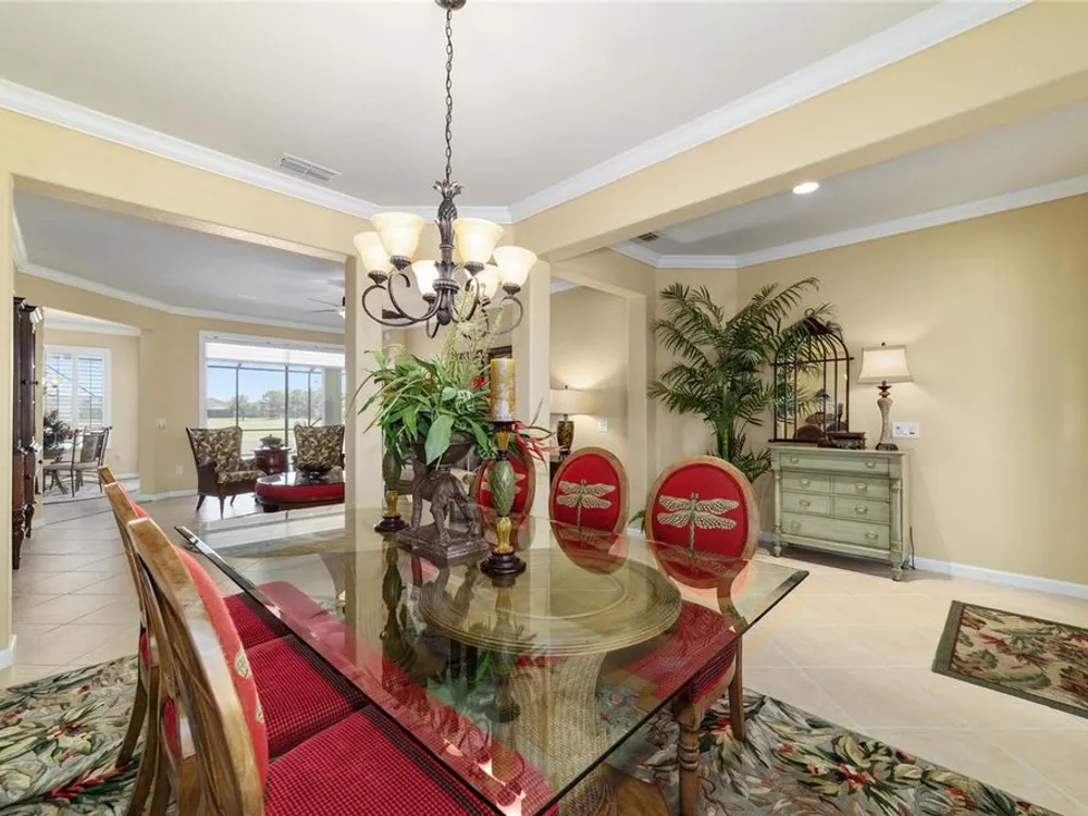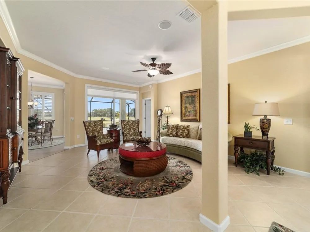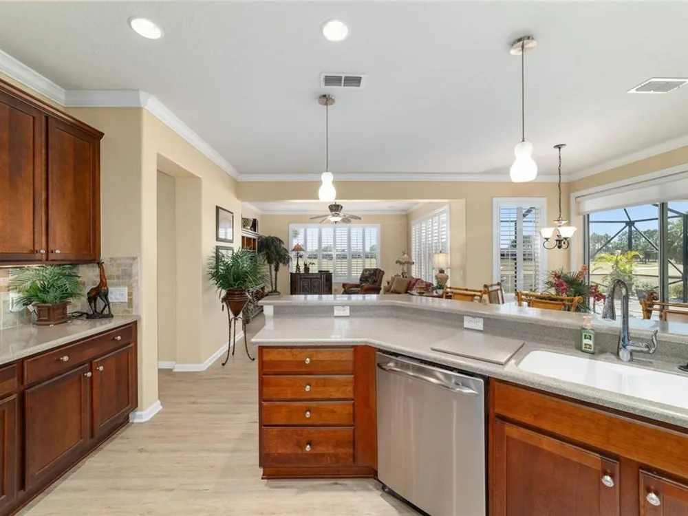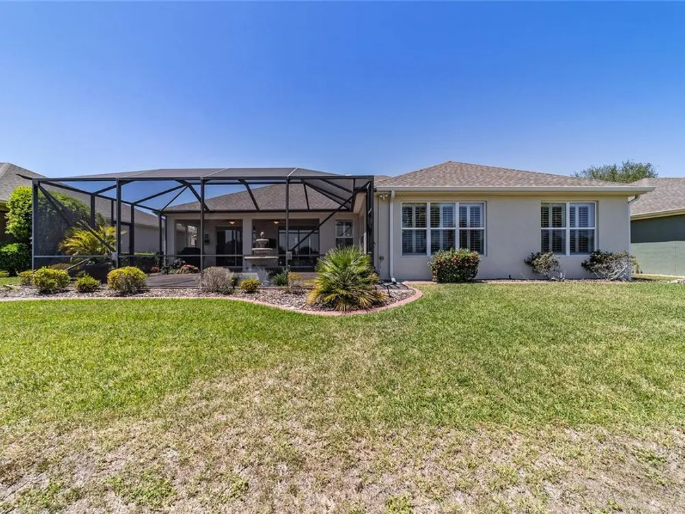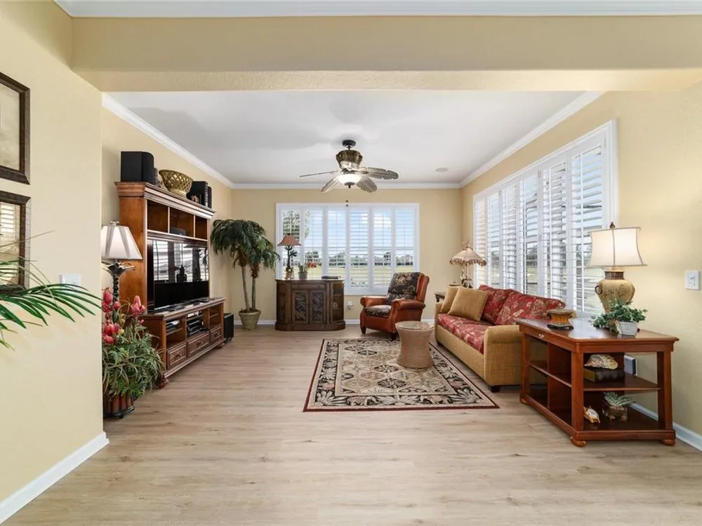 OPPORTUNITY AWAITS – PANORAMIC GOLF VIEW UNDER $484,000! If you’ve been dreaming of a home with breathtaking panoramic golf course views and generous living space, this is your chance! Welcome to a luxurious retreat in the highly sought-after 55+ community of Stone Creek by Del Webb. This beautifully maintained home offers 2,413 square feet of elegance and comfort, perfectly blending indoor sophistication with outdoor serenity. Situated on a premium golf course lot, this residence features three bedrooms and two baths, designed with an open, airy layout that highlights the incredible views. The main living areas are adorned with crown molding and ceiling fans throughout, creating an inviting and refined atmosphere. The chef’s kitchen is a true highlight, featuring wood cabinetry, stainless steel appliances, solid surface countertops, and an elegant tile backsplash—ideal for cooking, entertaining, and gathering with friends and family. Enjoy seamless indoor-outdoor living with sliding glass doors from the living room, breakfast nook, and primary suite that open to the expansive screened-in lanai, perfect for morning coffee or evening relaxation while overlooking the lush greens. The primary suite is a private sanctuary, offering lanai access, a walk-in tiled shower, and a custom walk-in closet. Step outside to the extended lanai with birdcage screening, where you can unwind year-round and enjoy the tranquil Florida lifestyle. Additional features include a three-car garage, offering ample space for vehicles, golf carts, or storage, and upgraded landscaping that enhances the home’s beautiful curb appeal. Living in Stone Creek by Del Webb means more than just owning a home—it’s embracing a lifestyle. The community offers an 18-hole championship golf course, club and grille, resort-style pool and spa, fitness center, and numerous recreational activities such as pickleball, tennis, bocce, shuffleboard, softball, and billiards. Whether you’re seeking relaxation, recreation, or social connection, Stone Creek has it all. Conveniently located near dining, shopping, and local attractions, this home offers the perfect combination of luxury, community, and convenience. Don’t miss your opportunity to own one of the best golf-view homes in Stone Creek—schedule your private tour today and experience firsthand the elegance, comfort, and unmatched setting of this remarkable property.