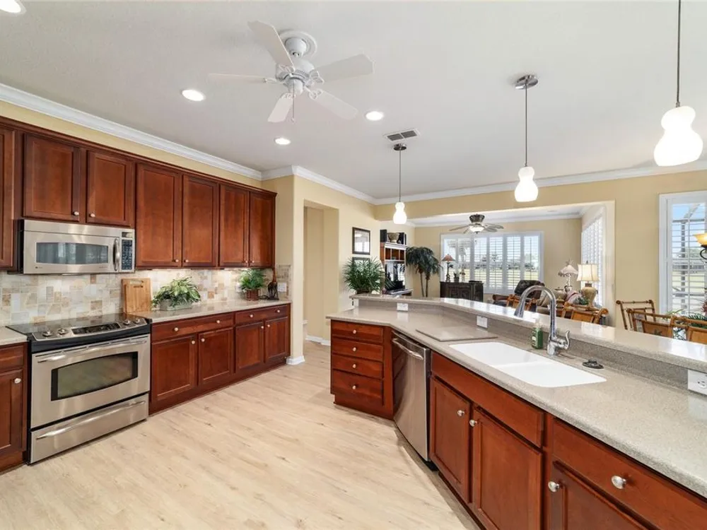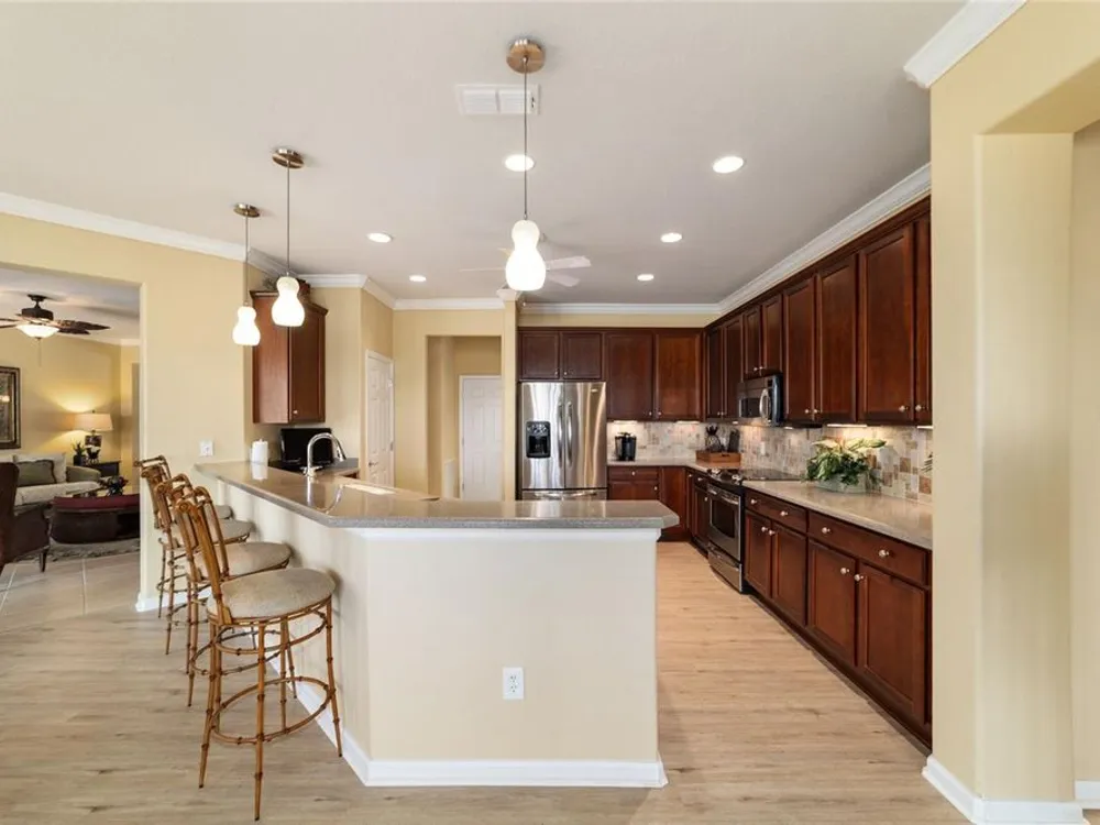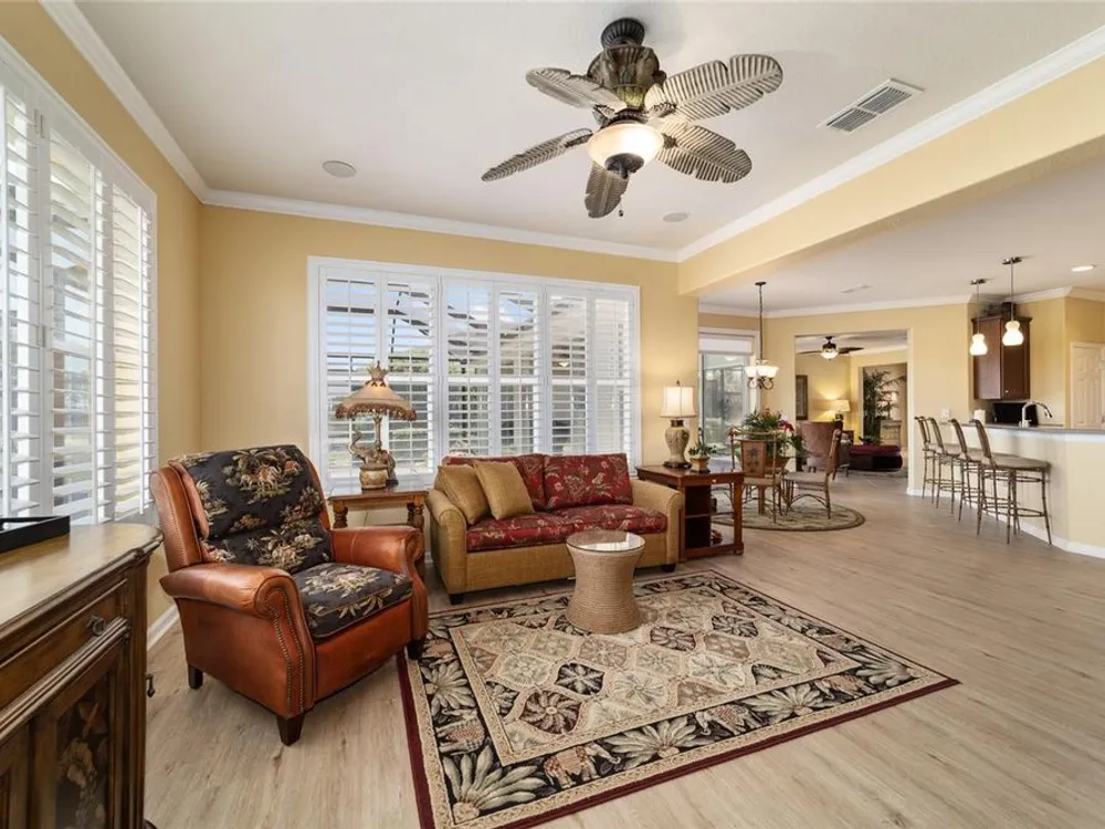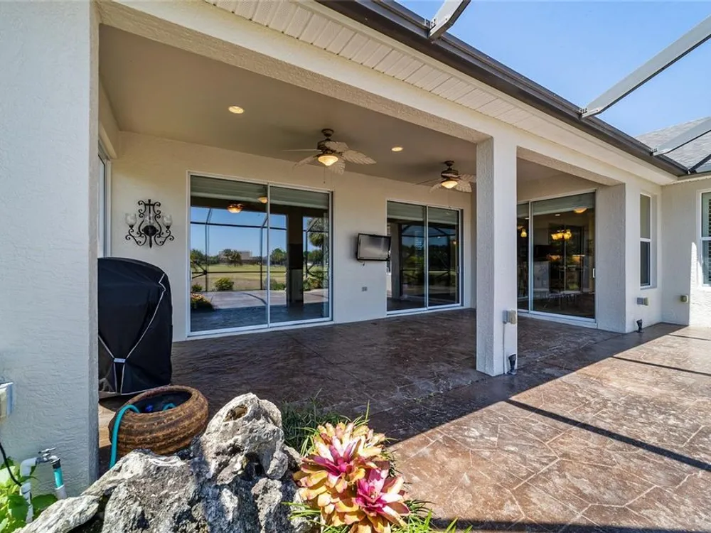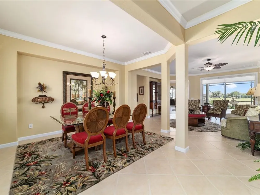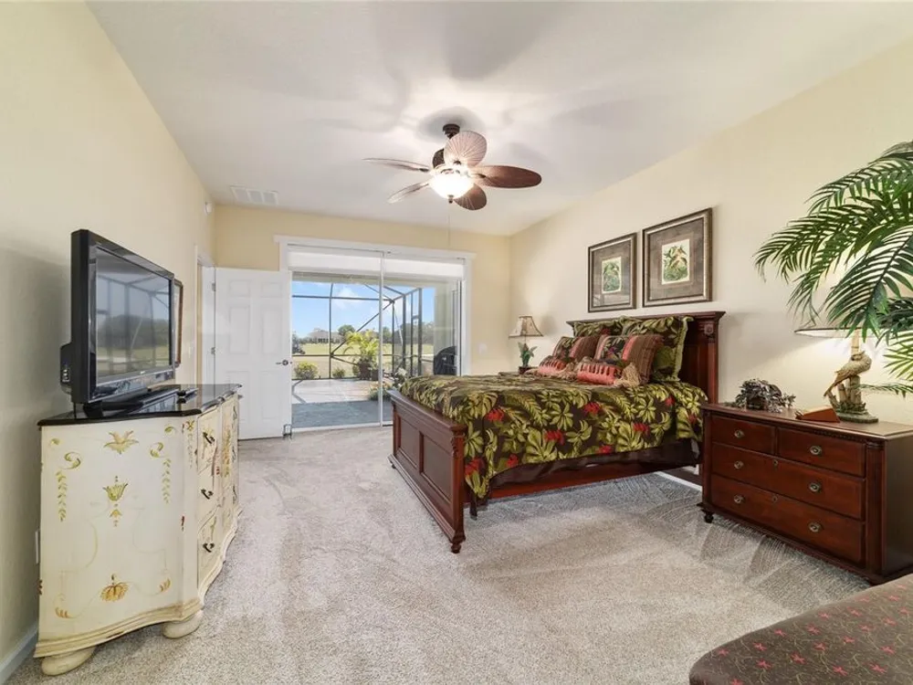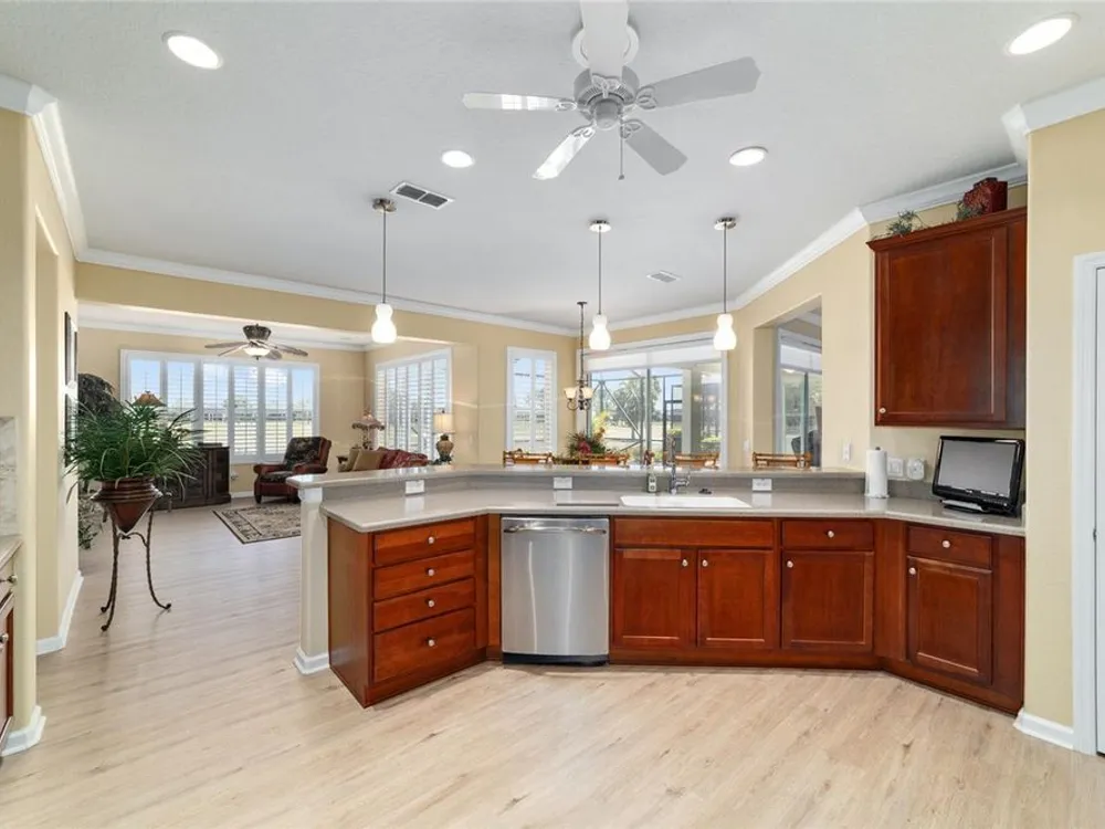OPPORTUNITY AWAITS – PANORAMIC GOLF VIEW UNDER $484,000! If you’ve been dreaming of a home with breathtaking panoramic golf course views and generous living space, this is your chance! Welcome to a luxurious retreat in the highly sought-after 55+ community of Stone Creek by Del Webb. This beautifully maintained home offers 2,413 square feet of elegance and comfort, perfectly blending indoor sophistication with outdoor serenity. Situated on a premium golf course lot, this residence features three bedrooms and two baths, designed with an open, airy layout that highlights the incredible views. The main living areas are adorned with crown molding and ceiling fans throughout, creating an inviting and refined atmosphere. The chef’s kitchen is a true highlight, featuring wood cabinetry, stainless steel appliances, solid surface countertops, and an elegant tile backsplash—ideal for cooking, entertaining, and gathering with friends and family. Enjoy seamless indoor-outdoor living with sliding glass doors from the living room, breakfast nook, and primary suite that open to the expansive screened-in lanai, perfect for morning coffee or evening relaxation while overlooking the lush greens. The primary suite is a private sanctuary, offering lanai access, a walk-in tiled shower, and a custom walk-in closet. Step outside to the extended lanai with birdcage screening, where you can unwind year-round and enjoy the tranquil Florida lifestyle. Additional features include a three-car garage, offering ample space for vehicles, golf carts, or storage, and upgraded landscaping that enhances the home’s beautiful curb appeal. Living in Stone Creek by Del Webb means more than just owning a home—it’s embracing a lifestyle. The community offers an 18-hole championship golf course, club and grille, resort-style pool and spa, fitness center, and numerous recreational activities such as pickleball, tennis, bocce, shuffleboard, softball, and billiards. Whether you’re seeking relaxation, recreation, or social connection, Stone Creek has it all. Conveniently located near dining, shopping, and local attractions, this home offers the perfect combination of luxury, community, and convenience. Don’t miss your opportunity to own one of the best golf-view homes in Stone Creek—schedule your private tour today and experience firsthand the elegance, comfort, and unmatched setting of this remarkable property.
