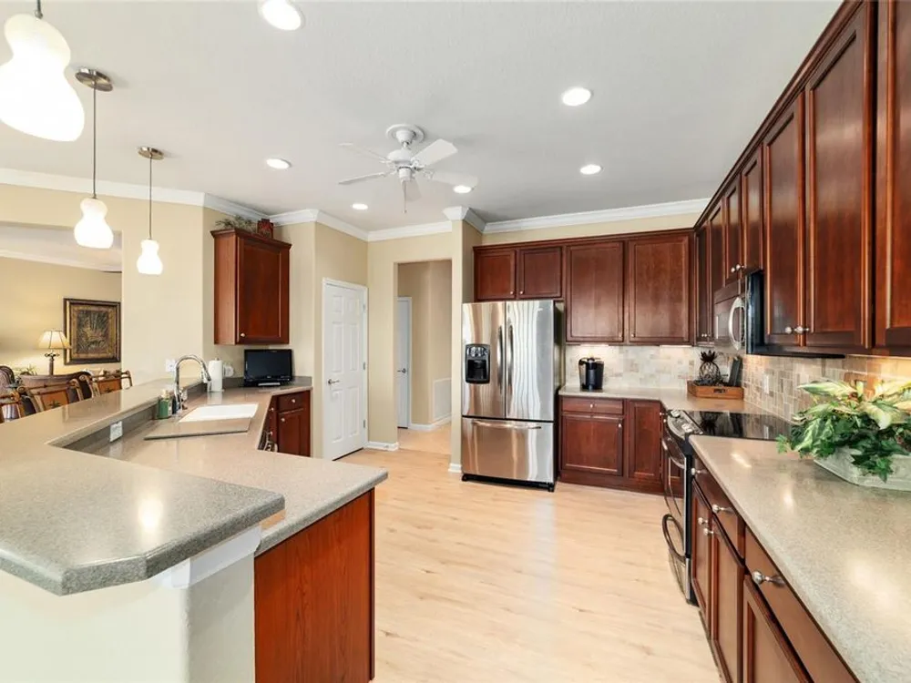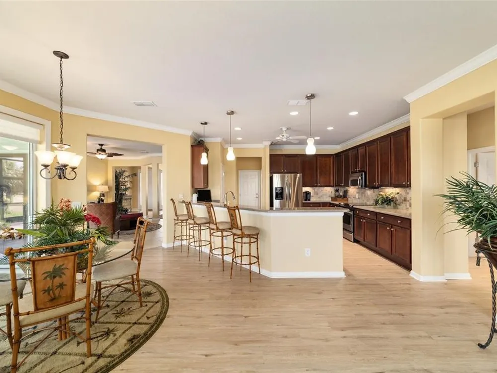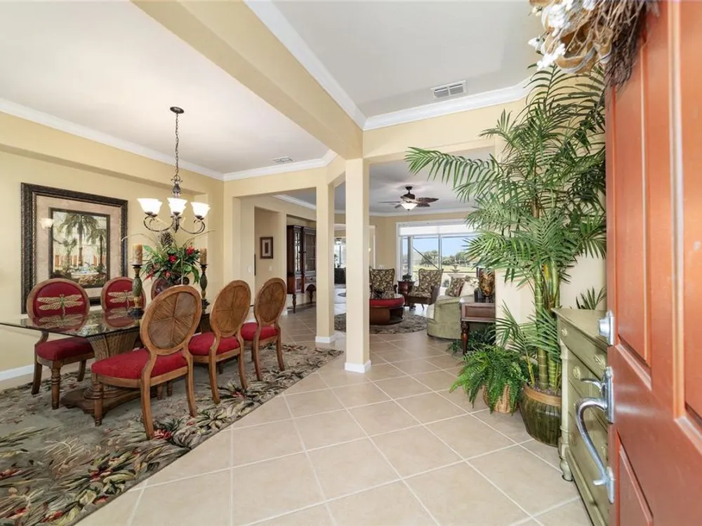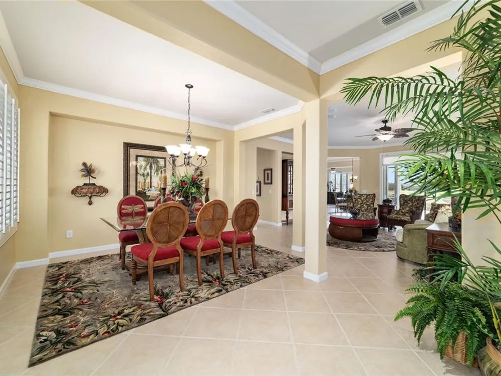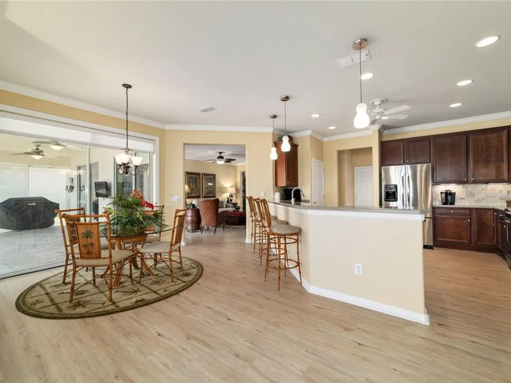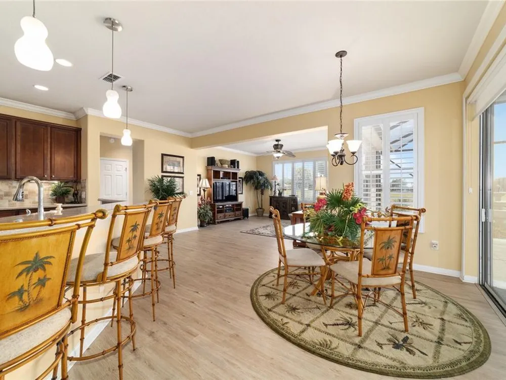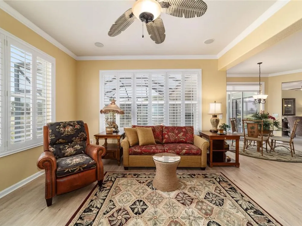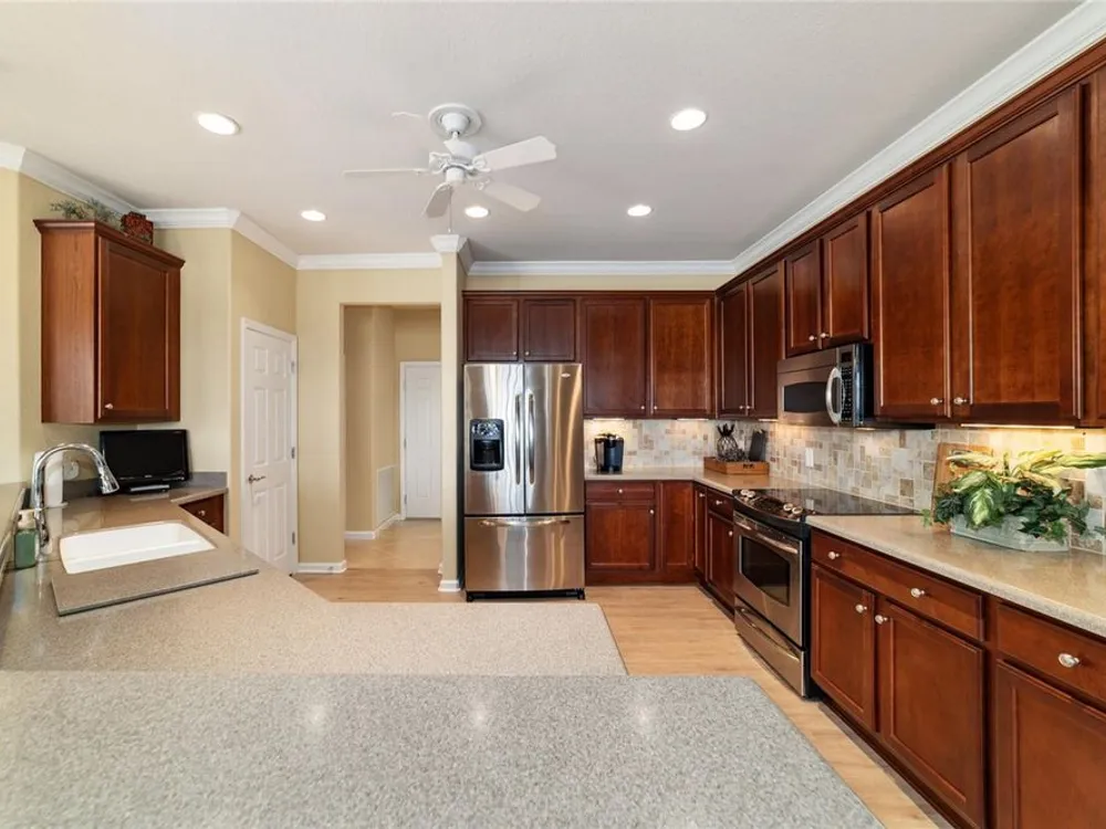OPPORTUNITY AWAITS – PANORAMIC GOLF VIEW UNDER $484,000! If you’ve been dreaming of a home with breathtaking panoramic golf course views and generous living space, this is your chance! Welcome to a luxurious retreat in the highly sought-after 55+ community of Stone Creek by Del Webb. This beautifully maintained home offers 2,413 square feet of elegance and comfort, perfectly blending indoor sophistication with outdoor serenity. Situated on a premium golf course lot, this residence features three bedrooms and two baths, designed with an open, airy layout that highlights the incredible views. The main living areas are adorned with crown molding and ceiling fans throughout, creating an inviting and refined atmosphere. The chef’s kitchen is a true highlight, featuring wood cabinetry, stainless steel appliances, solid surface countertops, and an elegant tile backsplash—ideal for cooking, entertaining, and gathering with friends and family. Enjoy seamless indoor-outdoor living with sliding glass doors from the living room, breakfast nook, and primary suite that open to the expansive screened-in lanai, perfect for morning coffee or evening relaxation while overlooking the lush greens. The primary suite is a private sanctuary, offering lanai access, a walk-in tiled shower, and a custom walk-in closet. Step outside to the extended lanai with birdcage screening, where you can unwind year-round and enjoy the tranquil Florida lifestyle. Additional features include a three-car garage, offering ample space for vehicles, golf carts, or storage, and upgraded landscaping that enhances the home’s beautiful curb appeal. Living in Stone Creek by Del Webb means more than just owning a home—it’s embracing a lifestyle. The community offers an 18-hole championship golf course, club and grille, resort-style pool and spa, fitness center, and numerous recreational activities such as pickleball, tennis, bocce, shuffleboard, softball, and billiards. Whether you’re seeking relaxation, recreation, or social connection, Stone Creek has it all. Conveniently located near dining, shopping, and local attractions, this home offers the perfect combination of luxury, community, and convenience. Don’t miss your opportunity to own one of the best golf-view homes in Stone Creek—schedule your private tour today and experience firsthand the elegance, comfort, and unmatched setting of this remarkable property.