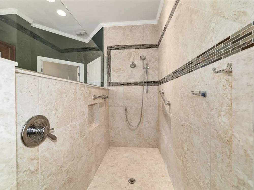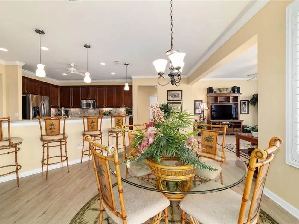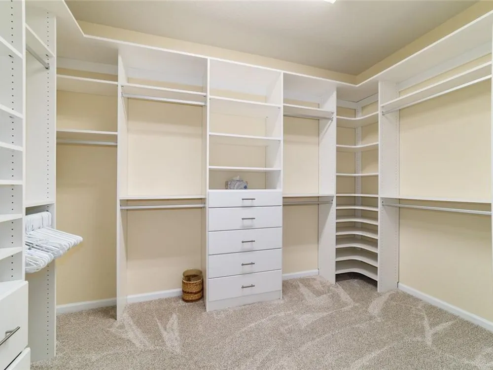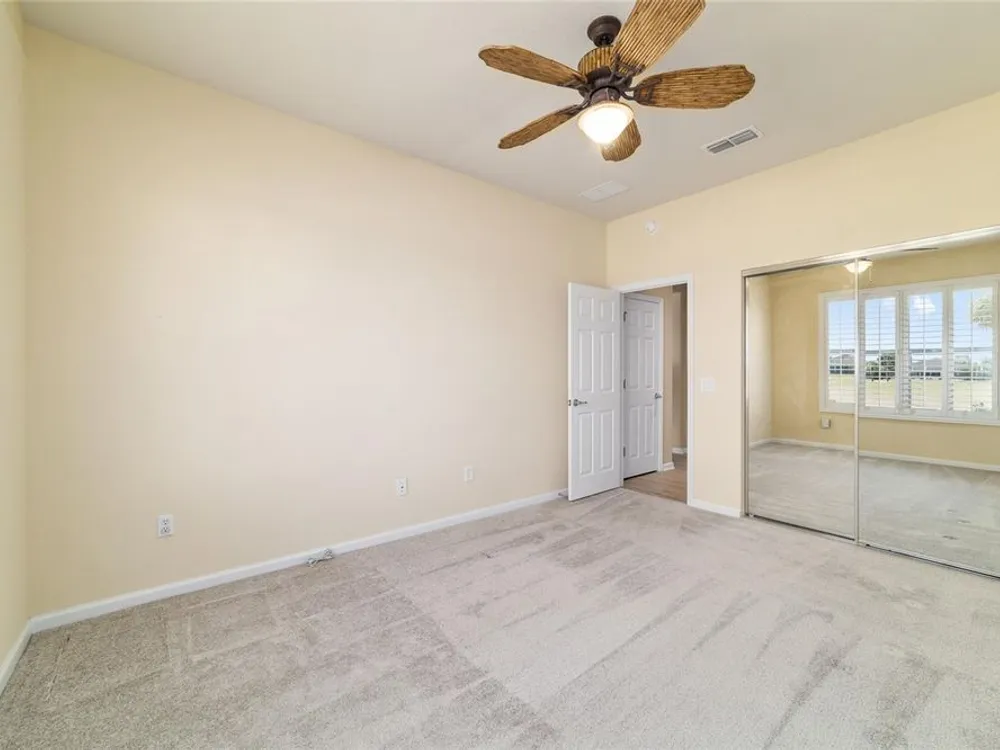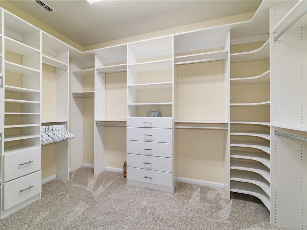 - Ceiling Fan(s), Crown Molding, Eat-in Kitchen, High Ceilings, In-Wall Pest Control, Kitchen/Family Room Combo, Living/Dining Room, Open Floorplan, Main Level Primary, Split Bedrooms, Stone Counters, Thermostat, Walk-In Closet(s), Window Treatments