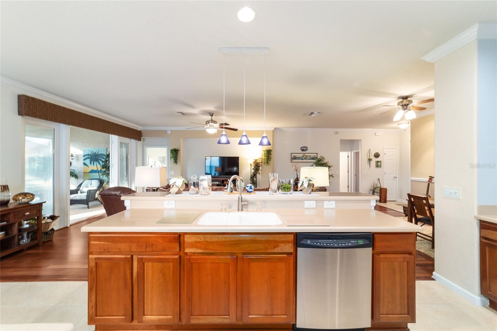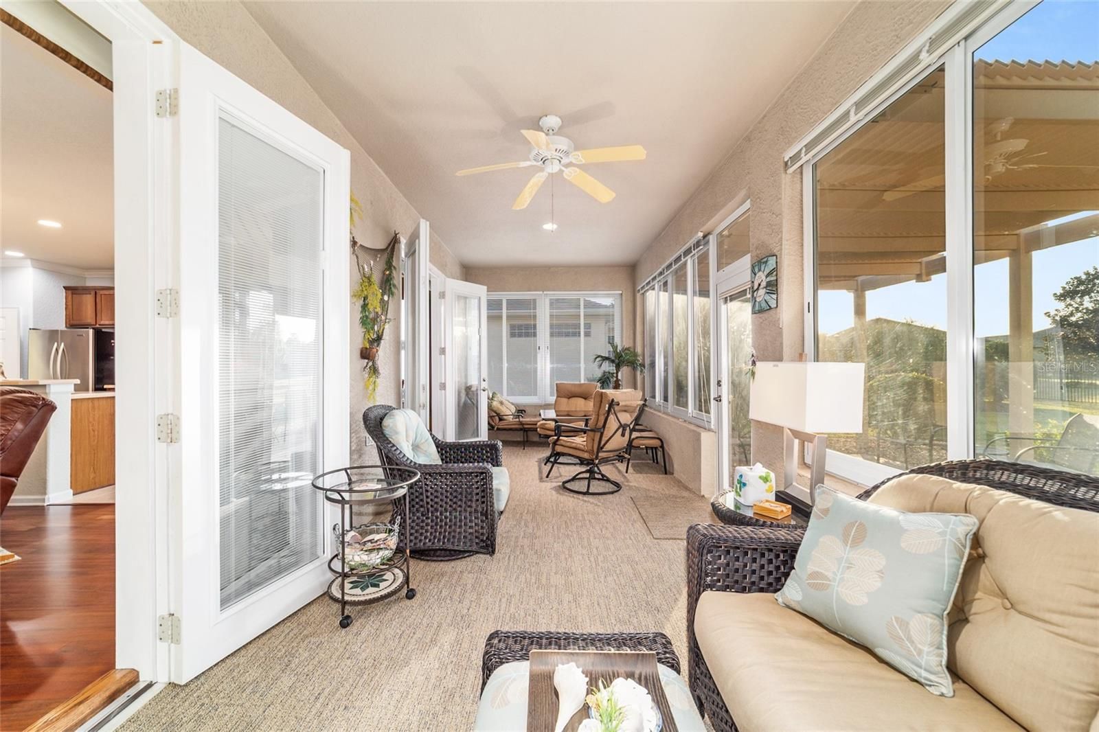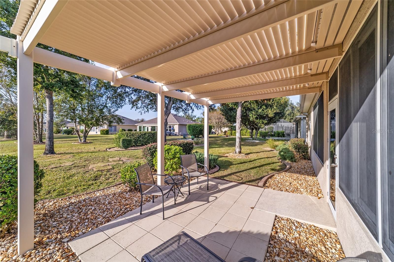 Welcome to Stone Creek, a premier resort-style 55+ active adult community in Ocala. This beautifully maintained Sheridan model overlooks a tranquil, park-like setting—your own peaceful backdrop for morning coffee or evening relaxation. Inside, you’ll find high ceilings, crown molding, and wood flooring throughout, creating a warm, elevated feel. The open floor plan seamlessly connects the living room and kitchen, perfect for everyday living and entertaining. The kitchen features hard-surface countertops, stainless steel appliances, a breakfast bar, closet pantry, and abundant cabinetry. Enjoy both casual dining space and a dedicated dining area. The primary suite offers a spacious walk-in closet, dual sinks, a private water closet, and a walk-in shower. Two additional bedrooms provide comfortable accommodations for guests or flexible space for hobbies and an office. French doors lead to the enclosed lanai, where you can savor the peaceful backyard views, while the pergola adds shade and charm to the outdoor space. Additional features include an indoor utility room, two-car garage, 2023 roof, and 2021 HVAC & windows for peace of mind. Fantastic activities throughout Stone Creek for your enjoyment. Furnishings and the electric Club Car golf cart may be purchased separately.