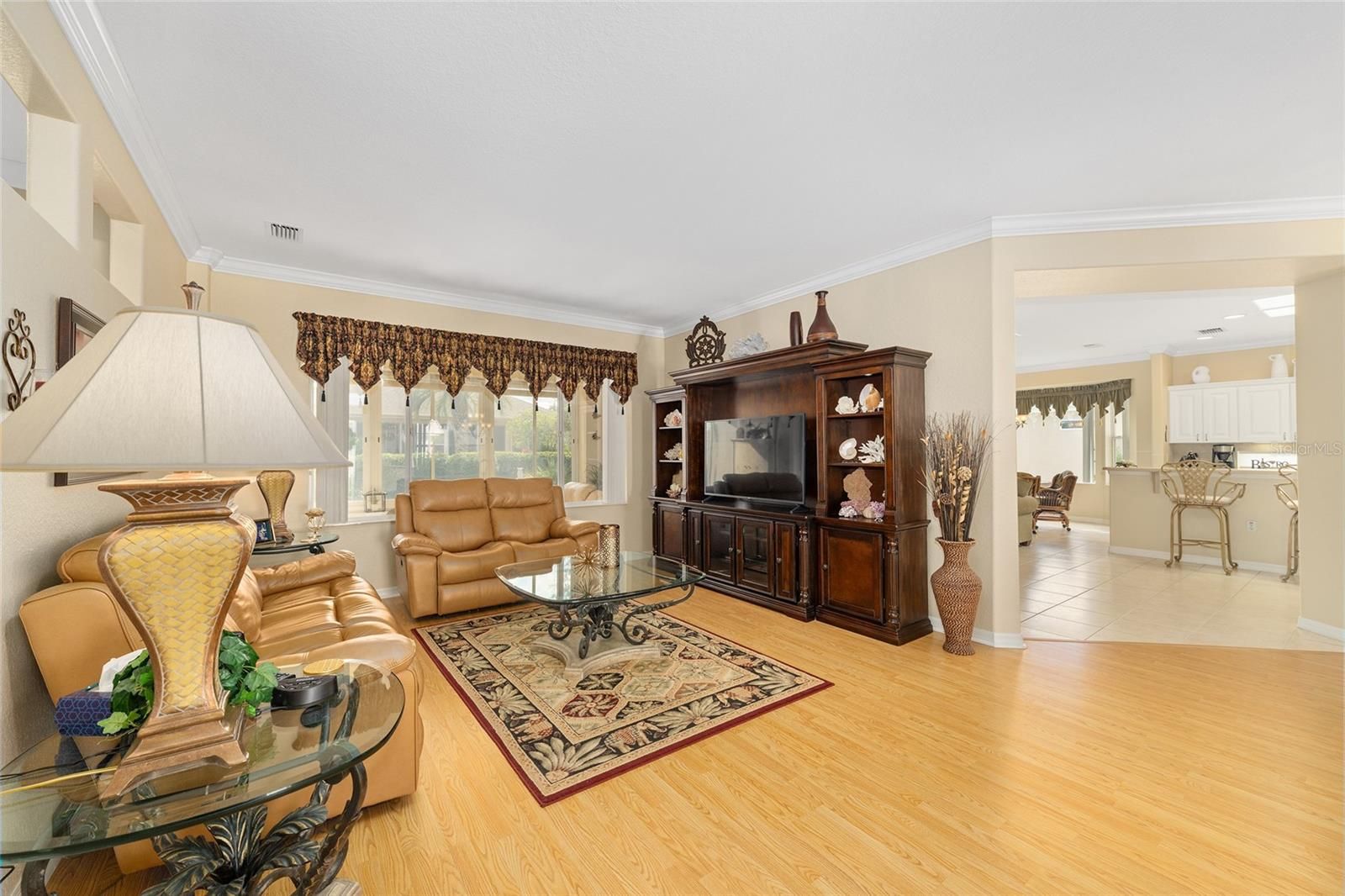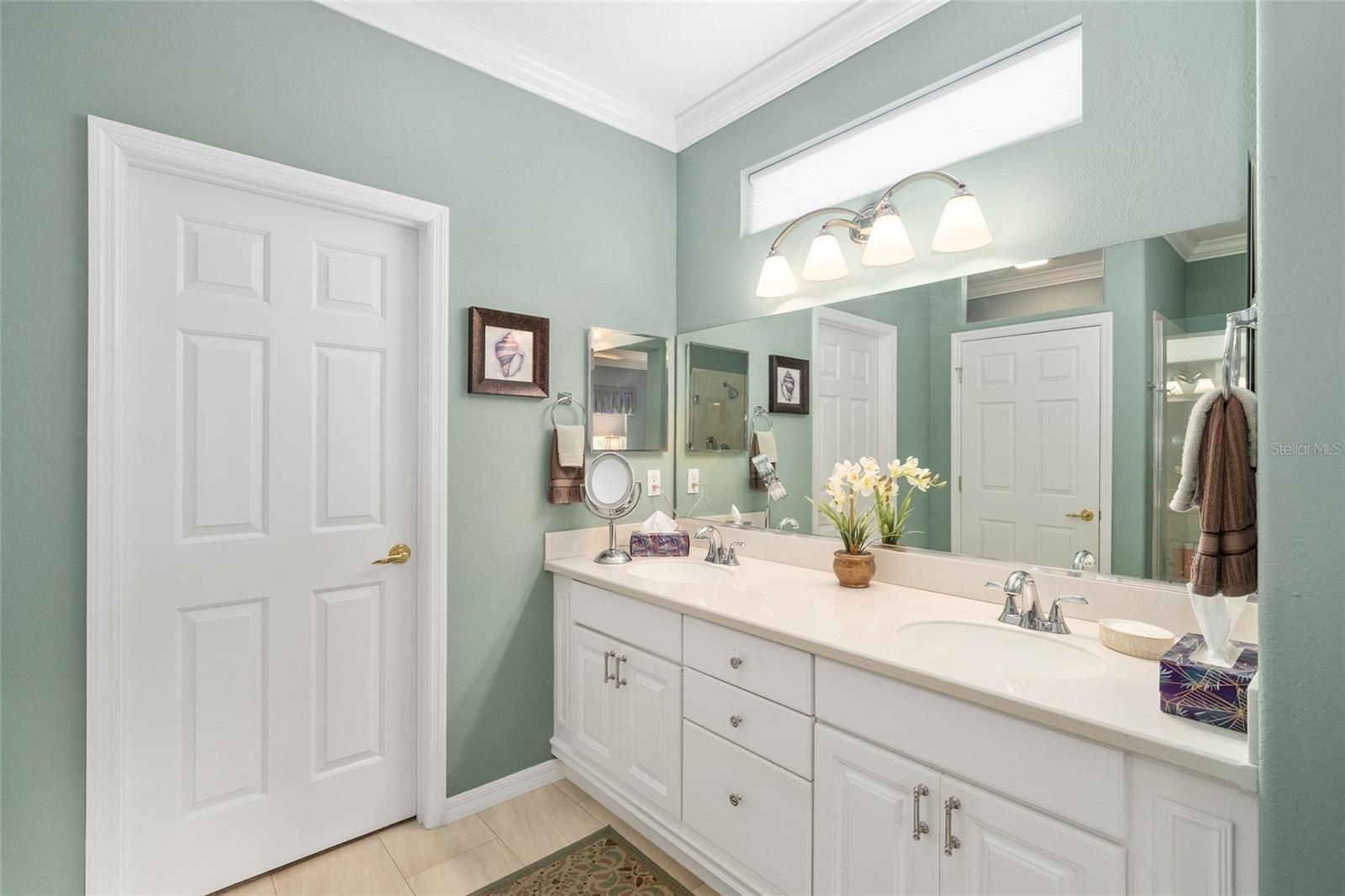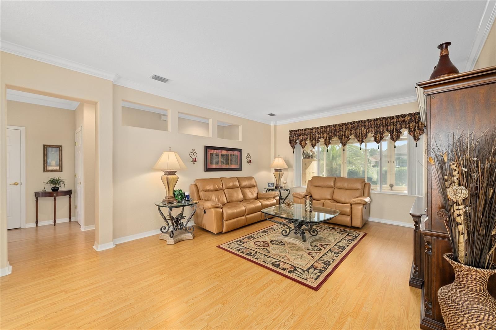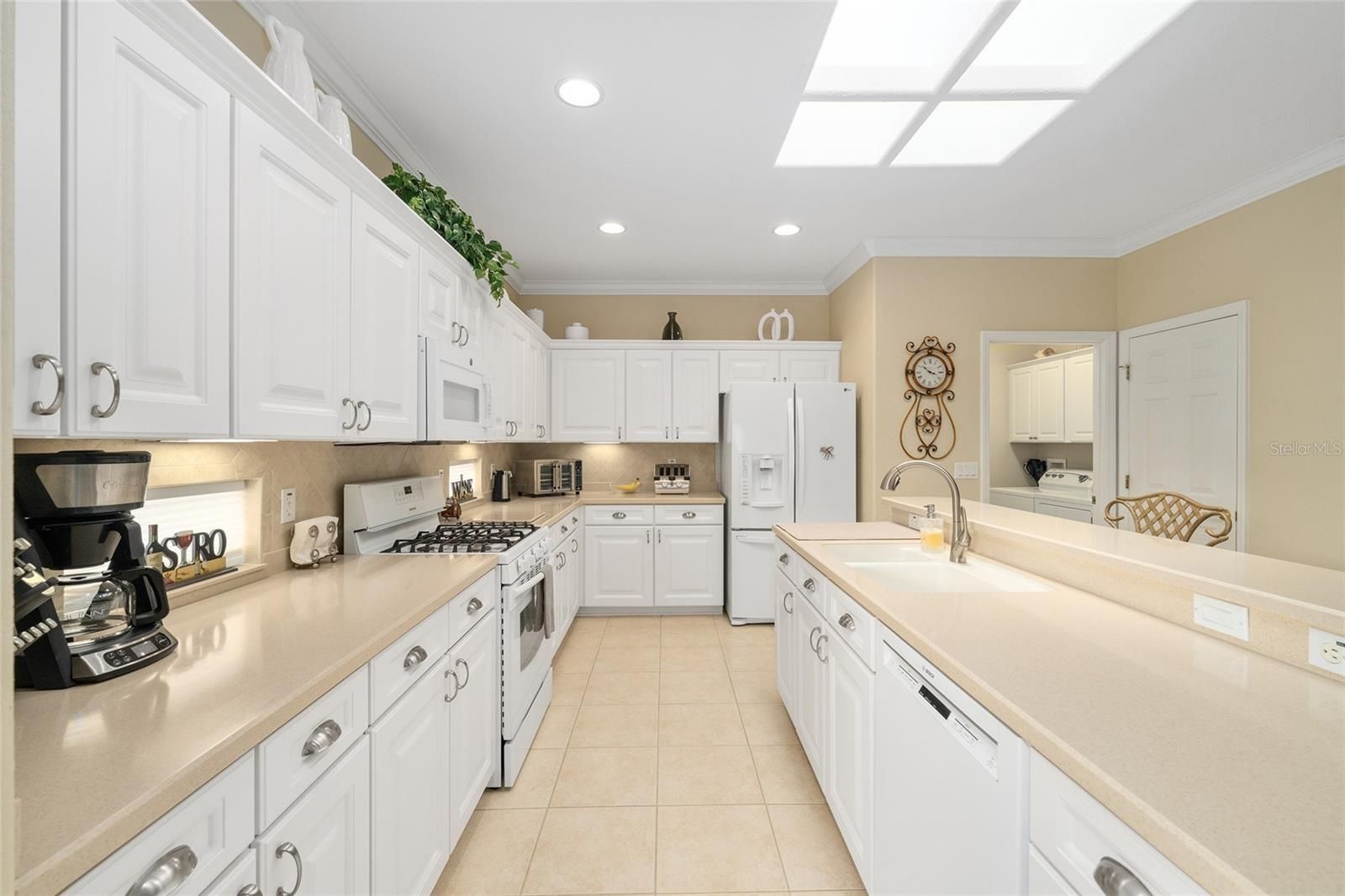 IMMACULATE ST. GEORGE MODEL – SHOWS LIKE A DESIGNER HOME! This immaculate 2-bedroom, 2-bath St. George model sits proudly on a beautifully landscaped corner lot and shows like a model home. Step through the leaded glass front door and you’ll immediately notice the care and upgrades throughout — with ceramic tile and laminate flooring only (NO carpet anywhere!).The kitchen is a standout with its granite countertops, tiled backsplash, white cabinetry, newer stainless steel appliances including a gas range, upgraded sink, skylights, recipe windows, and a convenient breakfast bar. Crown molding graces every room, adding a touch of elegance throughout. Perfect for entertaining, the kitchen overlooks the family room so you’re always part of the conversation. The living and dining rooms feature recessed lighting, laminate floors, and vertical blinds, creating a bright and welcoming space. The spacious primary suite includes laminate flooring, crown molding, and mini-shade window treatments. The ensuite bath features a raised double vanity with granite countertops, plus both a water closet and linen closet. The guest bath has also been tastefully updated with a raised vanity and granite counter. The laundry room, located just off the kitchen, offers extra cabinetry for storage and doubles as a butler’s pantry. The extended garage includes pull-down attic stairs, a privacy screen, windows in the garage door, and an epoxy-coated floor. Relax year-round in the enclosed lanai — cooled and heated for comfort — with a painted floor and roller shades. Just outside, enjoy your private 10x12 patio, perfect for grilling or morning coffee. Recent updates include a new roof (2022) and HVAC system (2019). This home truly has it all — pristine condition, smart updates, and exceptional attention to detail. Don’t miss seeing it today!