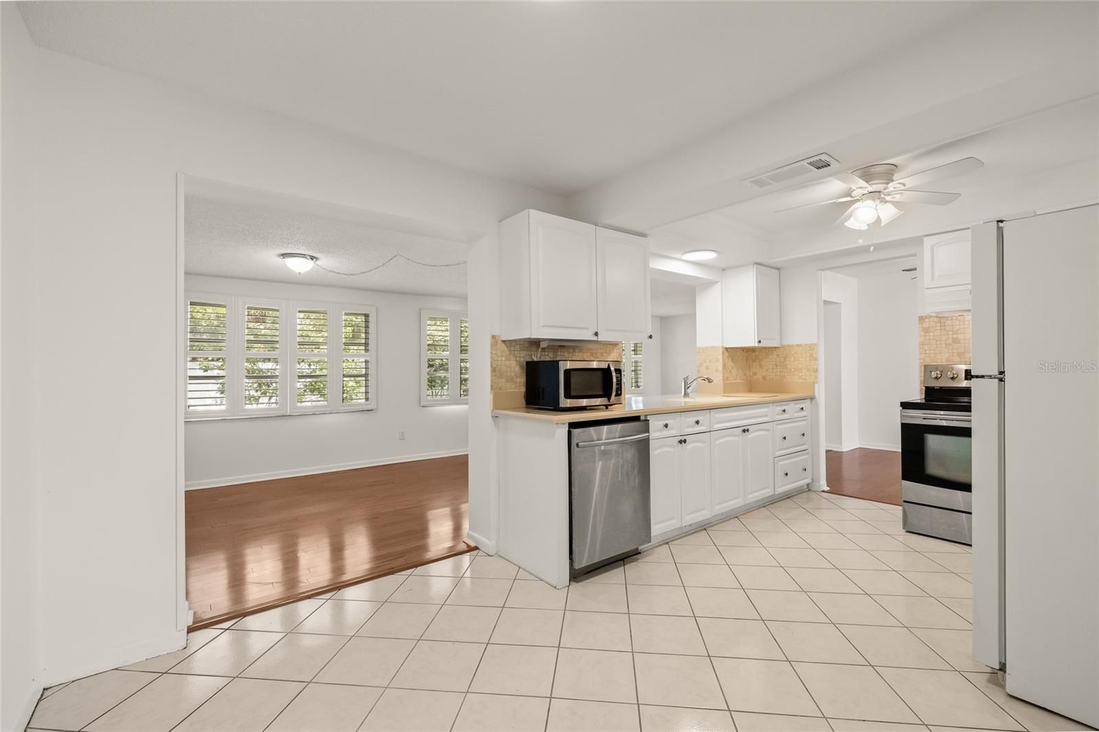 - Ceiling Fan(s), Eat-in Kitchen, Living/Dining Room, Main Level Primary, Solid Surface Counters, Thermostat, Walk-In Closet(s), Window Treatments