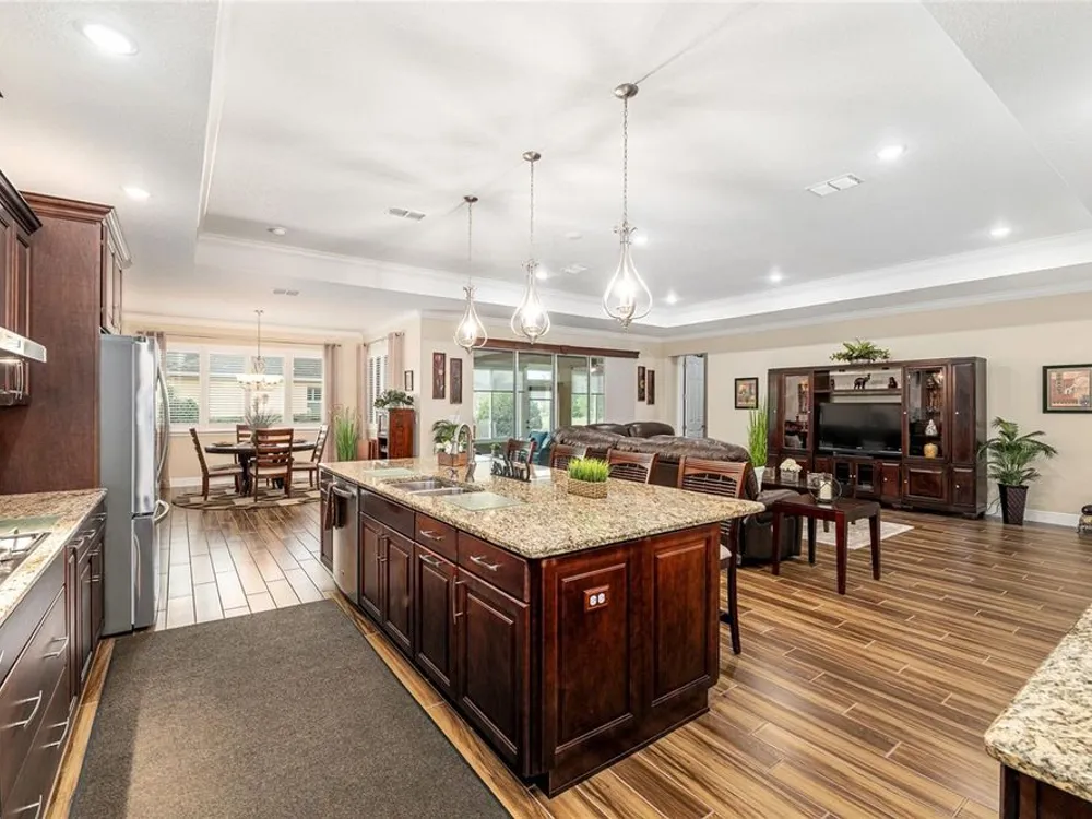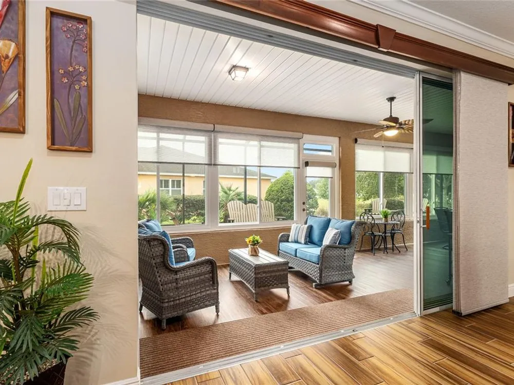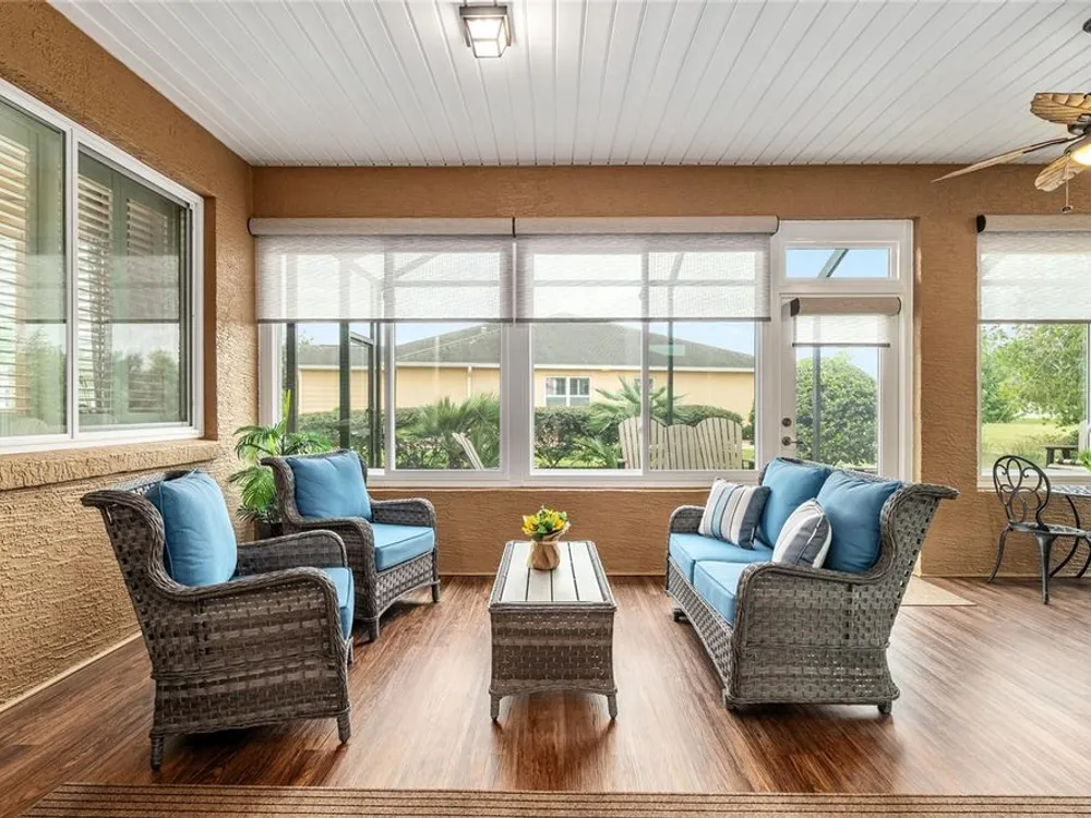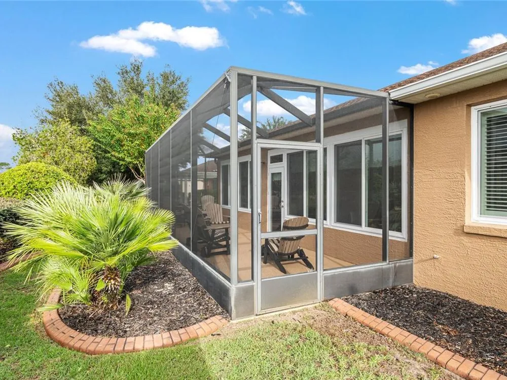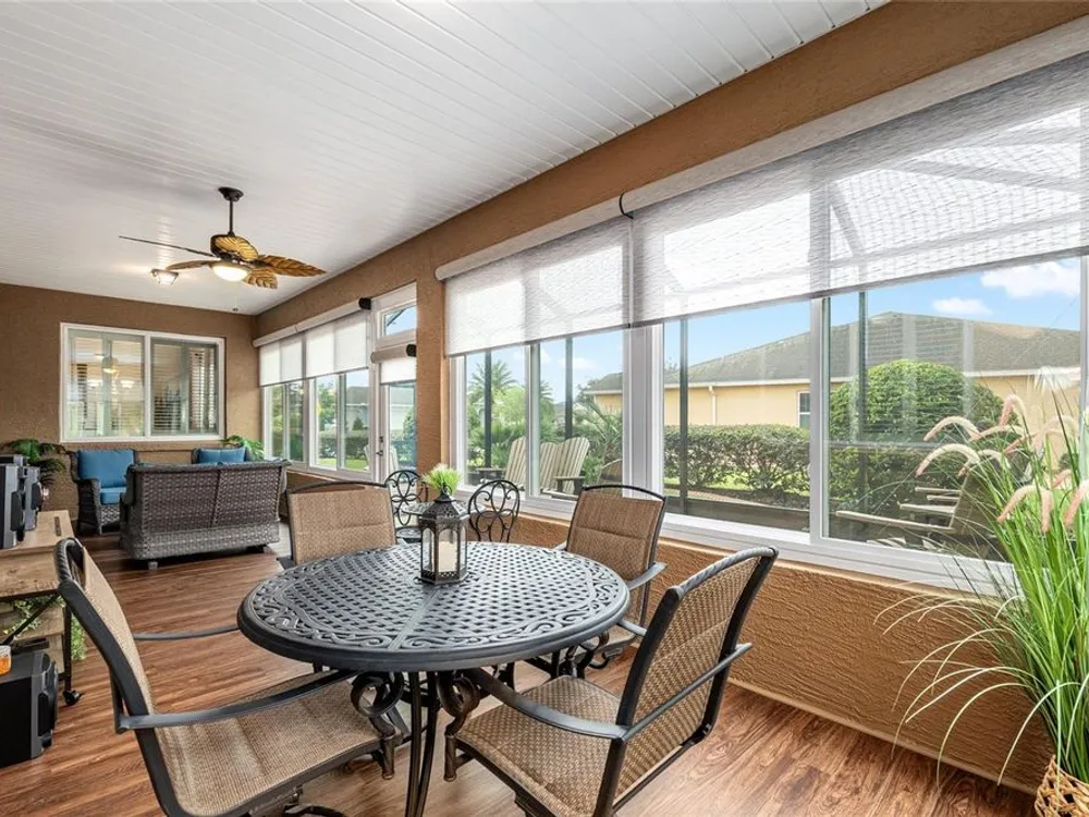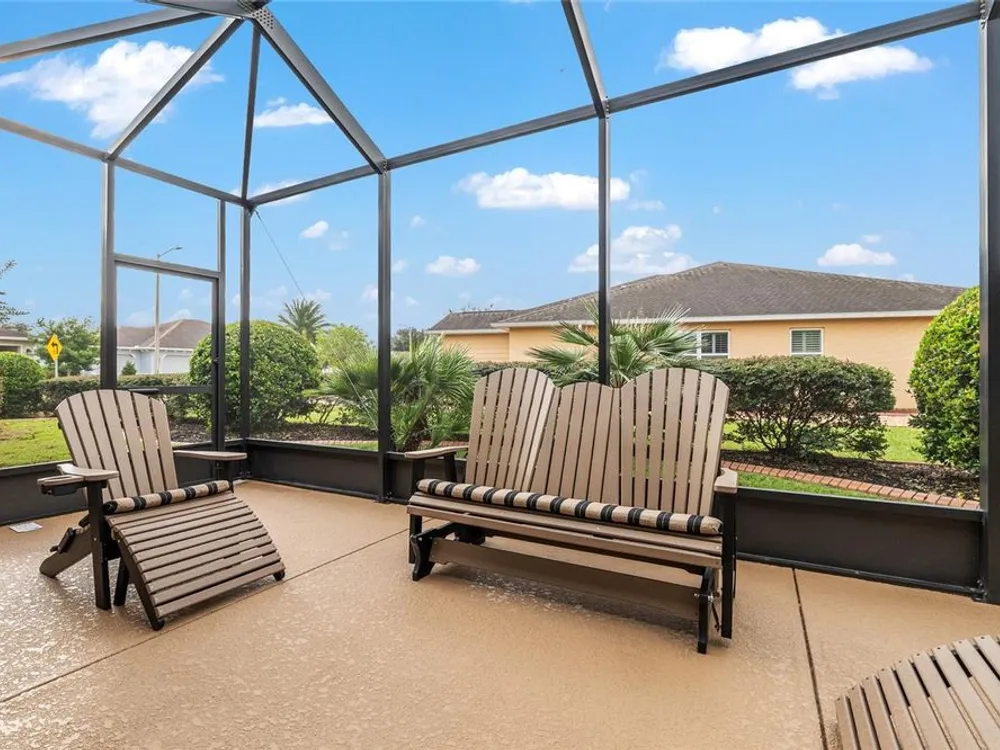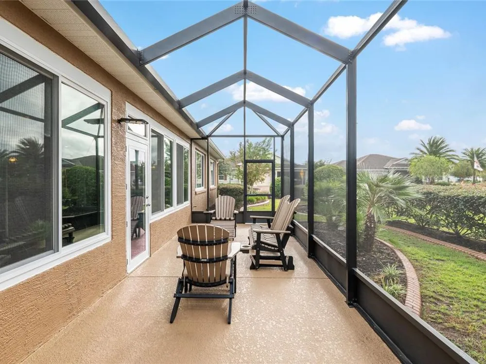 Impeccable and immaculate Northampton home in the Stonebridge community of Candler hills, On Top of the World. This beautiful, spotless, open concept, home with 3 bedrooms, 2 bathrooms, plus flex/den, and library, three season room and spacious 3-car garage sits on a corner oversized lot and is loaded with over $200,000 in upgrades. Every feature has been carefully thought of, crown molding throughout a monumental tray ceiling extending from the living room to the beautiful gourmet kitchen; the kitchen is a chef’s dream, featuring a built-in oven and microwave, a 5-burner cooktop with a sleek hood, staggered cupboards with crown molding soft close cabinets with pull out drawers, spice racks, an oversize island, perfect for meal prepping, entertaining or enjoying your meals. The floors are wood-look like staggered tile throughout. Other features include laundry room cabinets and utility sink, cornice and panel shades in great room, custom pull down shades for the three season room, plantation shutters on all windows, pendant lights in the kitchen, new solar attic fan, garage custom storage cabinets, LVP in the three season room, gutters, beautiful landscaping, curbing, enclosed lanai, Generac generator. The exterior of the home was recently painted and the home is complimented with a long, pavered driveway. This home is perfect for the most discerning buyers. You will not be disappointed. If you've been looking for the perfect home and can't seem to find anything that meets your high standards, don't miss this rare opportunity. No CDD, lower HOA fees, and you own the land in this area. Smoke and pet free home. On Top of the World is Ocala's premier, gated, active 55+ community, loaded with amenities and includes golf cart access to three shopping centers.