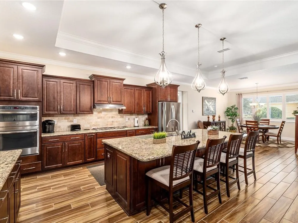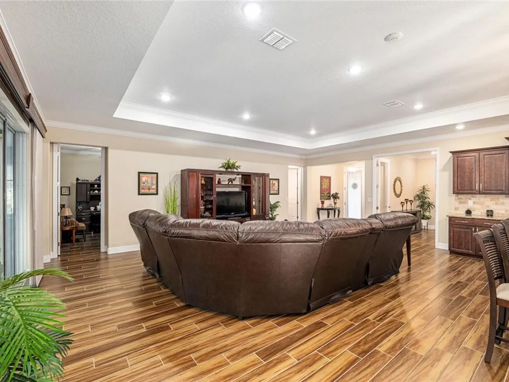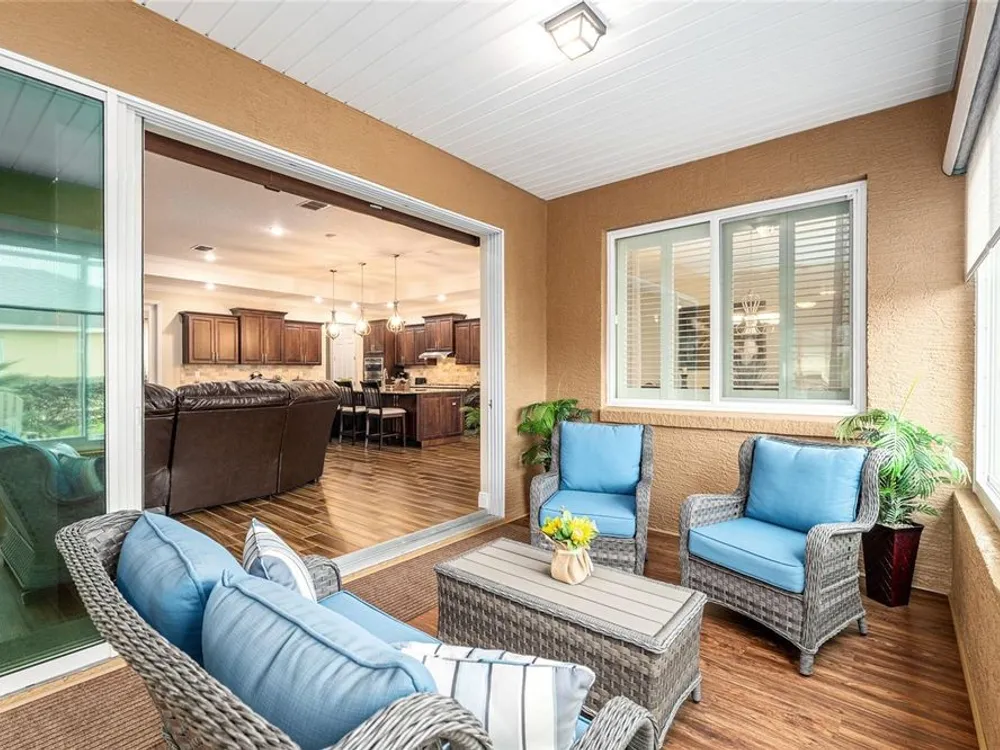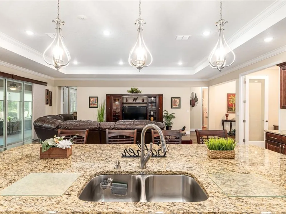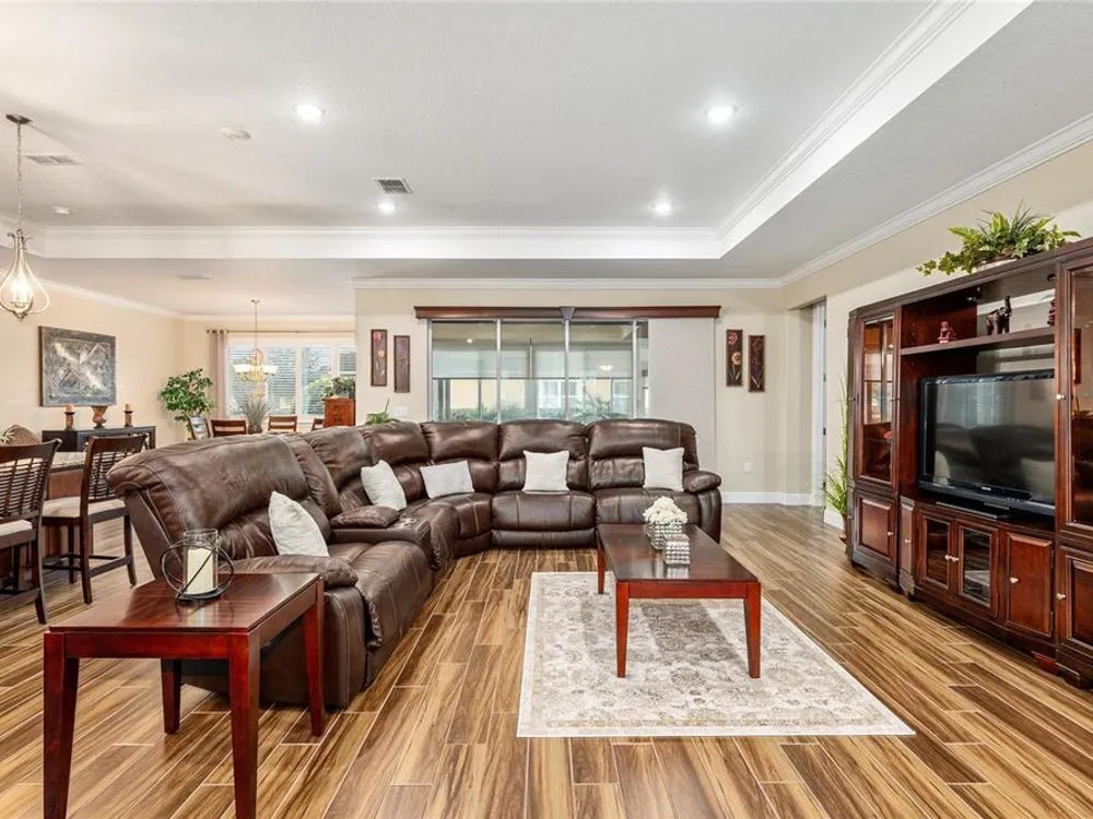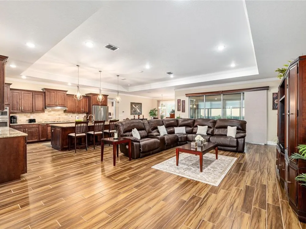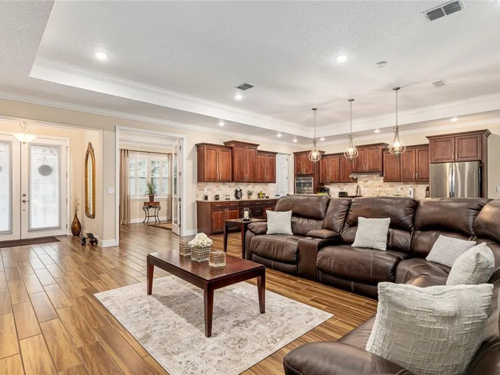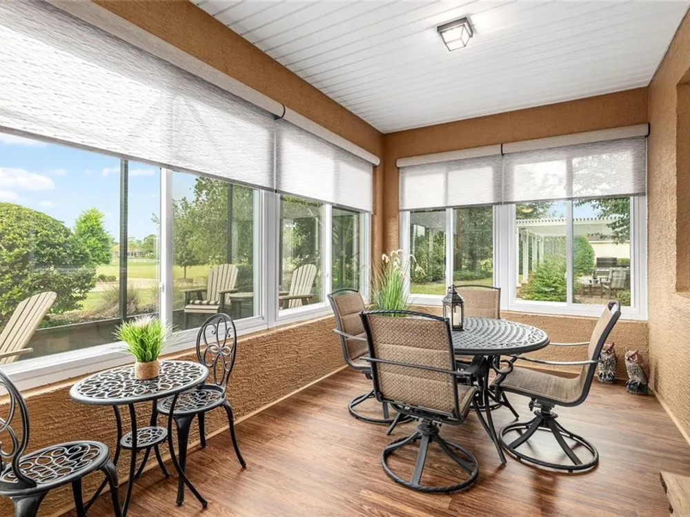 Impeccable and immaculate Northampton home in the Stonebridge community of Candler hills, On Top of the World. This beautiful, spotless, open concept, home with 3 bedrooms, 2 bathrooms, plus flex/den, and library, three season room and spacious 3-car garage sits on a corner oversized lot and is loaded with over $200,000 in upgrades. Every feature has been carefully thought of, crown molding throughout a monumental tray ceiling extending from the living room to the beautiful gourmet kitchen; the kitchen is a chef’s dream, featuring a built-in oven and microwave, a 5-burner cooktop with a sleek hood, staggered cupboards with crown molding soft close cabinets with pull out drawers, spice racks, an oversize island, perfect for meal prepping, entertaining or enjoying your meals. The floors are wood-look like staggered tile throughout. Other features include laundry room cabinets and utility sink, cornice and panel shades in great room, custom pull down shades for the three season room, plantation shutters on all windows, pendant lights in the kitchen, new solar attic fan, garage custom storage cabinets, LVP in the three season room, gutters, beautiful landscaping, curbing, enclosed lanai, Generac generator. The exterior of the home was recently painted and the home is complimented with a long, pavered driveway. This home is perfect for the most discerning buyers. You will not be disappointed. If you've been looking for the perfect home and can't seem to find anything that meets your high standards, don't miss this rare opportunity. No CDD, lower HOA fees, and you own the land in this area. Smoke and pet free home. On Top of the World is Ocala's premier, gated, active 55+ community, loaded with amenities and includes golf cart access to three shopping centers.