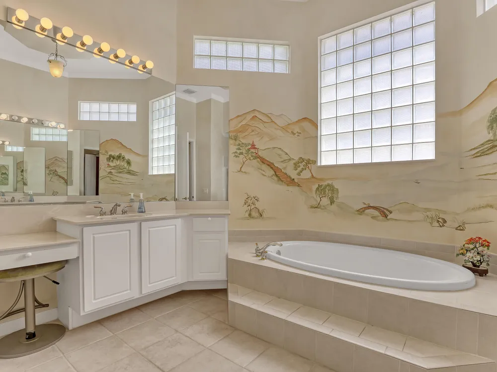 - Entry Level Living Area, Entrance Foyer, Split Bedrooms, High Ceilings, Walk-In Closet(s), Cabana Bath, Family Room, Breakfast Area, Living/Dining Room, Kitchen/Dining Combo, Snack Bar, Blinds, Drapes, Sliding Window(s), Dual Sinks, Primary Downstairs, Sitting Area In Primary Bedroom, Separate Shower, Bathtub, Washer/Dryer Hookup