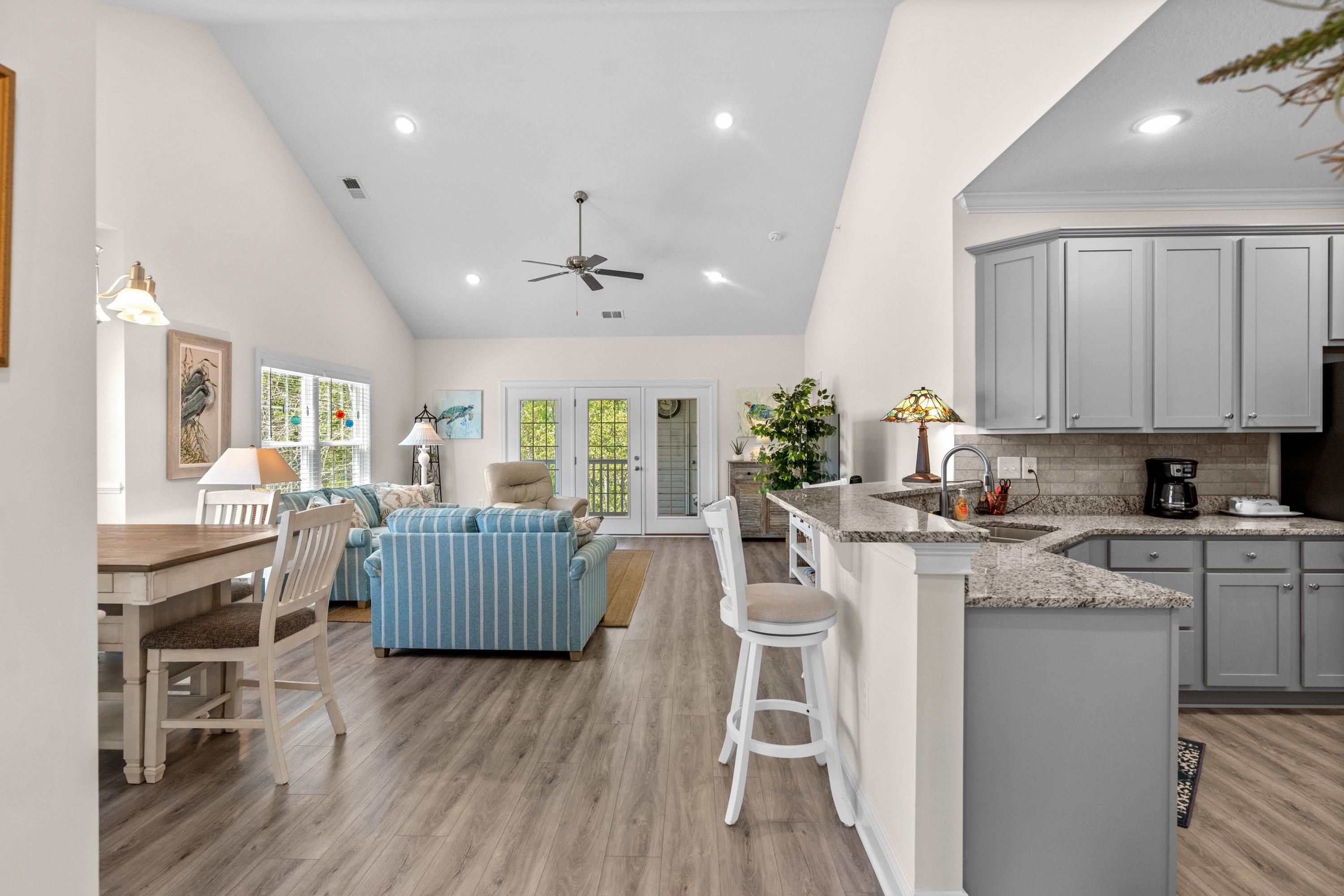 This second floor, single story end unit with open floor plan is well lit, completely furnished and beautifully decorated. The kitchen countertops and tiled backsplash are a gorgeous accent to the gray cabinets. Also included are stainless steel appliances including a gas range and a breakfast bar. The primary bedroom includes a large walk-in closet and an ensuite bathroom with double vanity and a gorgeous, oversized glass enclosed shower. Being a split floor plan, the additional two bedrooms allow for privacy and can also be used as an office or an additional sitting room if you desire. A tankless gas hot water heater is an added bonus, so you never run out of hot water. The screened in porch at the back of the condo is very private and relaxing and includes an owner's storage closet perfect for beach chairs, golf clubs, etc. The property at the back of the condo and to the left of the condo can't be built on which is an added plus for privacy. This condo is conveniently located to the Marshwalk with several restaurants to choose from, shopping, medical facilities and golf. Schedule an appointment today. This beauty won't last long. All measurements and square footage are approximate and are the buyer or buyer's agent's responsibility to verify in addition to HOA information