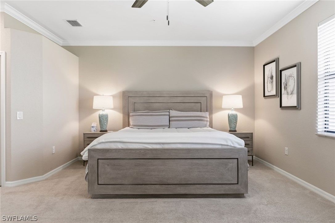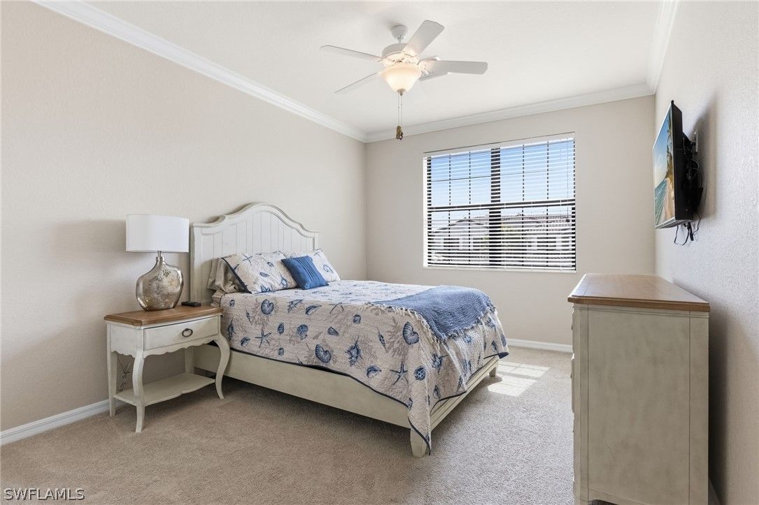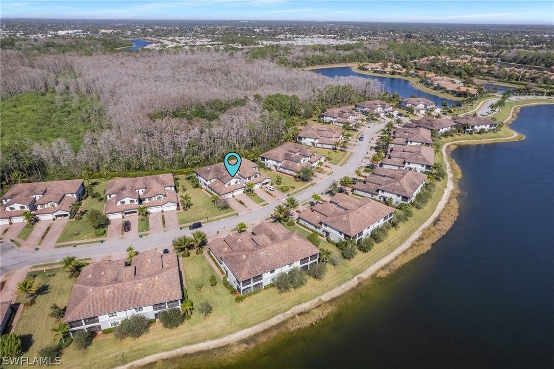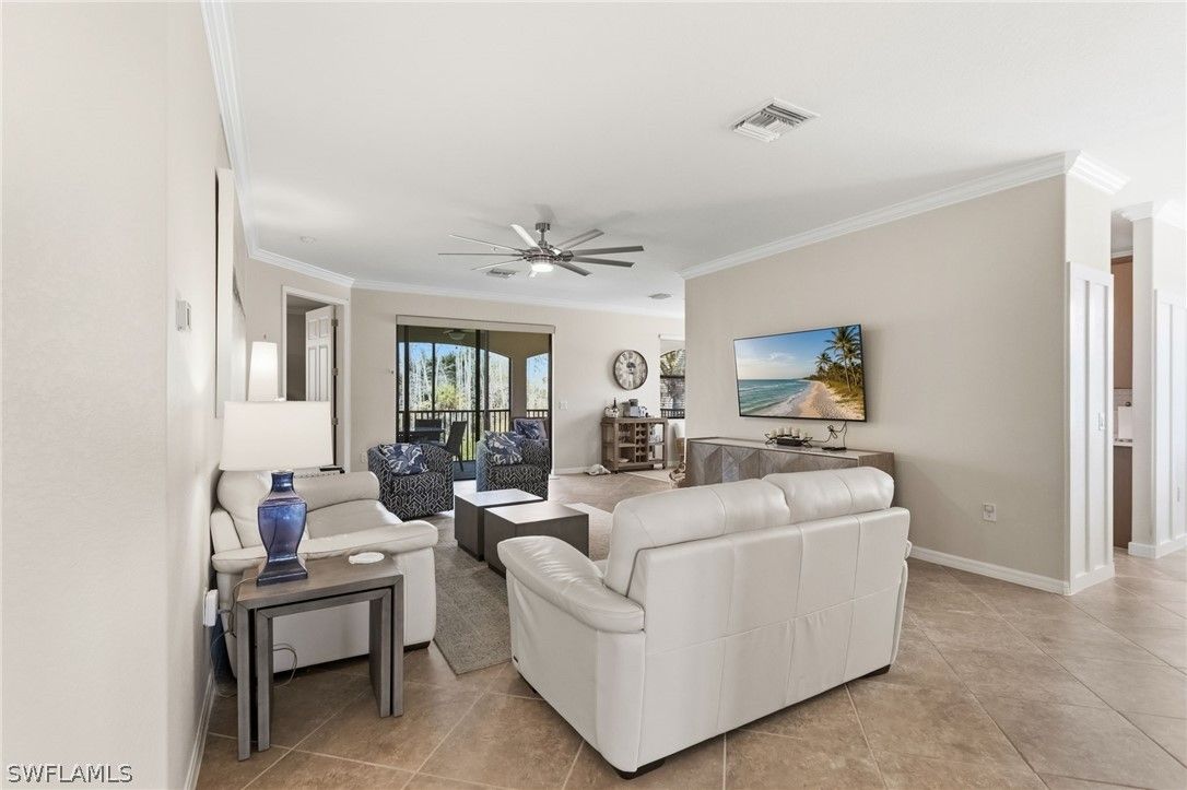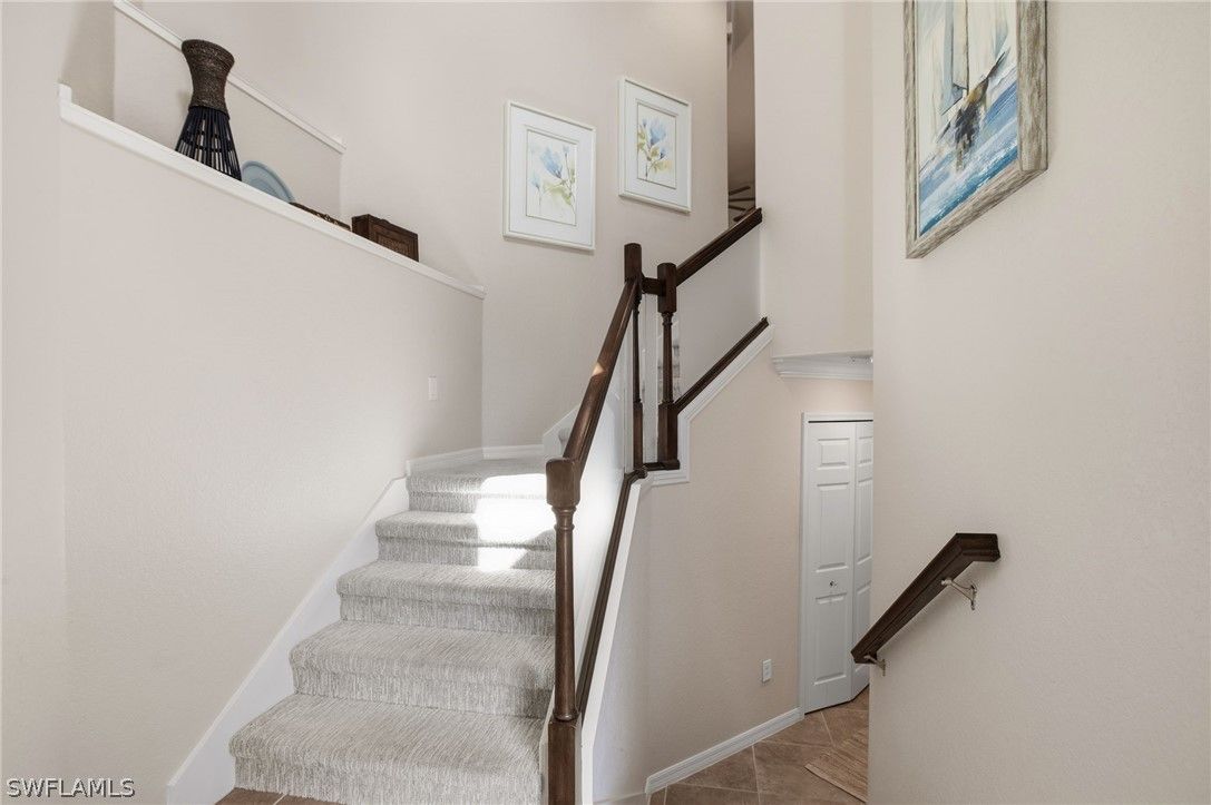 Finally!! A second floor Casoria coach home is now available and it is being sold turnkey furnished. With over 2100 interior square feet, a large screened lanai and the coveted oversized 2 car tandem garage, this unit is move in ready. There is room for 2 cars and your golf cart with room to spare. The new white quartz counter tops in the kitchen and baths modernizes the unit as does the custom millwork in the dining area. The generous open floorplan allows for flexibility for furniture arrangements and seating areas. The volume ceilings on the second floor, the 2 story entrance foyer and first level storage all set these units apart from the ground floor units. Both guest bedrooms are spacious with walk in closets and shared access to the sizable guest bath. The split floorplan offers privacy for the primary suite located at the rear of the unit with it's own pair of walk in closets. Yes, the air conditioning system was replaced 2.5 years ago so rest easy. All windows and doors are impact resistant glass so no shutters needed. Casoria is one of the most sought after sections in Treviso Bay due to its quiet cul de sac location, its walkability to the amenity center and it's quiet preserve and lake borders. Speaking of amenities, Treviso Bay is recognized for is exceptional amenity center including, tennis, pickleball, bocce, basketball, resort and lap pools, spa, fitness center, multiple restaurants and more... This is a rarely available unit and ready for your personal touch.