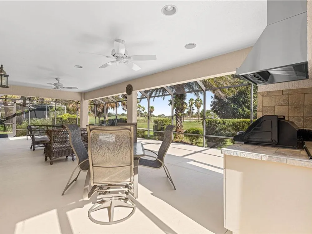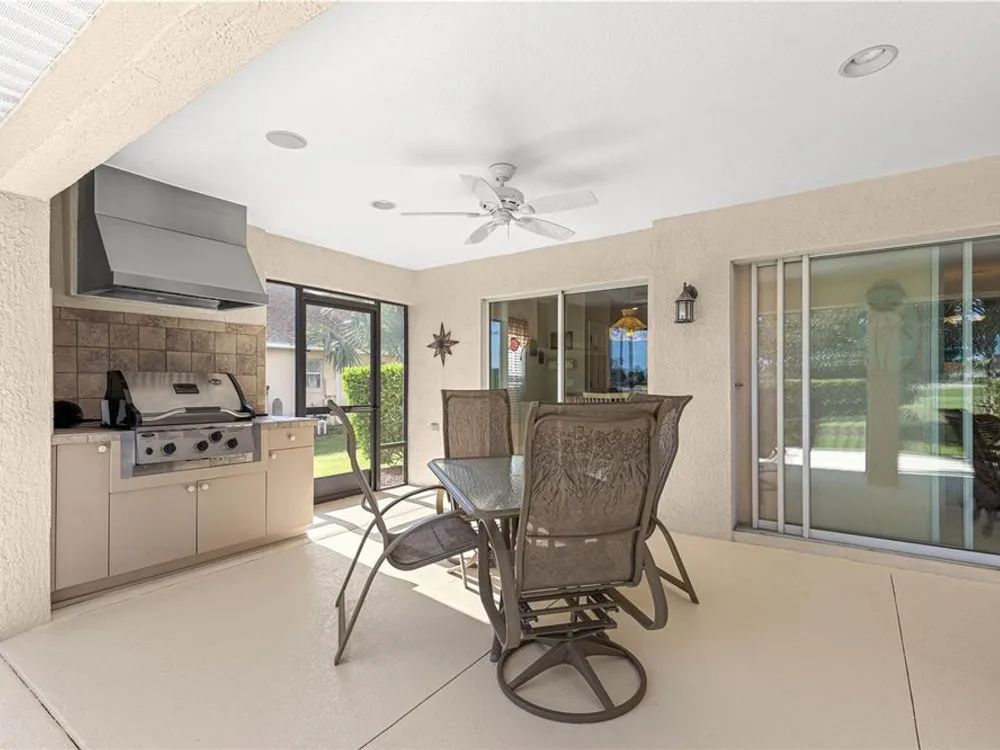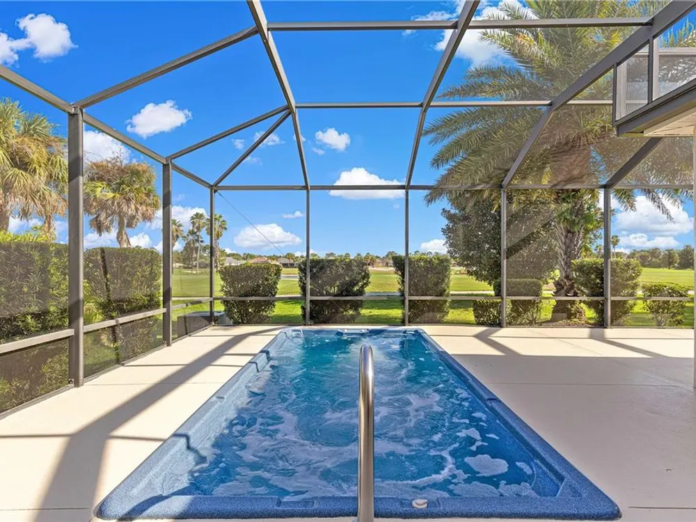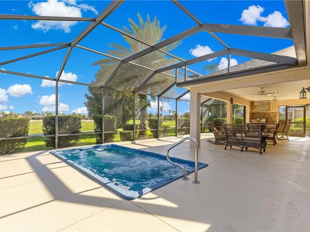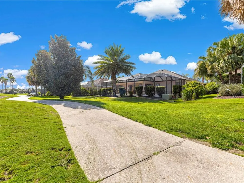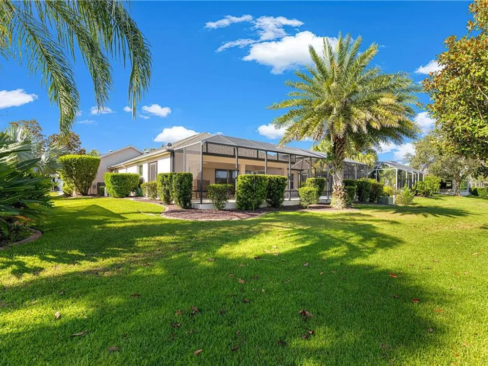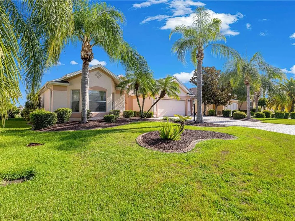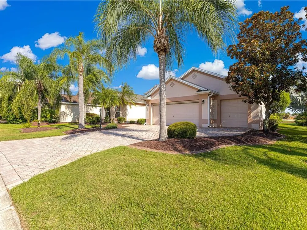 No Bond. This house is located just off of Canal street which gives you a direct short drive to Sumter Landing by golf cart or by car. This gorgeous Lantana was barely lived in and ready for it's new owner. The Bacall Golf Course that is behind this home has just been redone and the first tee box is straight out from your lanai. As you drive up to this beautiful home you will notice the extended garage with extended golf cart garage, upgraded landscaping that is all stone, the gorgeous paver driveway, and the added power screens on the garage doors. As you walk to the front door again you will notice the manicured landscaping and as you enter the front door you will be able to feel the openness of the home and all the great space you have to entertain a great group of friends or family. The very large and open concept allows you to be part of the conversation no matter what area of the great room that you are in. The kitchen is a cooks dream with the brand new quartz counters and the brand new kitchen appliances and the Gas Stove would make any cook want to stay in the kitchen to make that very special dish. The laundry room directly off the kitchen has plenty of space to fold and iron with a built in ironing board and also plenty of storage. The split floor plan allows your guests to have privacy and quietness from the rest of the home. The two full spare bedrooms and full bathroom with upgraded Quartz gives your guests the luxury of feeling like being on vacation with great friends. As you enter the master bedroom you will notice the large space for all of your furniture in addition to the walk in closet. The master bathroom has the quartz upgrade a beautiful walk in shower and a great bathtub for soaking and forgetting about your troubles. The Lanai has been extended freshly painted, an outdoor Kitchen added, and a lovely swim spa for watching the best sun set in The Villages. The roof was replaced 8/2025 The A/C was replaced 2019 and the Hot water heater was replaced 2018. Don't wait houses like this go fast. Call today for a private showing