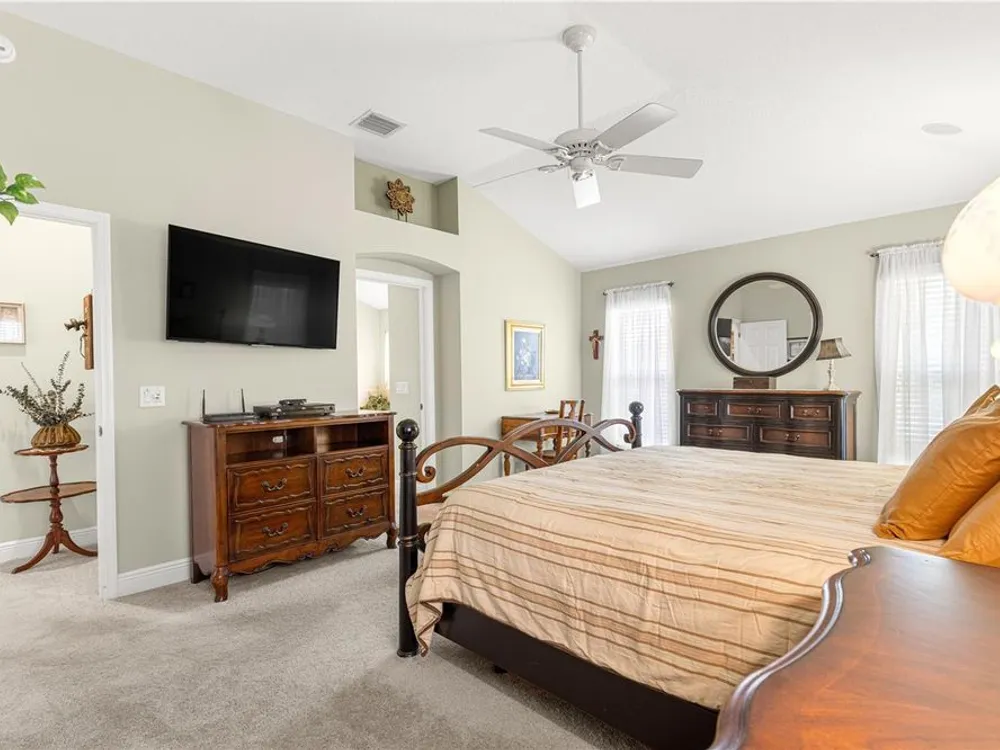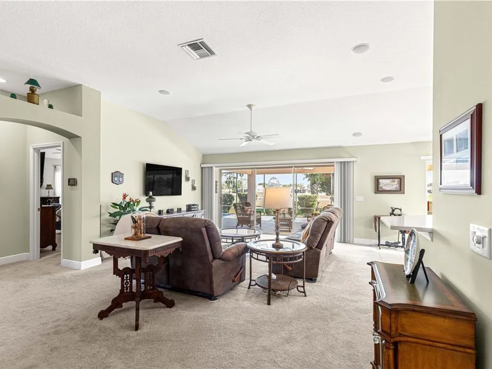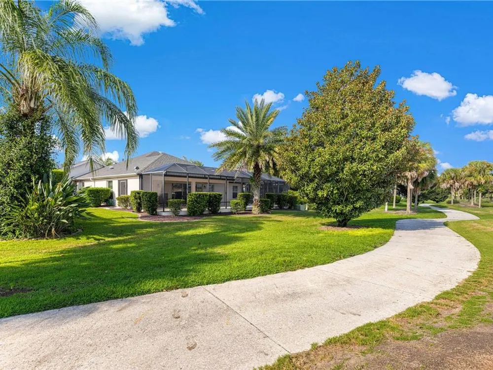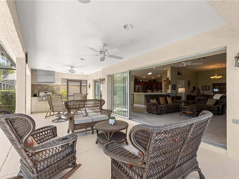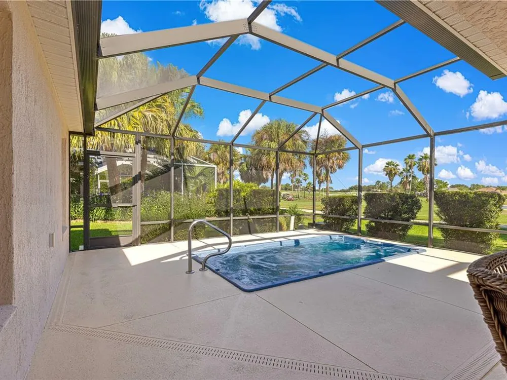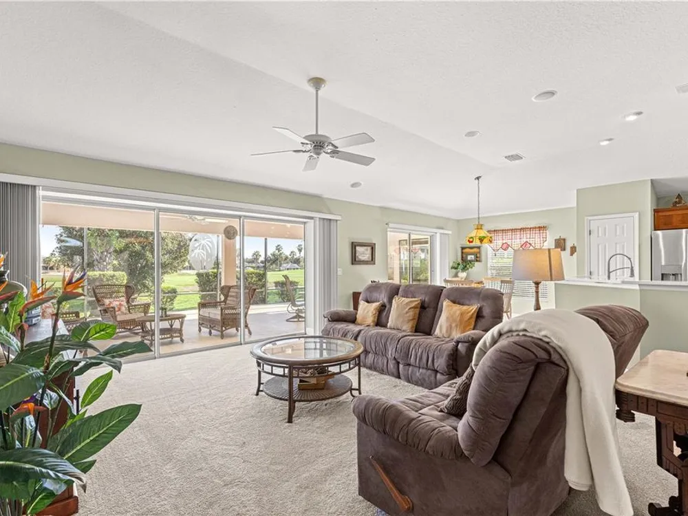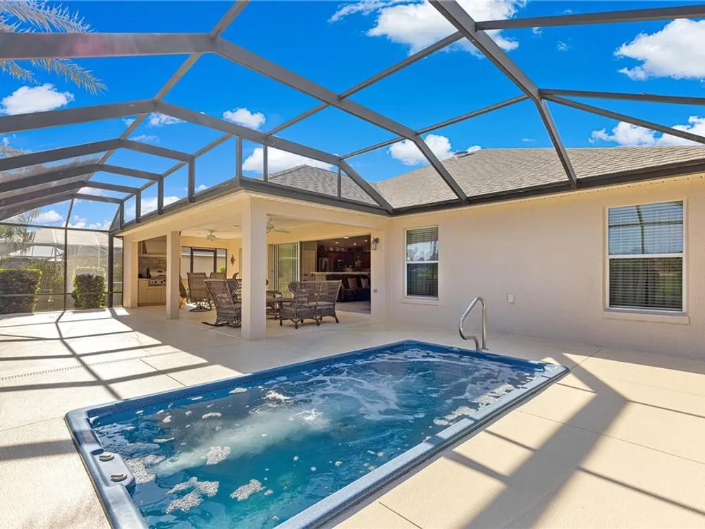 No Bond. This house is located just off of Canal street which gives you a direct short drive to Sumter Landing by golf cart or by car. This gorgeous Lantana was barely lived in and ready for it's new owner. The Bacall Golf Course that is behind this home has just been redone and the first tee box is straight out from your lanai. As you drive up to this beautiful home you will notice the extended garage with extended golf cart garage, upgraded landscaping that is all stone, the gorgeous paver driveway, and the added power screens on the garage doors. As you walk to the front door again you will notice the manicured landscaping and as you enter the front door you will be able to feel the openness of the home and all the great space you have to entertain a great group of friends or family. The very large and open concept allows you to be part of the conversation no matter what area of the great room that you are in. The kitchen is a cooks dream with the brand new quartz counters and the brand new kitchen appliances and the Gas Stove would make any cook want to stay in the kitchen to make that very special dish. The laundry room directly off the kitchen has plenty of space to fold and iron with a built in ironing board and also plenty of storage. The split floor plan allows your guests to have privacy and quietness from the rest of the home. The two full spare bedrooms and full bathroom with upgraded Quartz gives your guests the luxury of feeling like being on vacation with great friends. As you enter the master bedroom you will notice the large space for all of your furniture in addition to the walk in closet. The master bathroom has the quartz upgrade a beautiful walk in shower and a great bathtub for soaking and forgetting about your troubles. The Lanai has been extended freshly painted, an outdoor Kitchen added, and a lovely swim spa for watching the best sun set in The Villages. The roof was replaced 8/2025 The A/C was replaced 2019 and the Hot water heater was replaced 2018. Don't wait houses like this go fast. Call today for a private showing