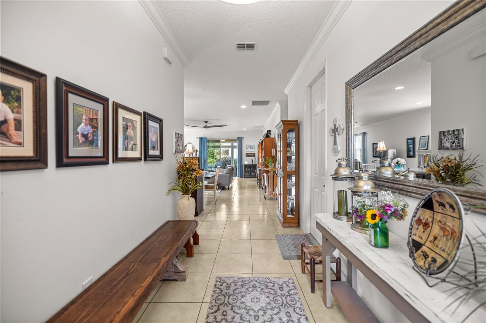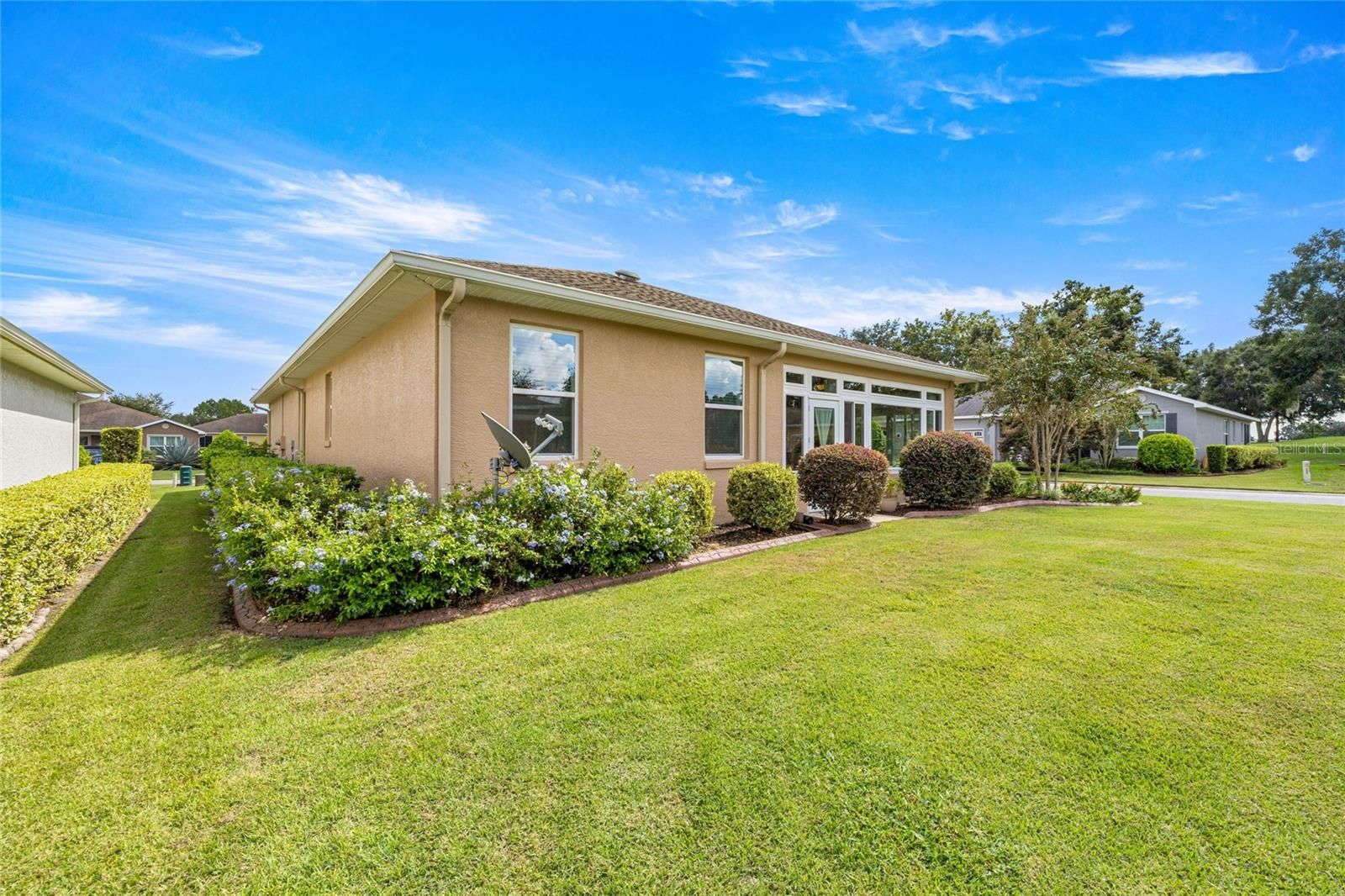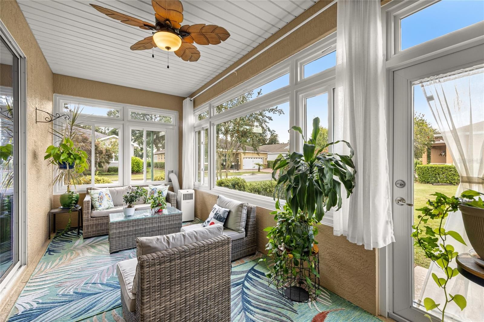 MAINTENANCE FREE LIVING. Immaculate like new Kent Model in premier 55+ community with a gorgeous sunroom oasis tucked away in On Top Of The World’s Windsor West community. Located on a peaceful cul-de-sac on a nice corner lot. Just minutes to the Arbors Activity center which includes the indoor pool, an outdoor pool, fitness center, and so much more. Come explore this premier 55+ active adult community with golf cart access to 3 shopping centers. Pristine and well maintained 2-bedroom, 2-bathroom home with a 2-car garage offers stylish comfort, modern updates, and low-maintenance living. Step inside to find a spacious open floor plan filled with natural light and upgrades throughout. A spacious and welcoming foyer, 9'4" ceilings, crown molding throughout the living areas. The gourmet kitchen features oversized granite countertops, dual sink, gas stove, glass tile backsplash, a breakfast nook, cherry wood cabinets with crown molding, stainless steel appliances, a pantry, and a breakfast bar perfect for casual dining or entertaining. The adjoining dining area and living room flow seamlessly together, making everyday living feel relaxed and connected. The primary suite features a generous walk-in closet, double vanity with quartz counters, walk-in shower, and a convenient linen closet. A comfortable guest bedroom and full guest bath with a tub/shower combo offers versatility for visitors or a home office. You’ll love spending time year-round in the sun-drenched enclosed sunroom with A/C unit, surrounded by windows and lush views of the backyard — a perfect spot to unwind with your morning coffee or a good book. Additional highlights include newly grouted tile throughout living areas, new carpet in both bedrooms, laundry closet with custom built-in storage, water filtration system, & whole-home surge protection. Enjoy the resort-style amenities this active community features including pools, fitness centers, tennis, pickle ball, ball fields, 3 golf courses, social clubs, restaurants, RV Storage, education center, service organizations, walking trails, Dog park, and more. Windsor West includes exterior maintenance, lawn care, mowing, fertilizing and trimming. This move-in-ready gem blends functionality, comfort, and community — don’t miss your chance to live the lifestyle you deserve!