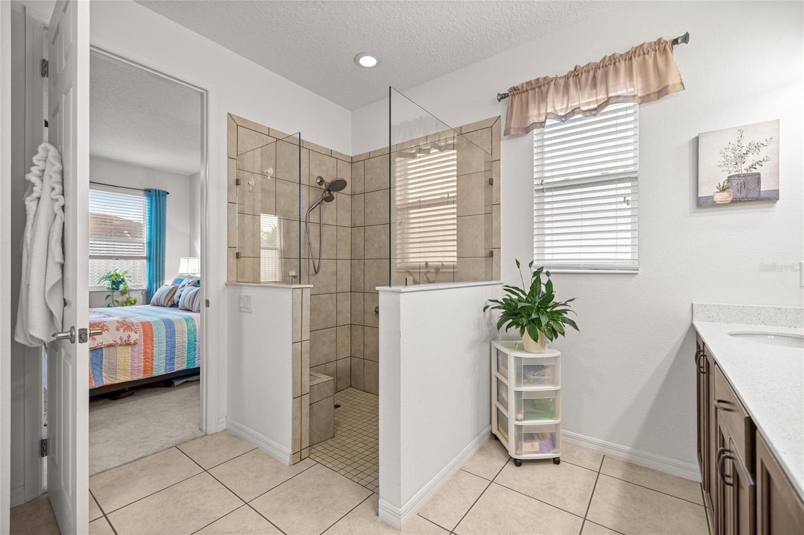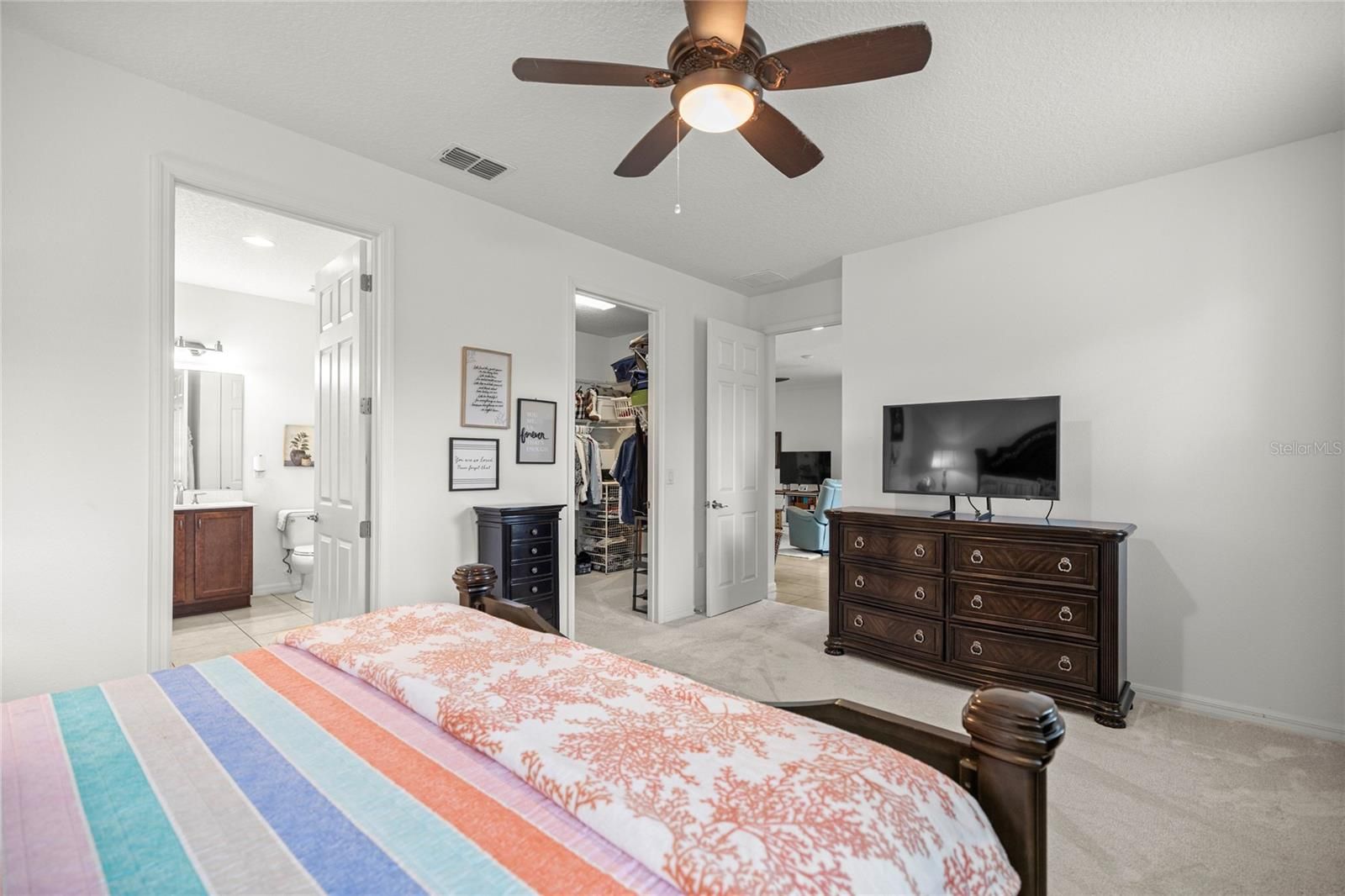 - Ceiling Fan(s), Eat-in Kitchen, High Ceilings, Open Floorplan, Main Level Primary, Solid-Wood Cabinets, Thermostat, Walk-In Closet(s), Window Treatments