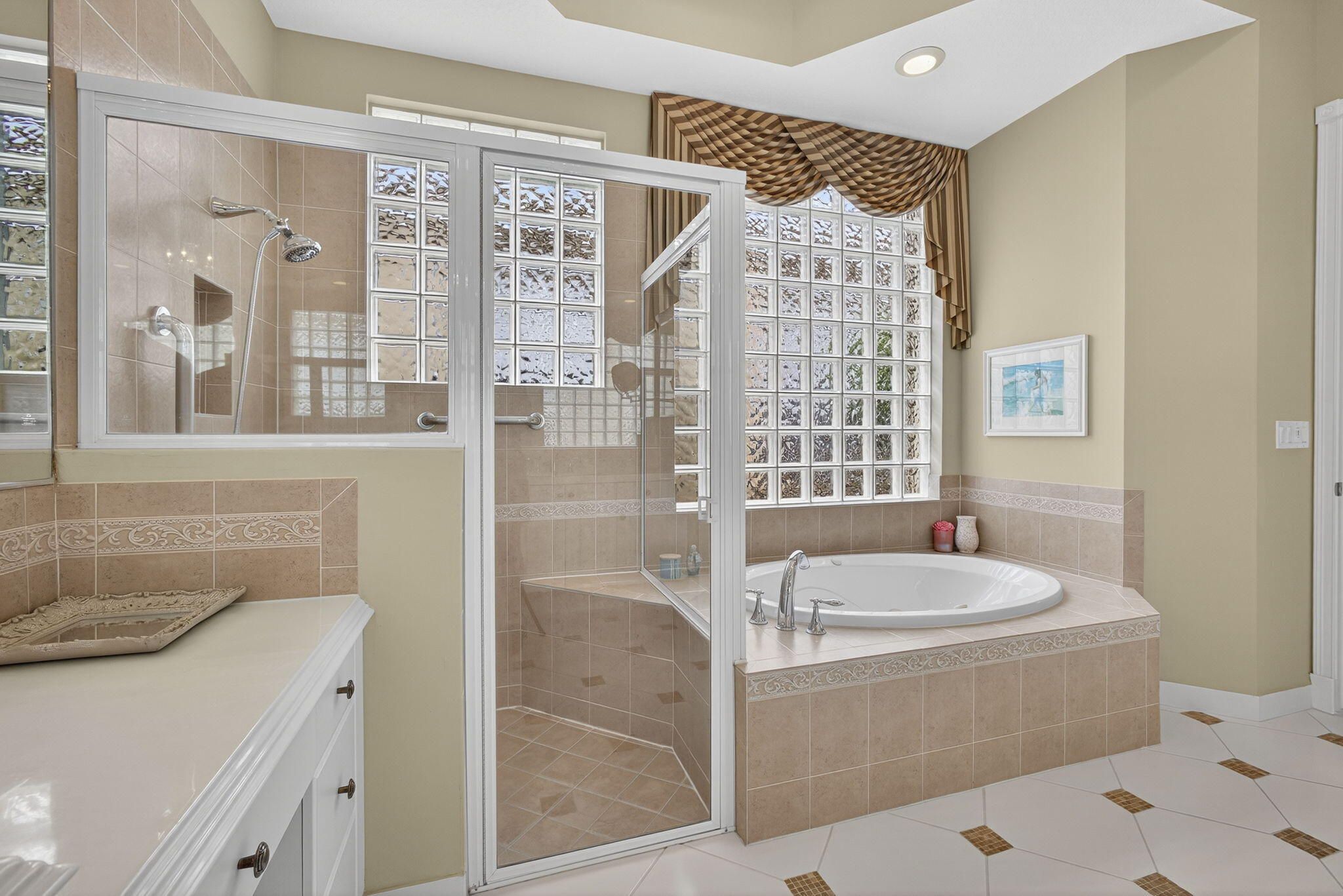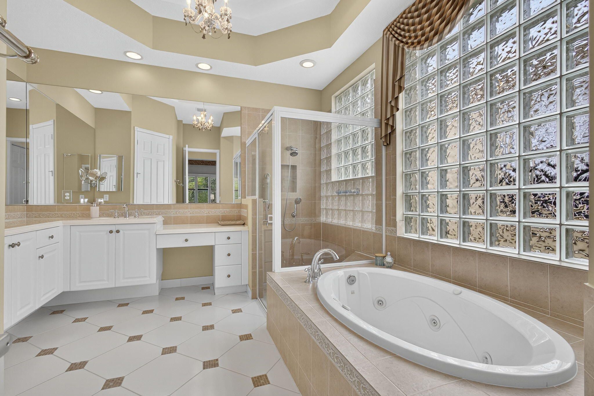 - Entrance Foyer, High Ceilings, Walk-In Closet(s), Split Bedrooms, Closet Cabinetry, Custom Mirrors, Garden Tub/Roman Tub, Breakfast Area, Separate/Formal Dining Room, Snack Bar, Dual Sinks, Main Level Primary, Separate Shower, Soaking Tub