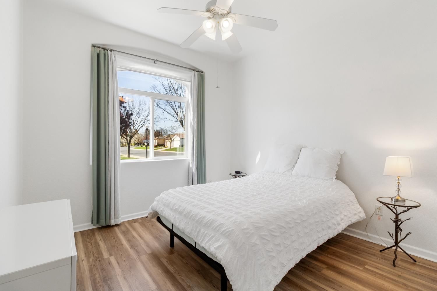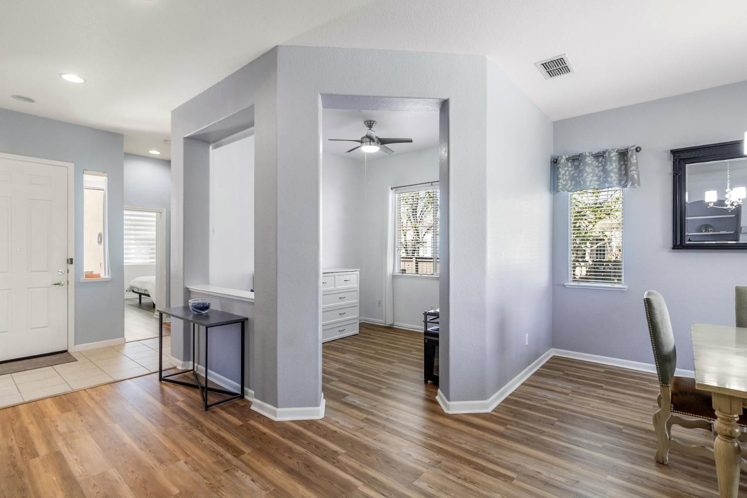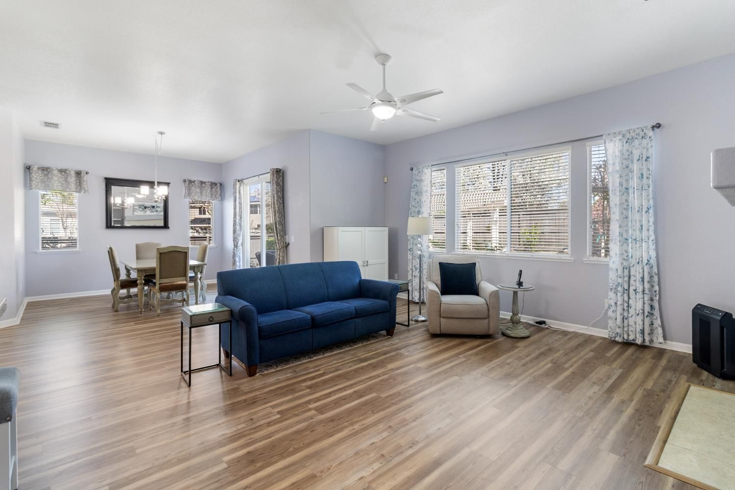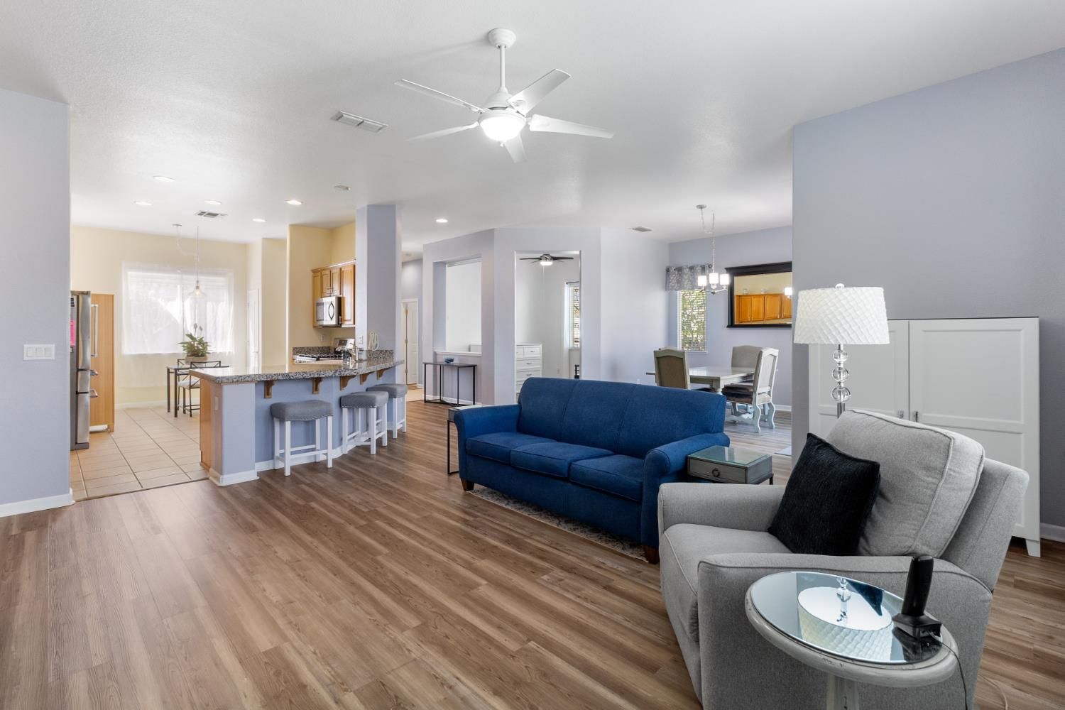 Welcome to this single story corner lot home in the sought after 55+ Heritage Lakeside Community, offering 2/3 bedrooms and 2 full bathrooms. Fresh interior paint and laminate flooring throughout. The kitchen features granite countertops, oak cabinetry, and stainless steel appliances. The primary suite includes barn doors and added shelving, and both bathrooms offer updated finishes. The low maintenance backyard includes a pergola and sprinkler system. Additional features include LED lighting, upgraded fans, upgraded fixtures, a water softener, water heater with recirculating pump, and an updated HVAC system. The garage has been enhanced with a new door, springs, bearings, built-in shelving, and an alarm system. Community amenities include a clubhouse, fitness center, pool, spa, sports courts, and lake access.
